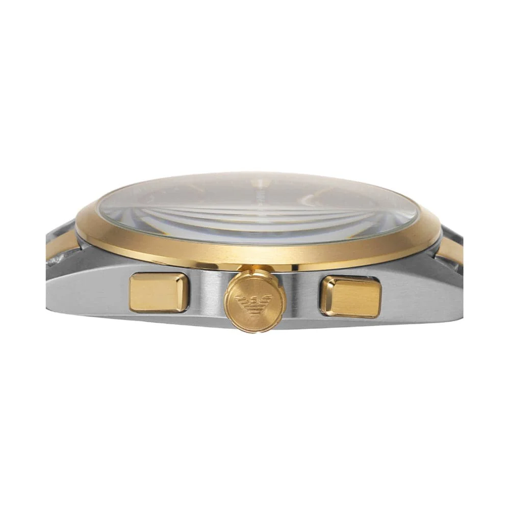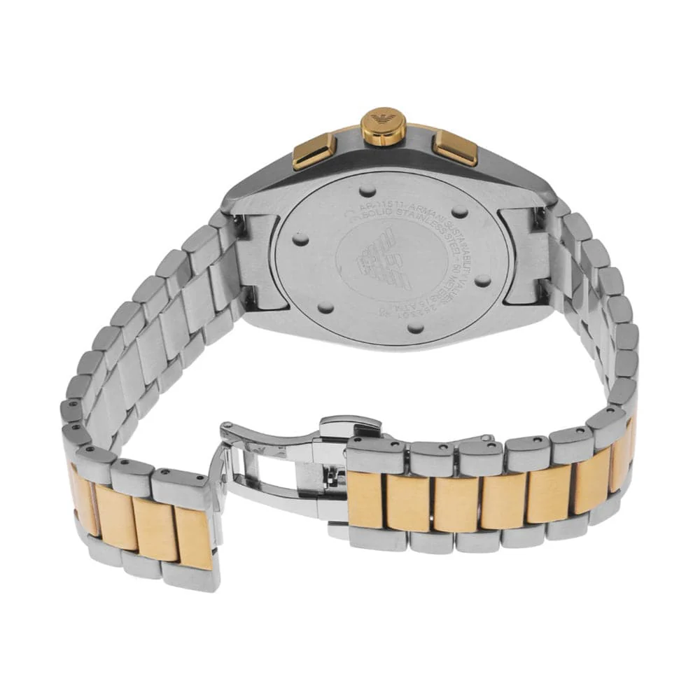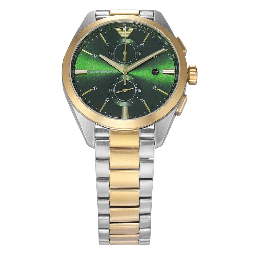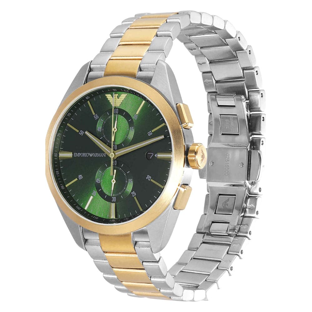 Lending a contemporary twist to an elegant design, this men’s analog watch from Emporio Armani is a must-have wrist essential. The green round dial is protected by a mineral glass. The stainless steel strap comes in a two tone hue that further elevates the look of the timekeeper. Besides, it is completed with a fold-over push button clasp with safety clasp to ensure a secure fit on the wrist.
