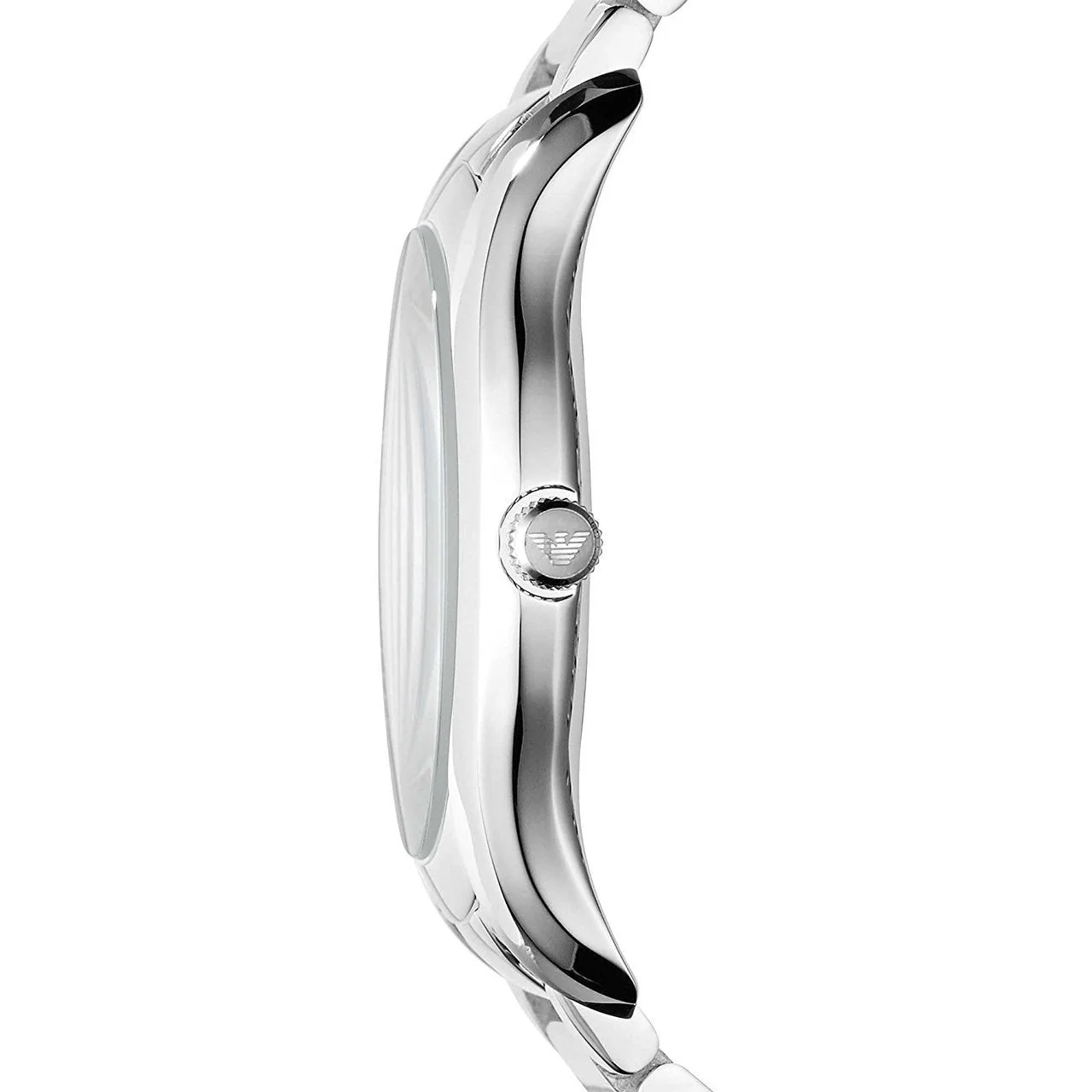 Measuring a mere 1 centimeter in case thickness, this watch maintains a slim profile that subtly complements both formal and casual attire. Within its sleek case lies the reliable quartz movement, a hallmark of Emporio Armani, ensuring timekeeping with unparalleled precision. The dial, a harmonious shade of silver, is both understated and captivating, reflecting the timeless elegance that is unmistakably Armani.