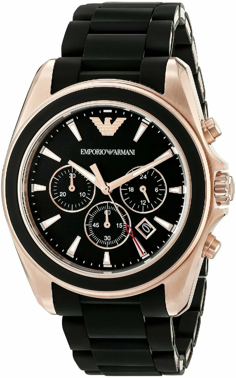 Immerse yourself in the refined world of elegance and functionality with the Emporio Armani Sportivo Black Dial Chronograph Men’s Watch. This captivating timepiece seamlessly blends sophistication with practicality, making it an essential accessory for the modern gentleman. The watch features a striking black dial, accentuated by rose gold-tone hands and index hour markers that exude a subtle yet powerful allure. Its analog design ensures timeless appeal, while the meticulous date display strategically placed between the 4 and 5 o’clock positions adds a touch of convenience to your daily routine.