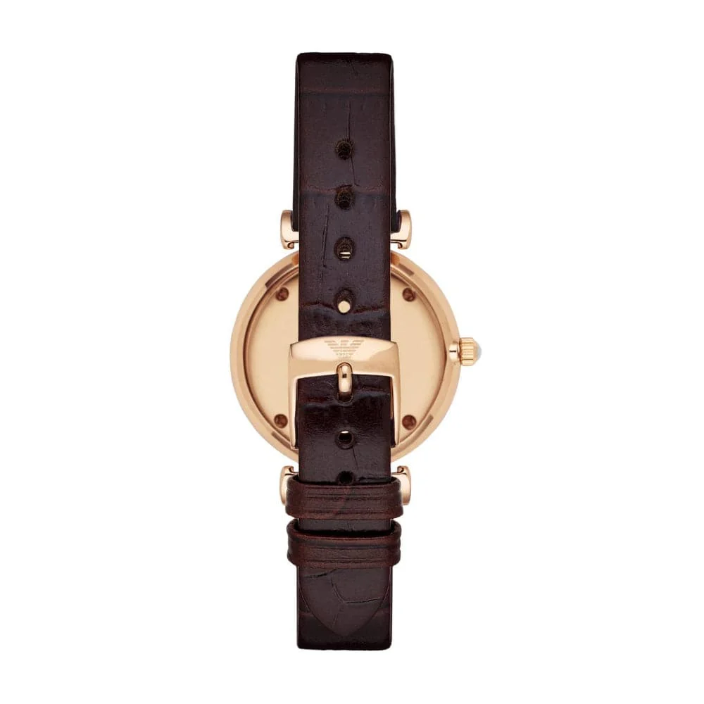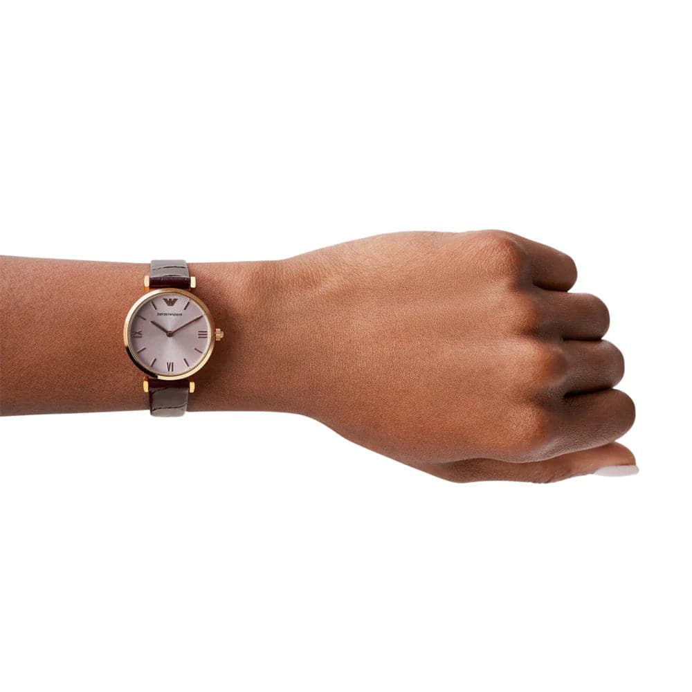 Add a touch of sophistication to your attire by sporting this classic Emporio Armani AR1911 pink Analog Watch. Designed with a plain 2-hand functionality with quartz movement, this watch is sturdy and precise. It features a genuine leather strap to ensure a secure fit.