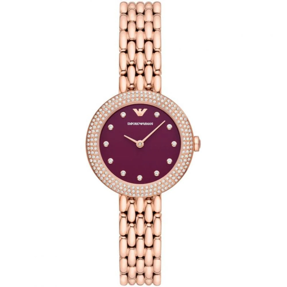 Emporio Armani women’s time only watch. Watch with 30 mm case made of minimum 50% recycled stainless steel with rose gold satin finish. The case is round in shape with a thickness of 7 mm. The glass is transparent and the dial is red. The distance between the lugs is 12 mm. Water resistance is 3 atm. Watch with crystals on case and dial. The strap is made of at least 50% recycled stainless steel with a polished rose gold finish. Strap with deployant clasp.