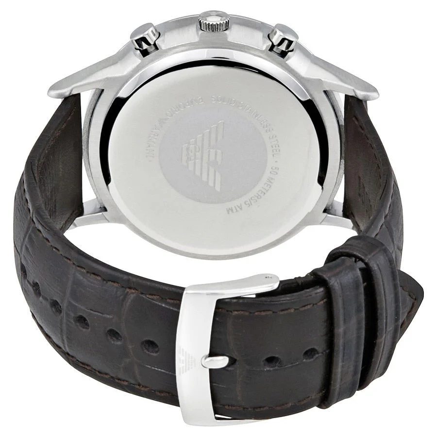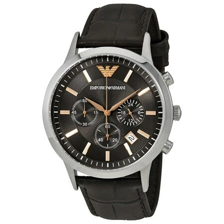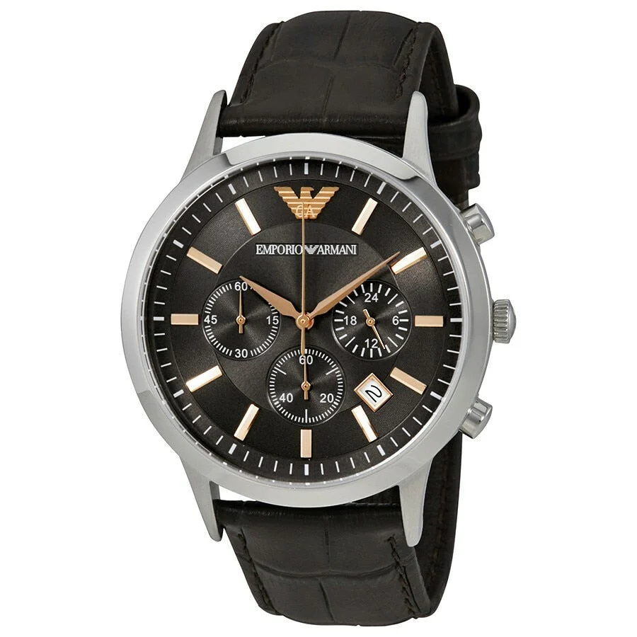 Step into the world of timeless elegance with the Emporio Armani Renato Grey Dial Chronograph Men’s Watch. This masterpiece of craftsmanship boasts a robust stainless steel case paired with a sophisticated dark brown leather strap, creating a harmonious blend of strength and style. The watch’s design is an ode to luxury, with its fixed bezel framing a captivating grey dial. The rose gold-tone hands and index hour markers offer a touch of luxurious contrast, bringing attention to the exquisite detail invested in this timepiece.
