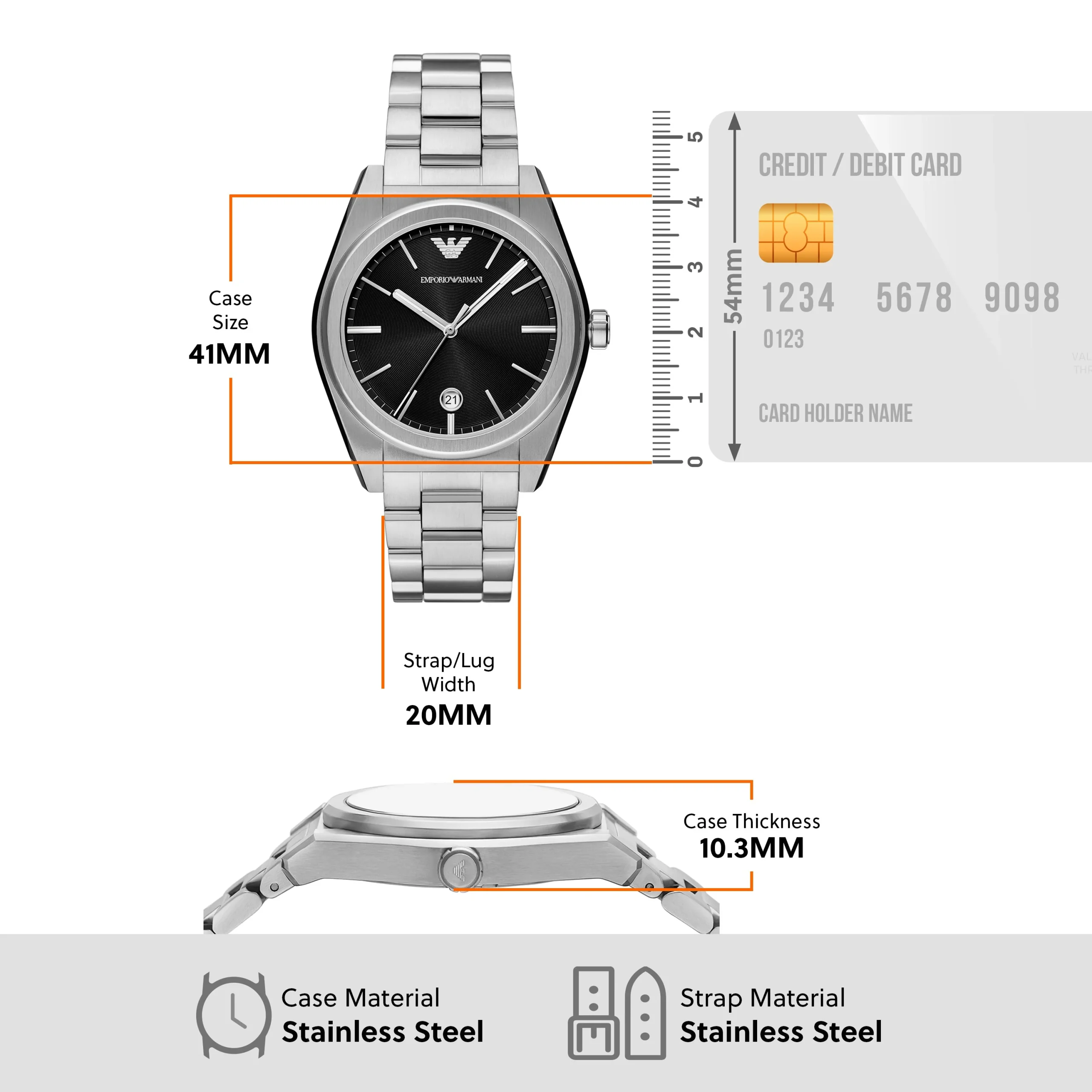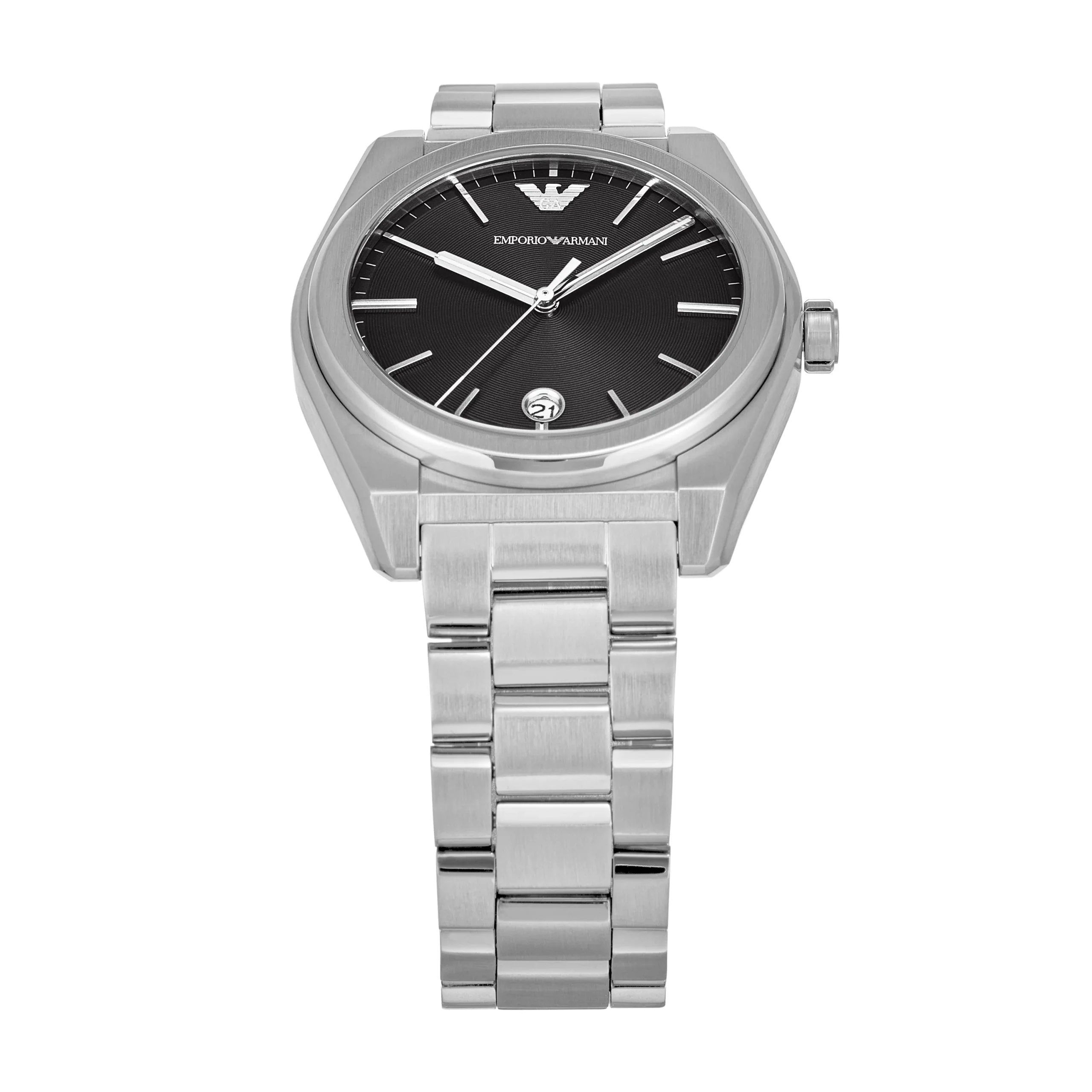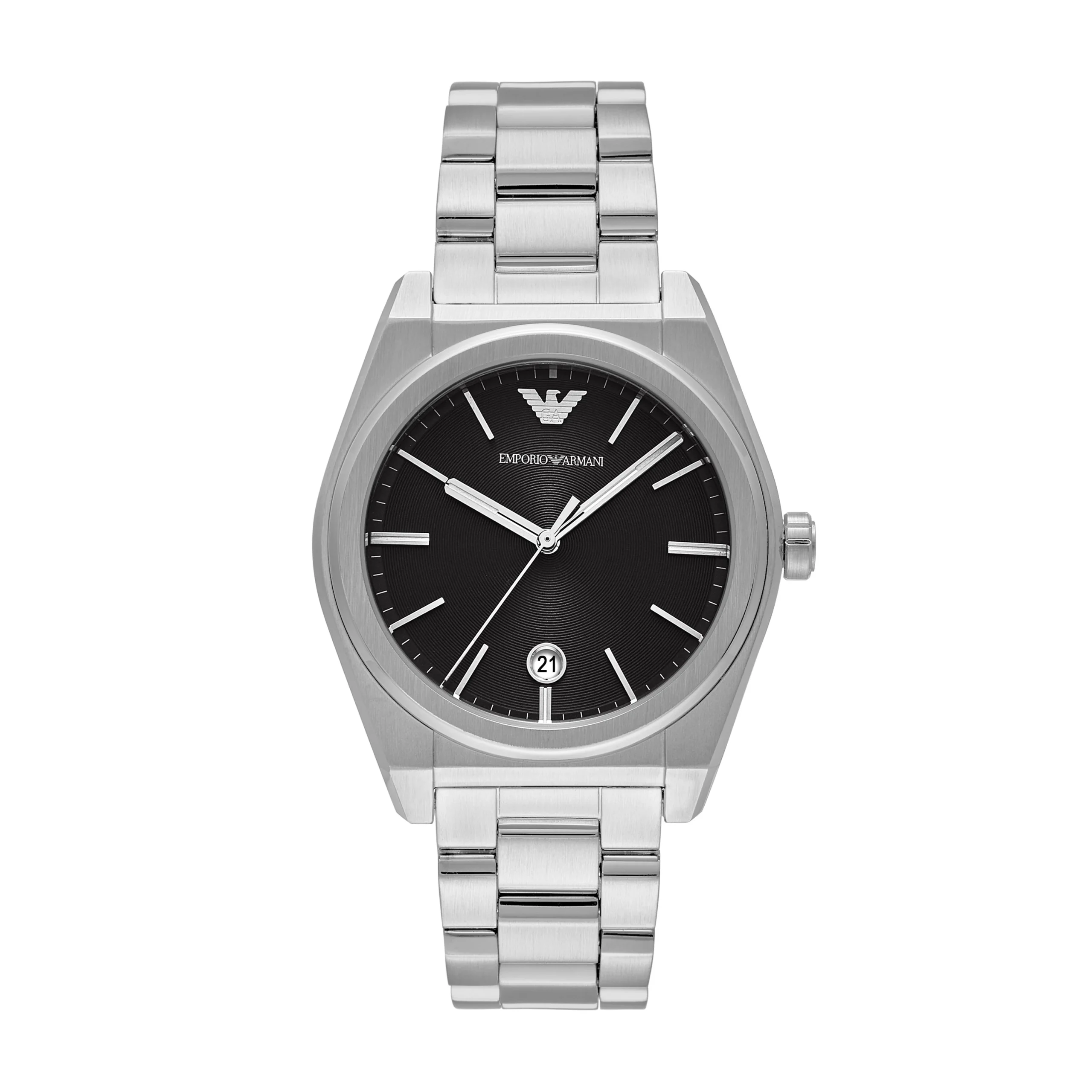 Refined and contemporary, the Emporio Armani AR11622 men’s watch captures timeless style through a bold black sunray dial set against a 41mm stainless steel case. Its sleek three-hand quartz movement with date display ensures precise timekeeping, while the silver stainless steel bracelet offers both durability and a polished finish. Designed with mineral crystal glass and water resistance up to 50 meters, it’s built for both sophistication and everyday wear. This watch stands out in the luxury watches category with its clean aesthetic, reliable functionality, and signature Armani craftsmanship—an ideal piece for the modern gentleman who values understated elegance and performance.