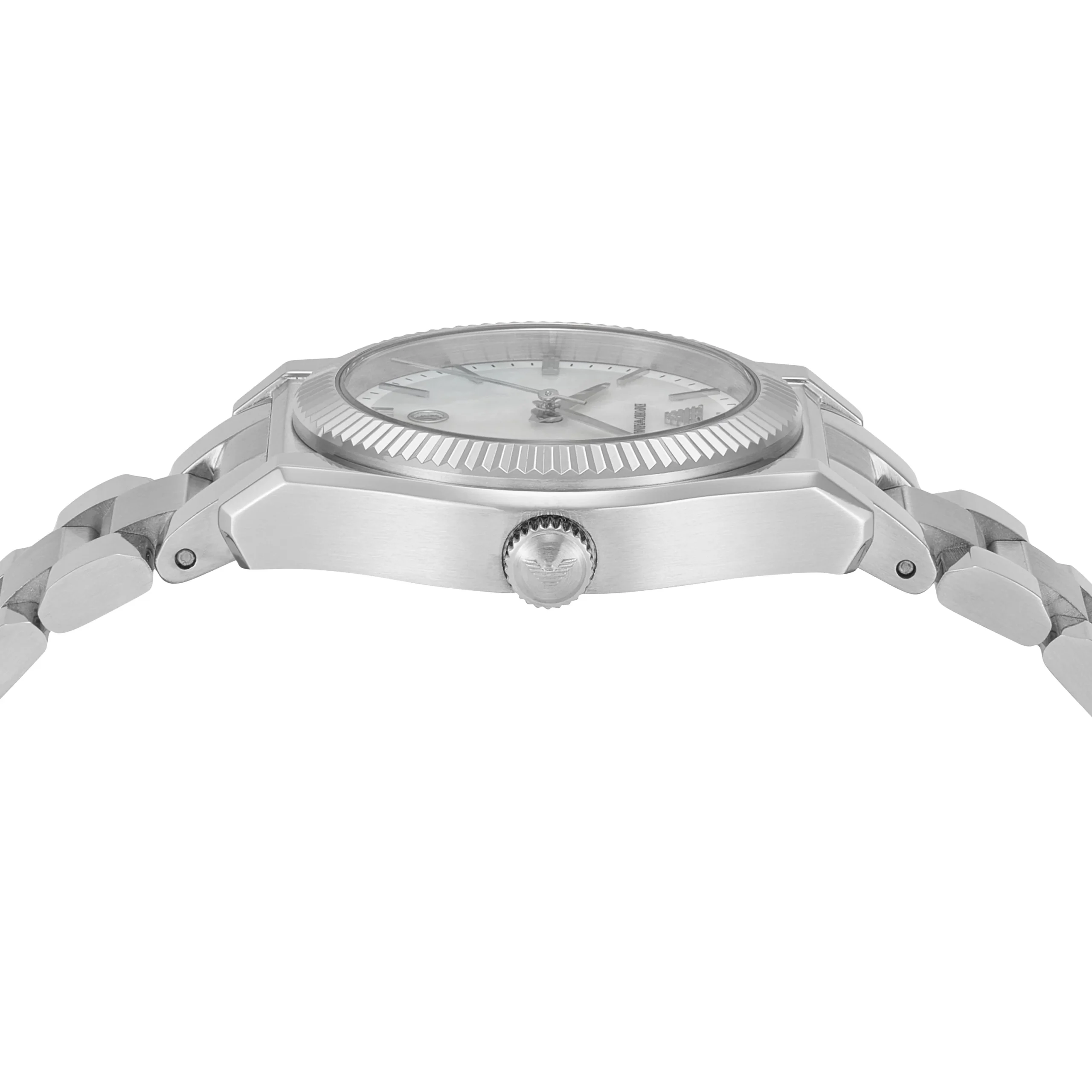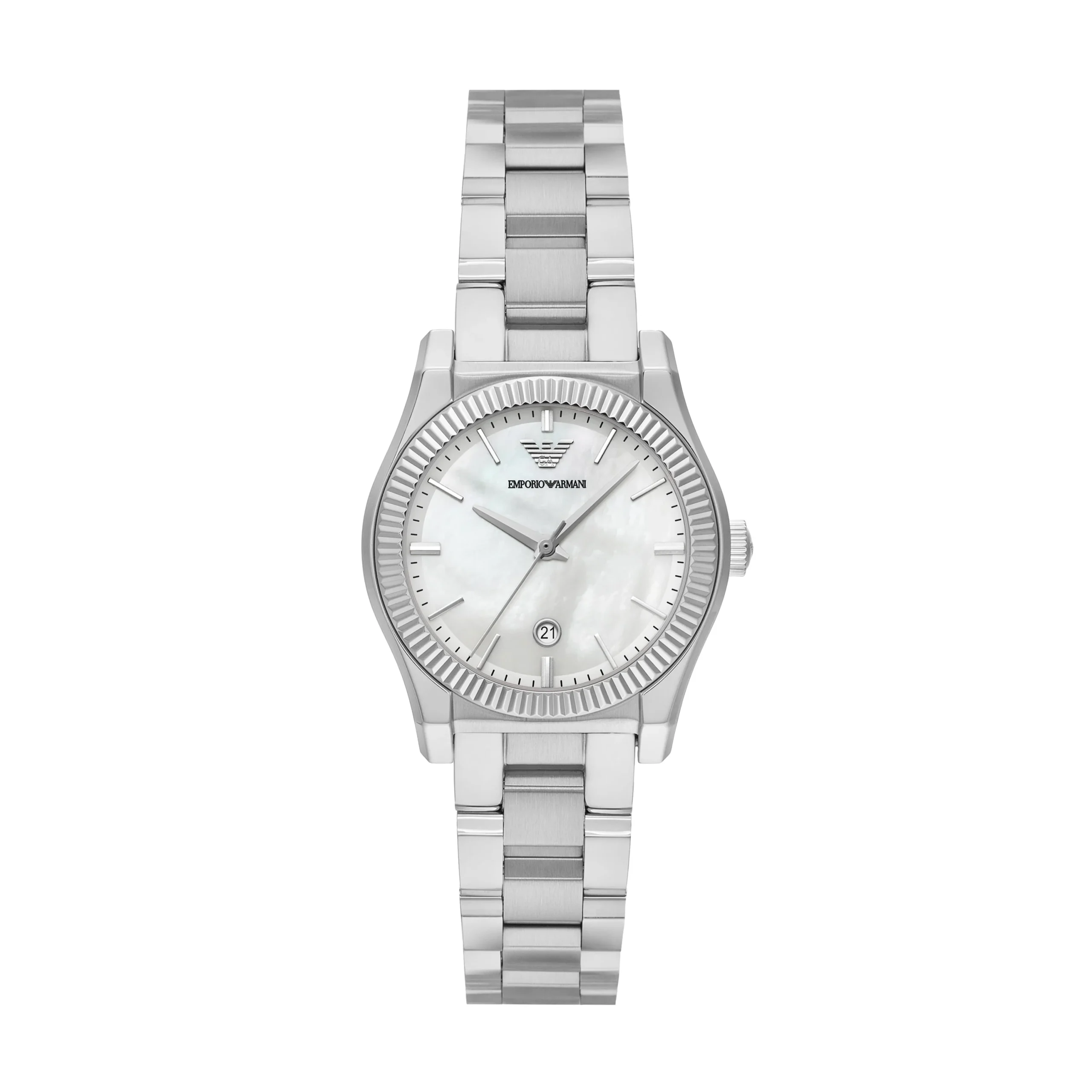 Emporio Armani’s 32MM watch features a white mother-of-pearl dial, three-hand date movement, and a stainless steel bracelet. The fluted stainless steel bezel adds an element of visual intrigue, making the perfect complement to the structured watch case and bracelet.