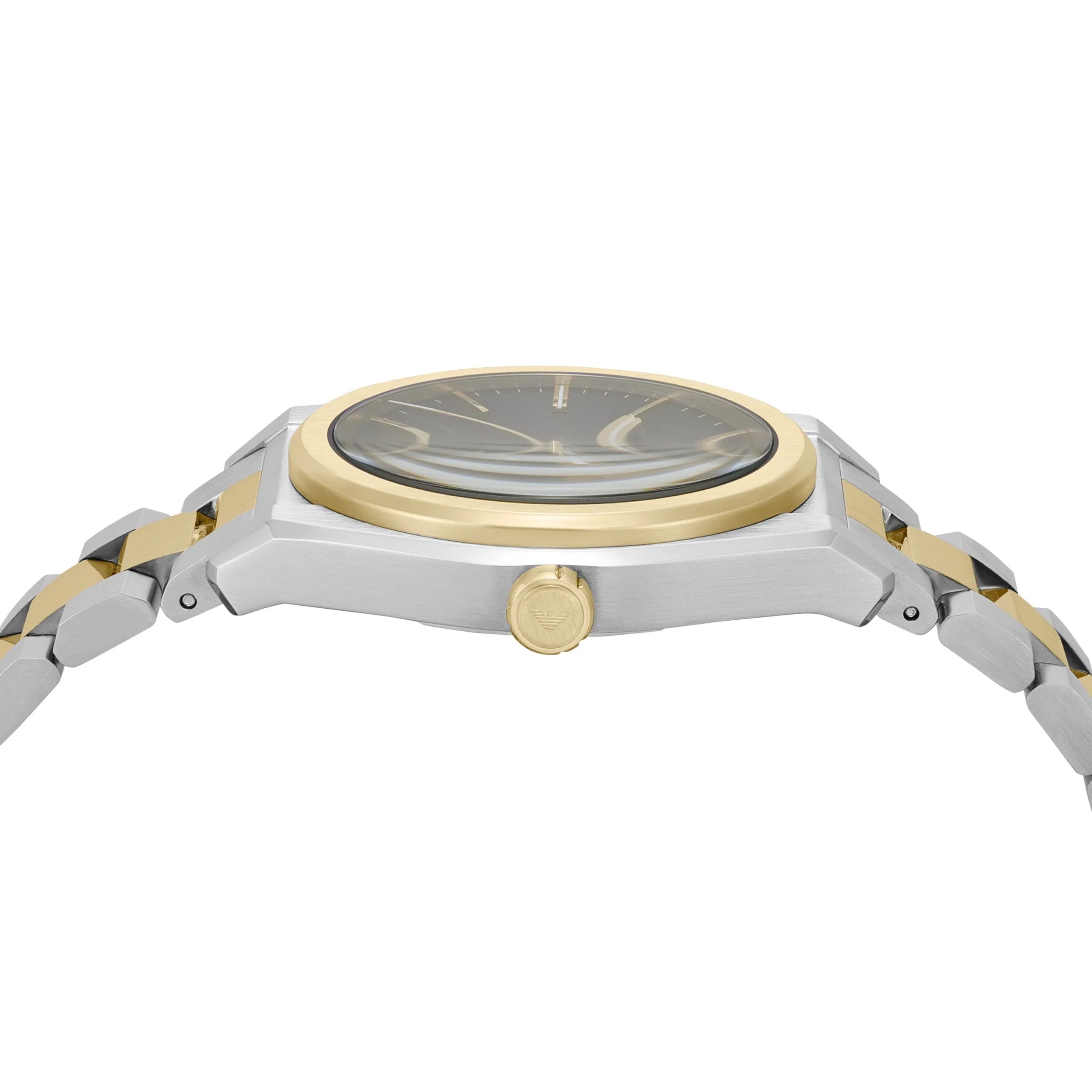Emporio Armani’s AR11715 blends Italian design sophistication with practical timekeeping. This men’s watch features a two-tone stainless steel case and bracelet, where gold-tone centres meet silver-brushed outer links for versatile elegance, powered by a precise three-hand quartz movement. The black dial, with a sunray finish and slim gold-tone markers, is framed by a gold-tone bezel and a matching crown. Sized for a balanced look with a 4.1 cm case diameter, the watch offers durable craftsmanship, mineral crystal protection, and 50 metres water resistance, making it suitable from boardroom to after-hours. From Armani, a symbol of refined luxury, this timepiece elevates any collection.