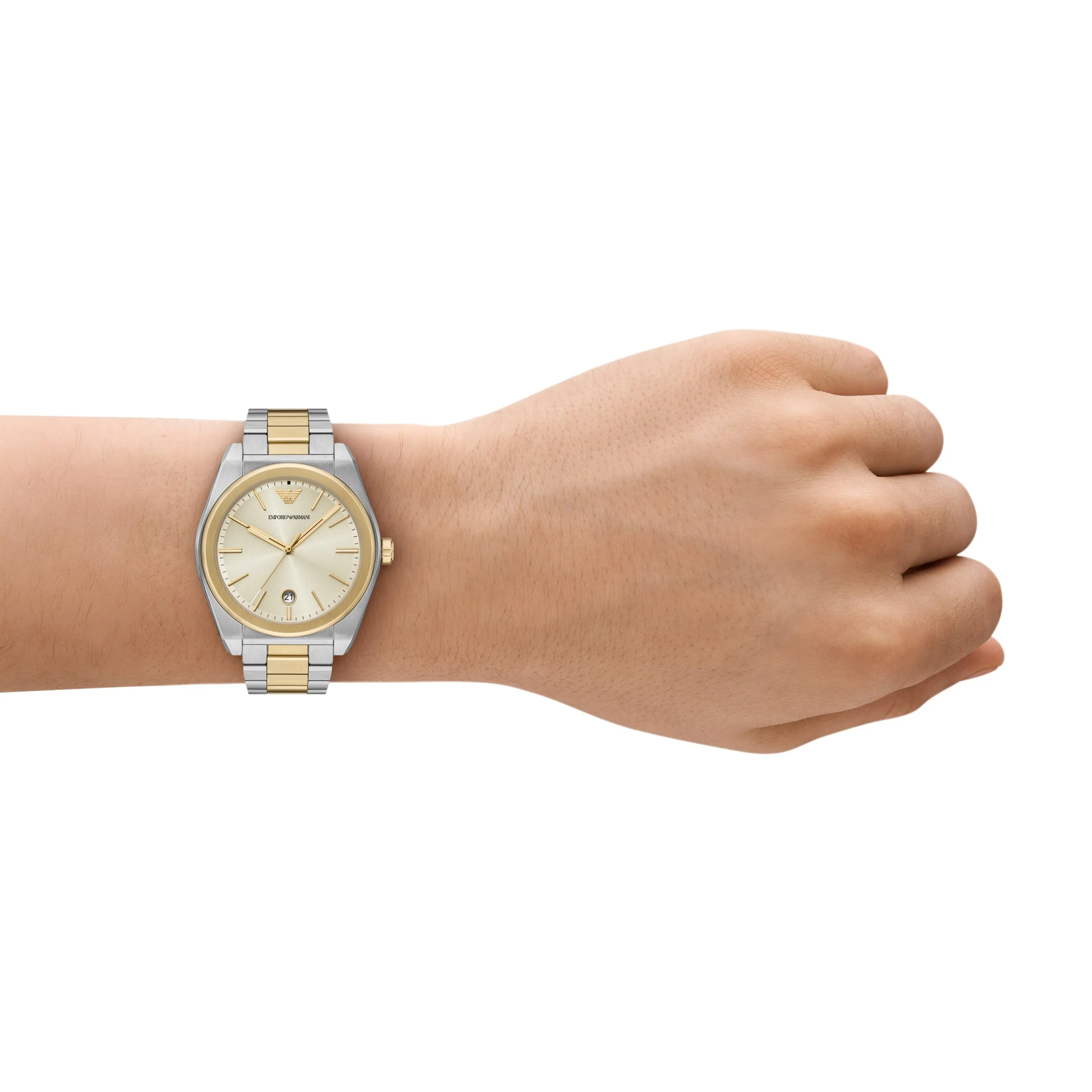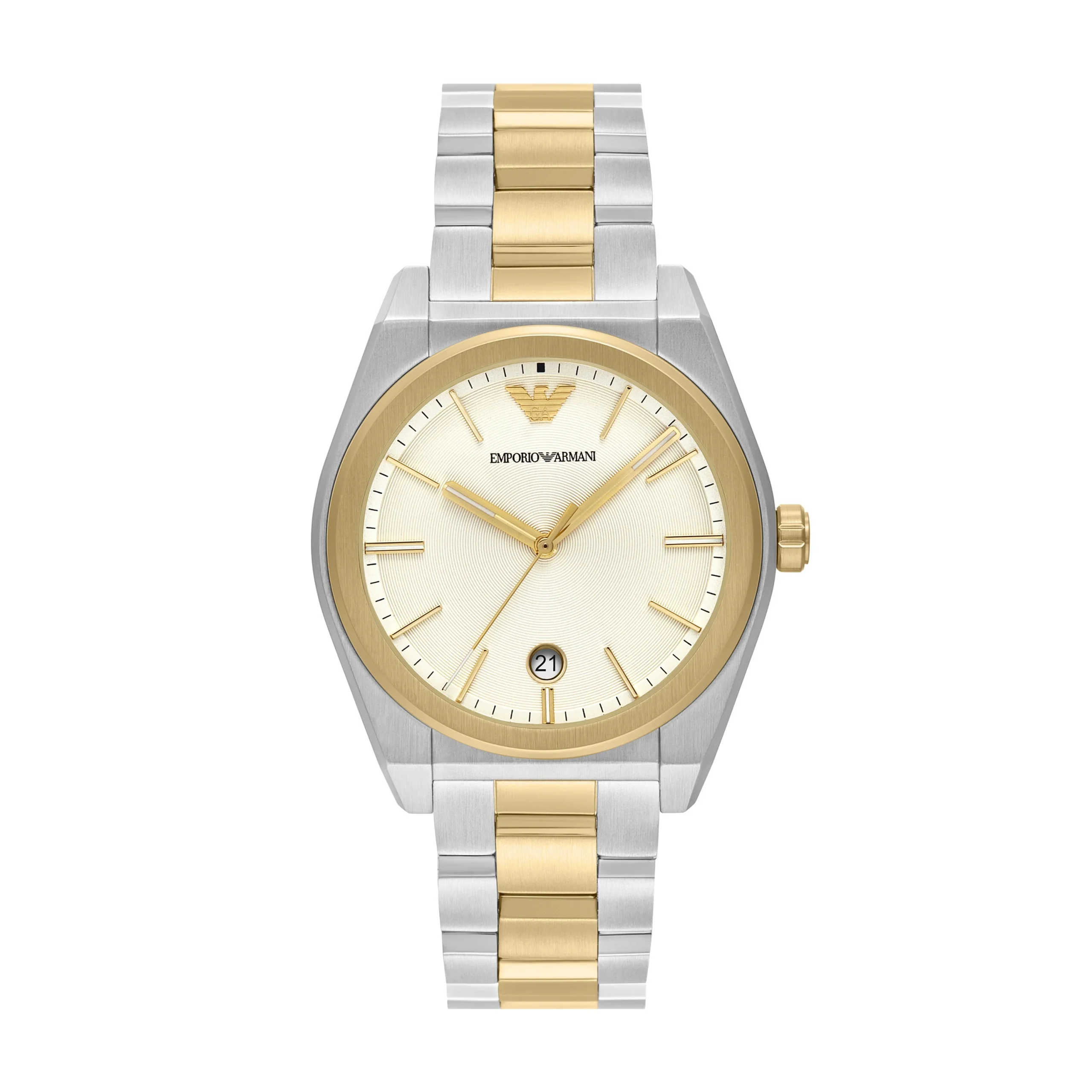 Emporio Armani AR11716 embodies refined modern elegance with a 4.1 cm (41 mm) two-tone stainless steel case and bracelet. The cream dial with CD finishing is accented by slender gold-tone hands and markers, a date window at 6 o’clock, and a gold-toned outer ring that adds warmth. Powered by a Japanese quartz movement, this three-hand date watch delivers precise timekeeping in a sleek, versatile package. The mineral crystal protects a design built for everyday wear, while the two-tone bracelet offers a balanced blend of silver and gold tones. A premium men’s watch from Armani that pairs craftsmanship with timeless style.