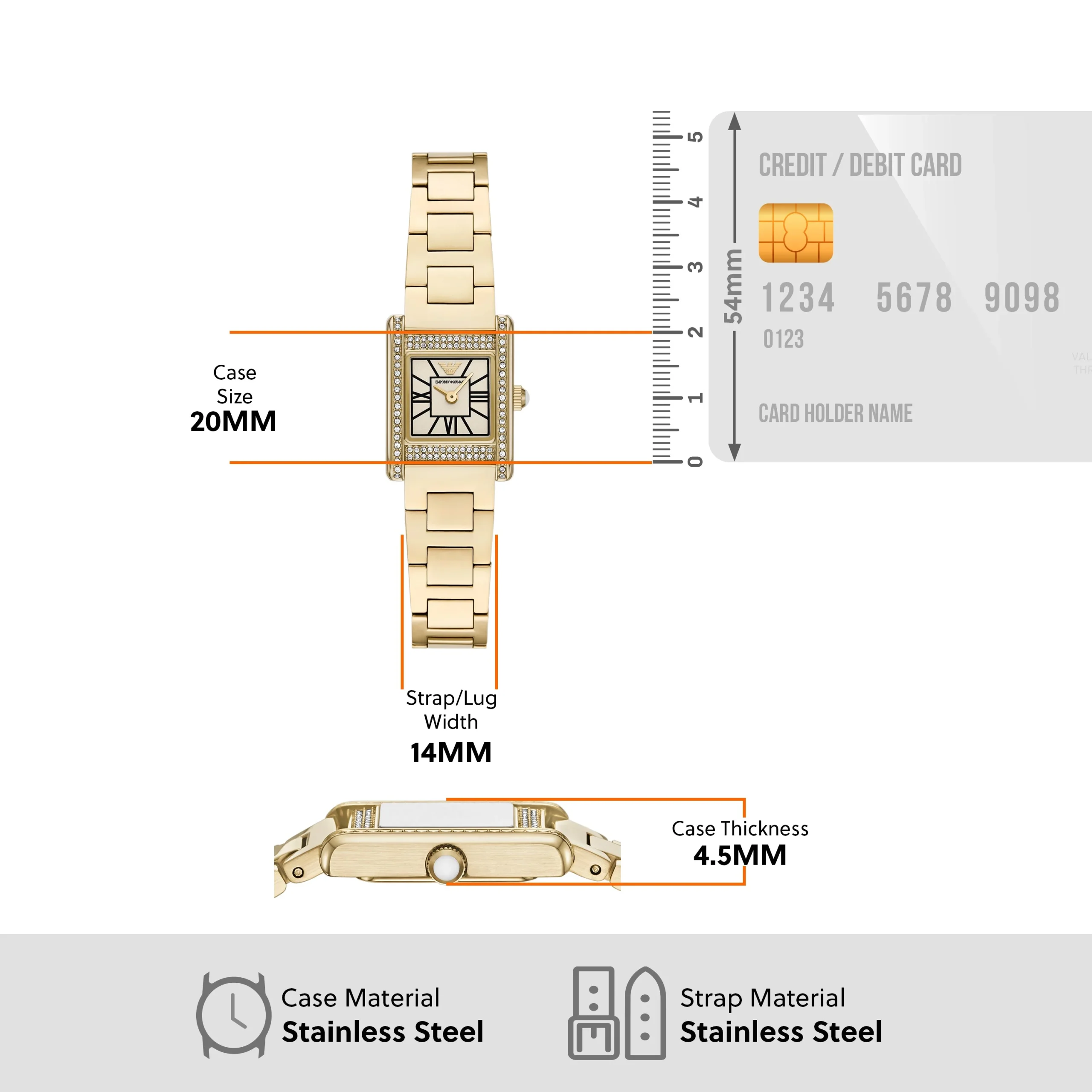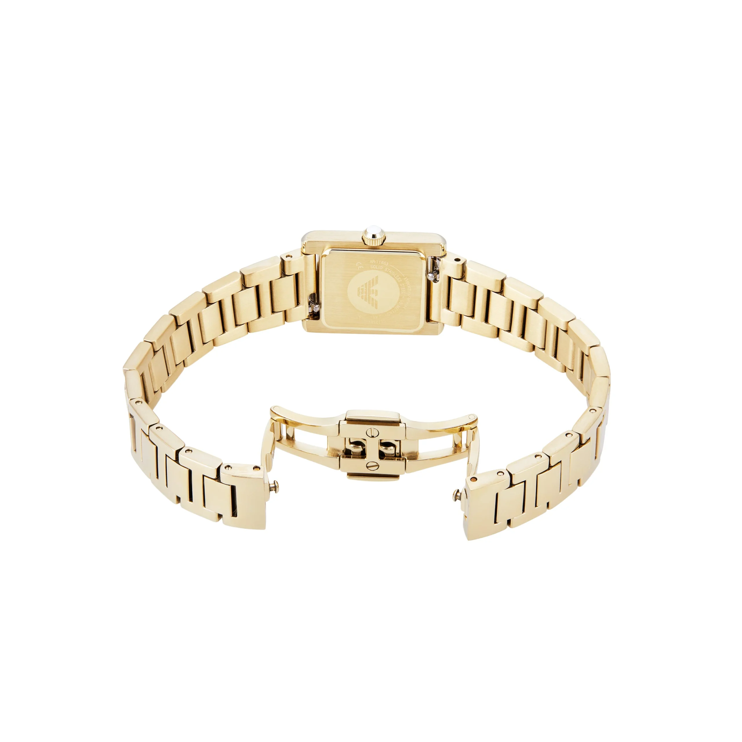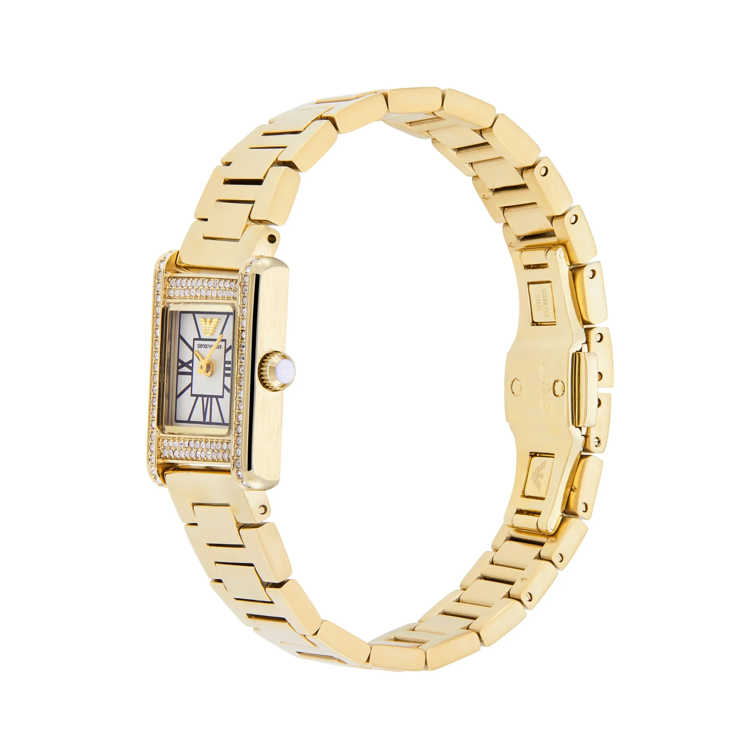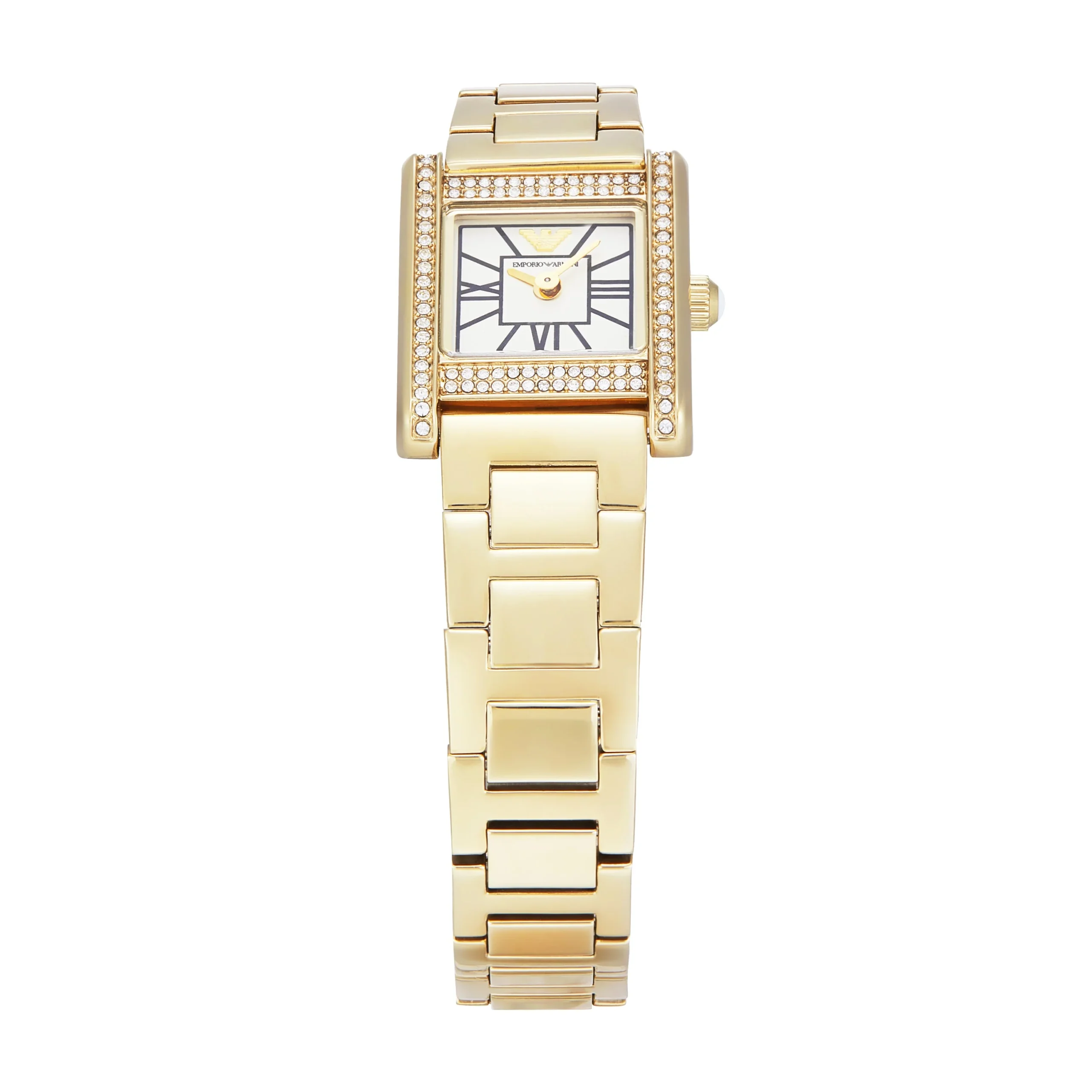 Elegant and understated, the Emporio Armani AR11663 is a refined women’s watch that blends classic design with modern sophistication. The gold stainless steel case and bracelet exude a timeless charm, enhanced by crystal accents that add a delicate shimmer. Featuring a rectangular 20mm case and a white mother-of-pearl inspired dial with Roman numeral markers, this watch delivers a subtle yet luxurious aesthetic. The quartz two-hand movement ensures precise timekeeping, while the mineral crystal glass offers durability and clarity. With a 5 ATM water resistance and butterfly deployant closure, it balances beauty and functionality seamlessly. A standout in the jewelry and watches category, this timepiece is the perfect accessory for elevating both everyday style and formal ensembles.