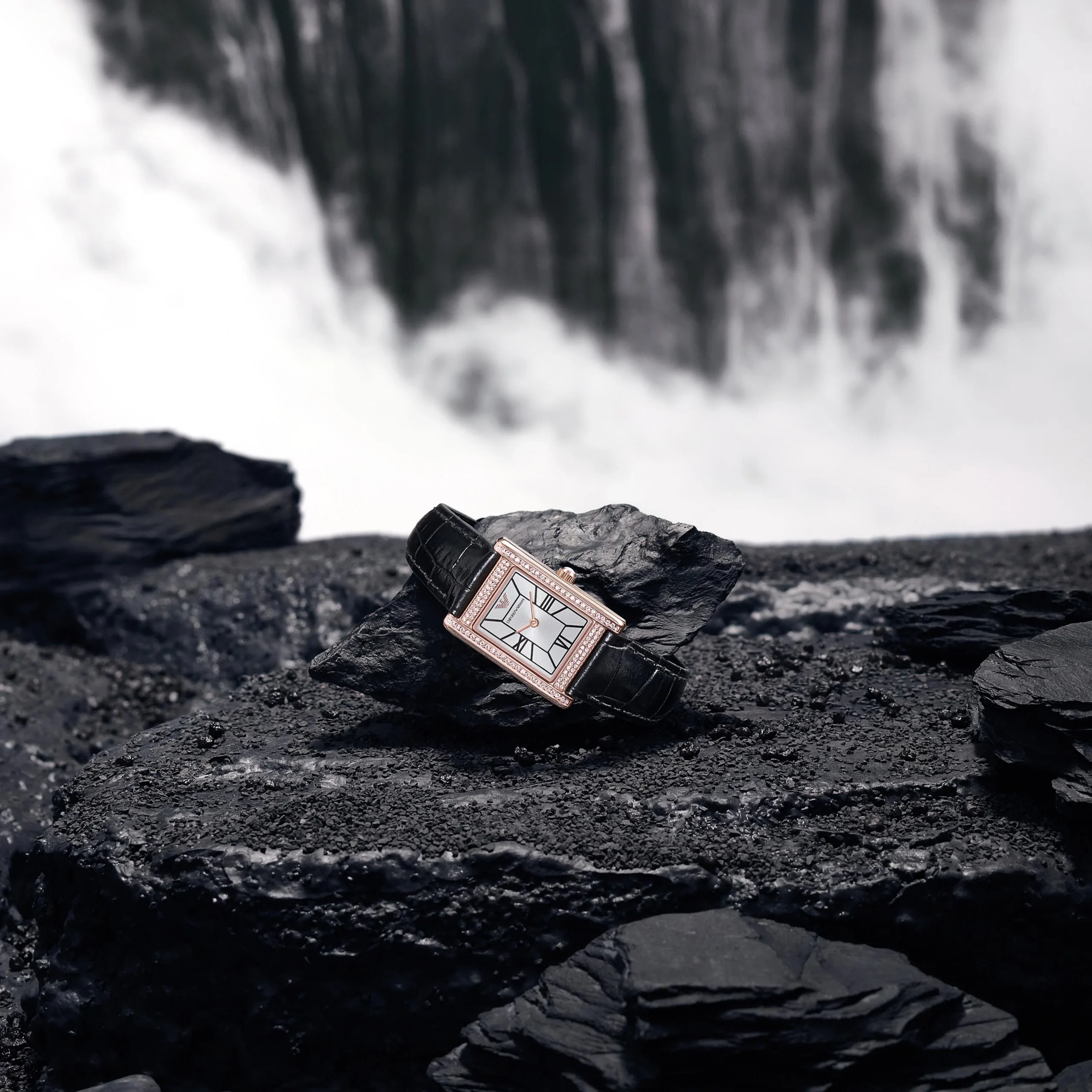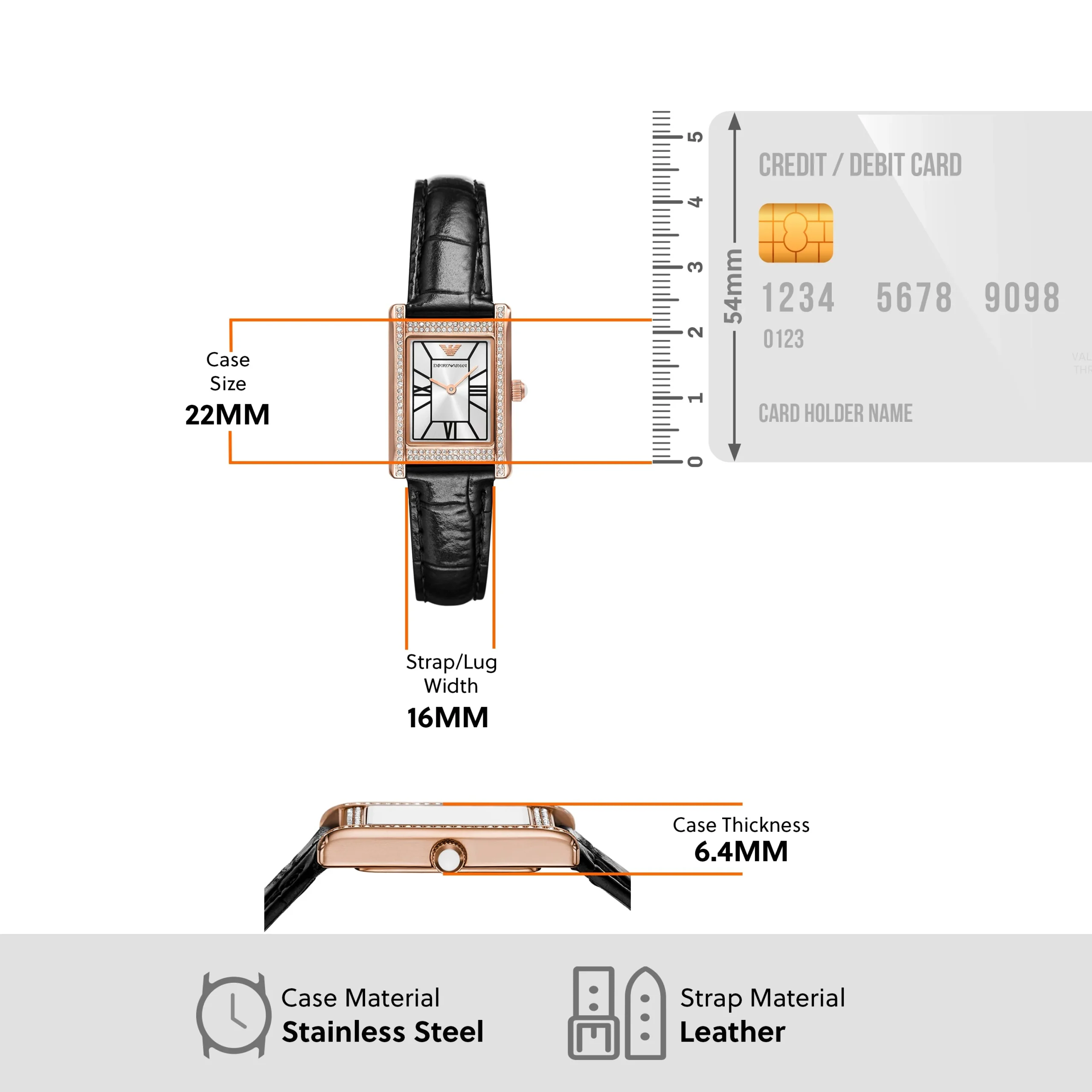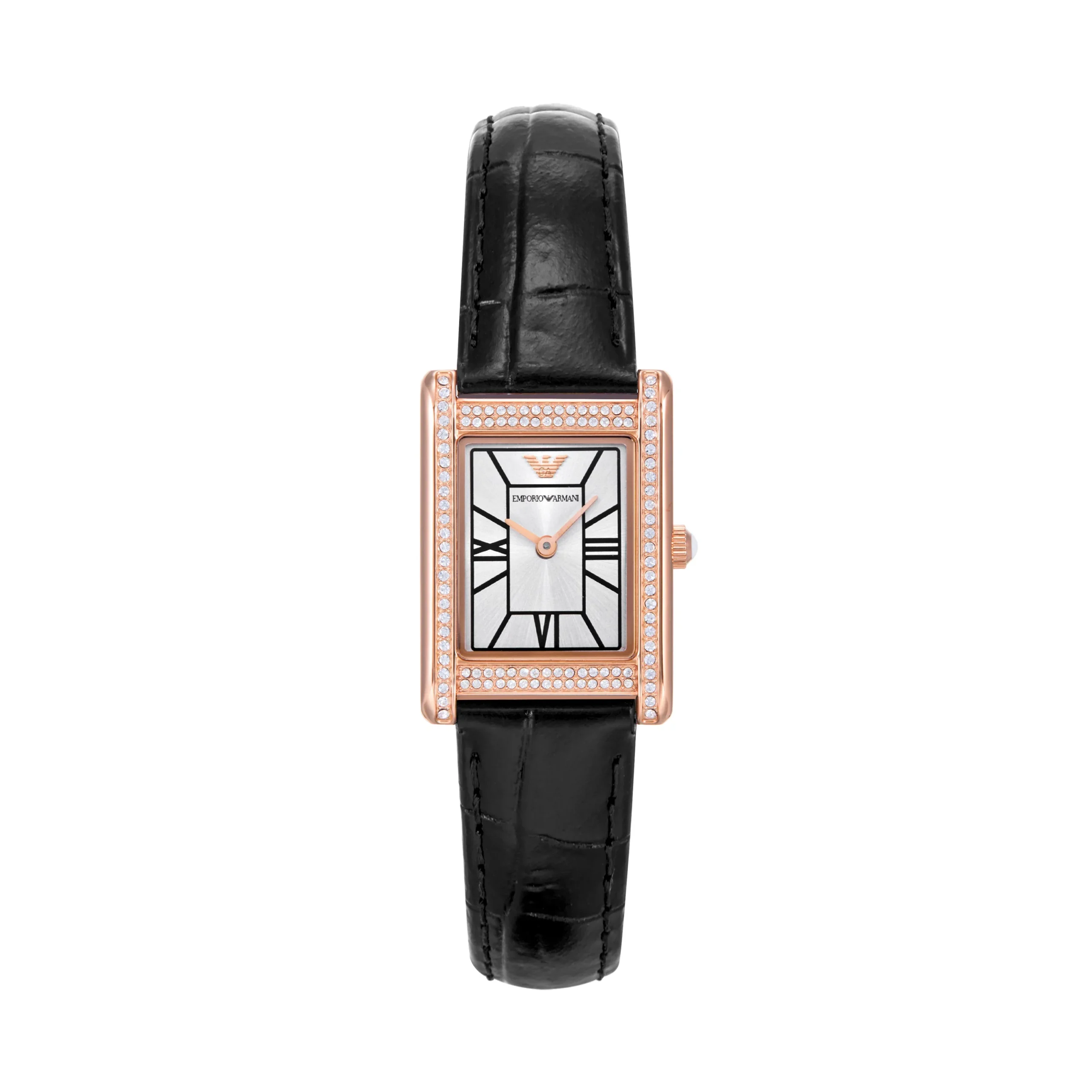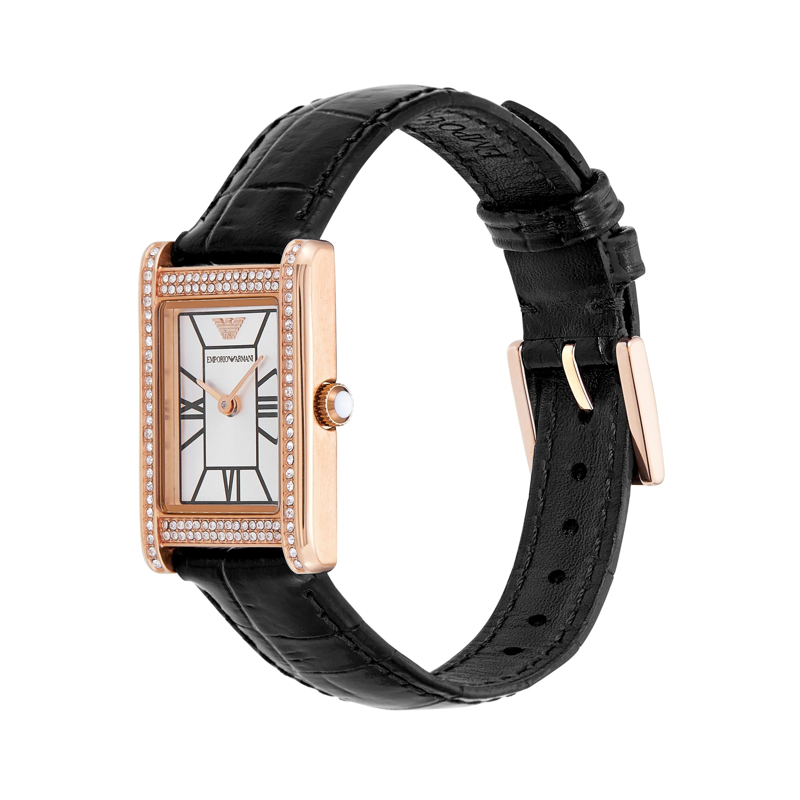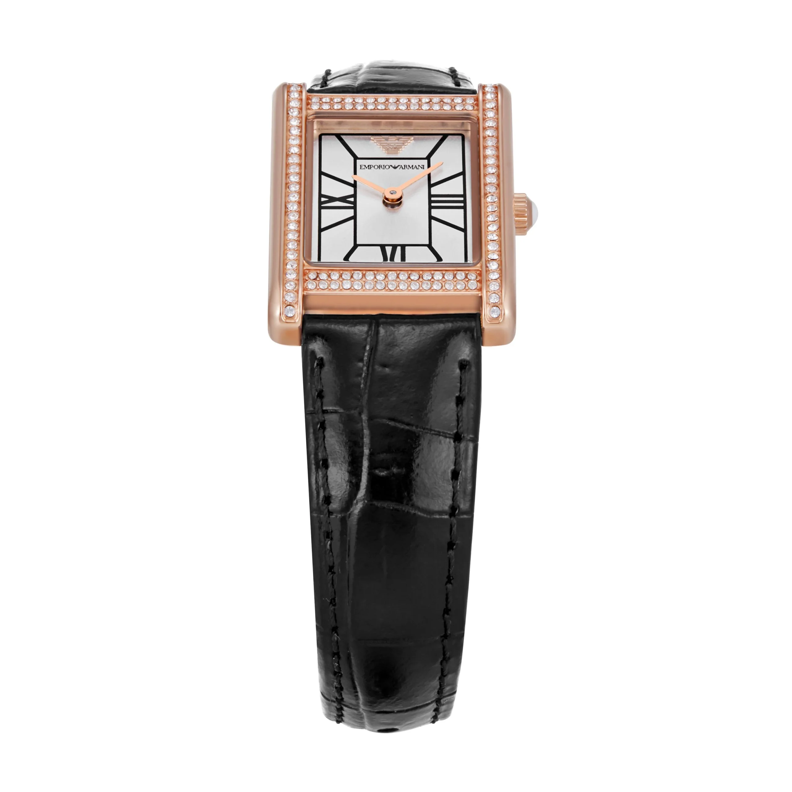 This Emporio Armani women’s watch pairs refined Italian craftsmanship with a minimalist sensibility, making it a standout in the luxury watches category. The rectangular 22 mm rose gold stainless steel case is accented with delicate crystal detailing, framing a silver sunray dial with bold Roman numerals and a signature logo at 12 o’clock. Powered by a reliable quartz two-hand movement, it offers both precision and understated elegance. The black leather strap, embossed with a crocodile texture and finished with fine stitching, adds timeless appeal while ensuring comfort and durability. With 5 ATM water resistance and a mineral crystal glass, this timepiece blends graceful design with everyday functionality.