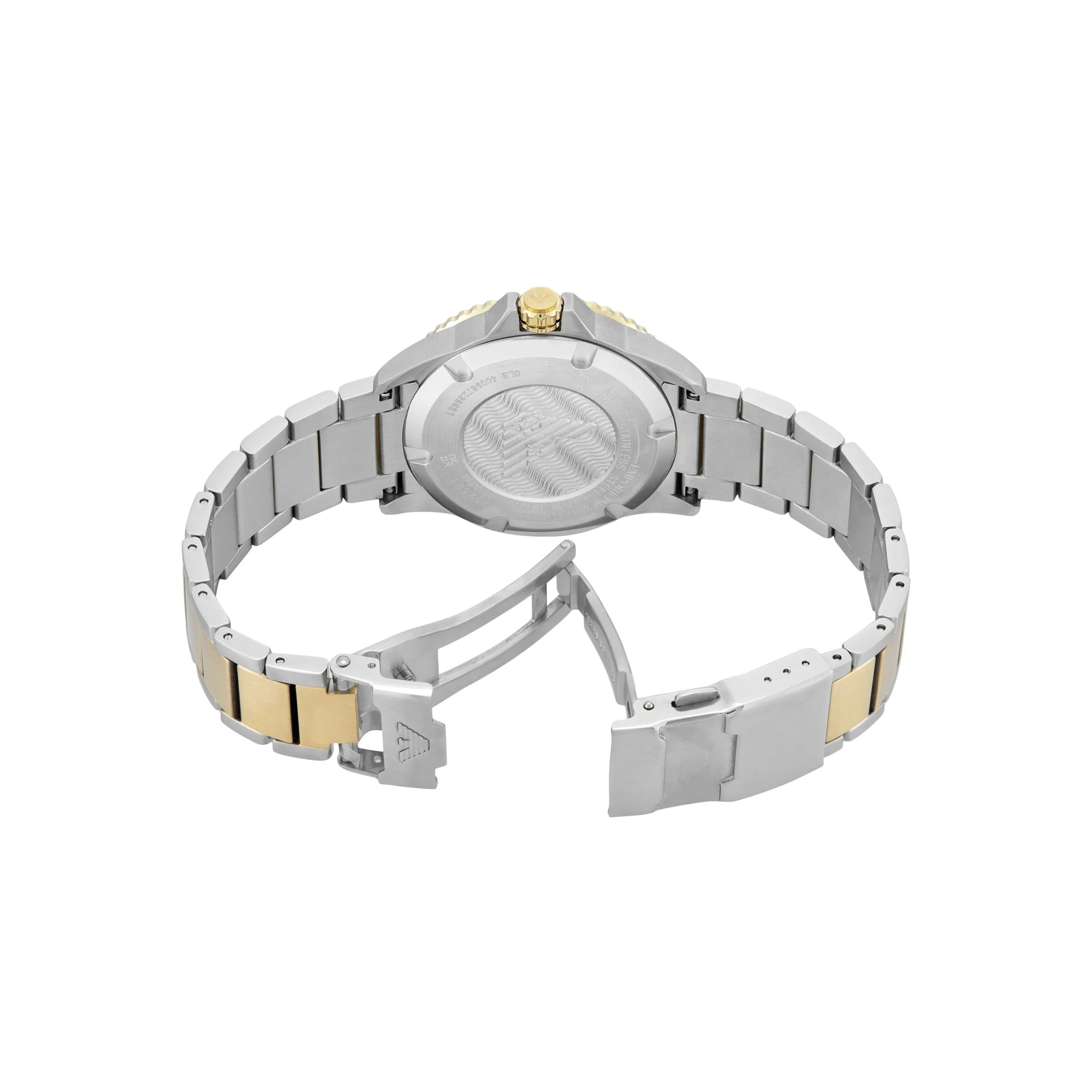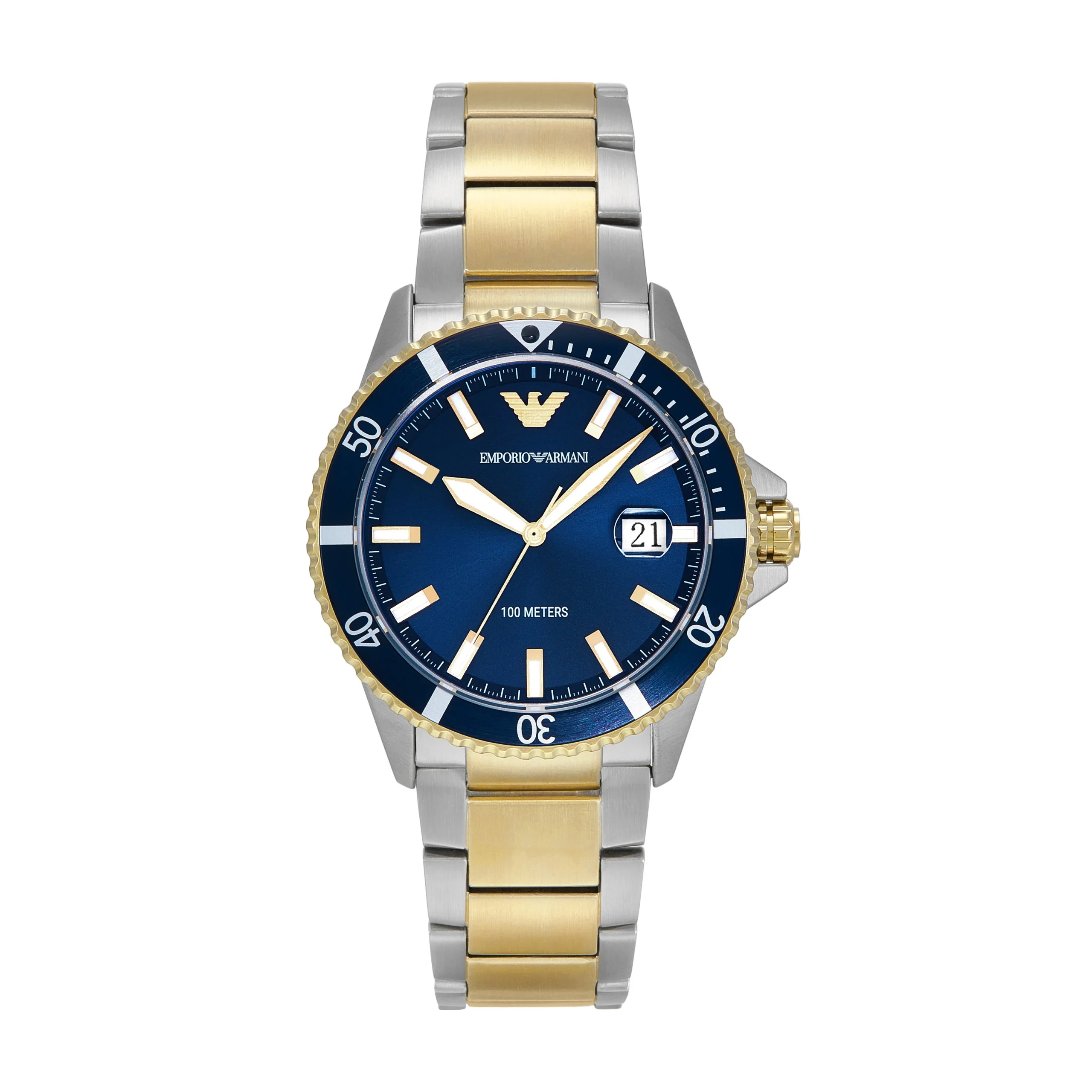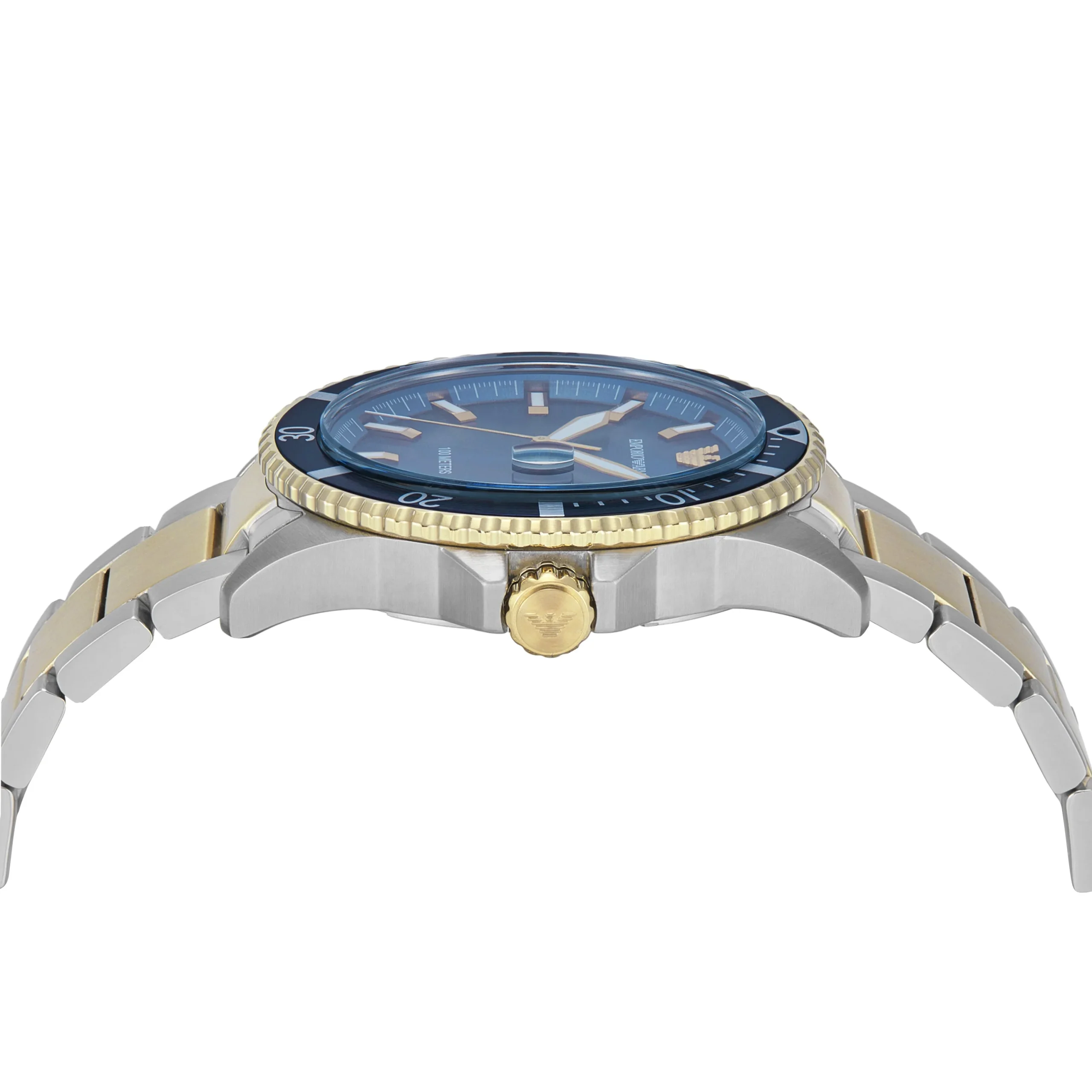 Discover the Emporio Armani World Explorer Three-Hand Blue Dial Stainless Steel Watch AR11682, a remarkable men’s watch that embodies sophistication and versatility. This 42mm timepiece features a stunning blue sunray dial, enhanced by a durable mineral crystal and luminescent accents for effortless readability, even in low light. The robust stainless steel construction, complemented by a two-tone silver and gold bracelet, offers both elegance and comfort. With a quartz movement and a convenient date display at 3 o’clock, this watch is designed for the modern adventurer. Water-resistant up to 100 meters, it’s perfect for both formal occasions and weekend escapades. Elevate your accessory game with this exquisite blend of Italian craftsmanship and contemporary style.