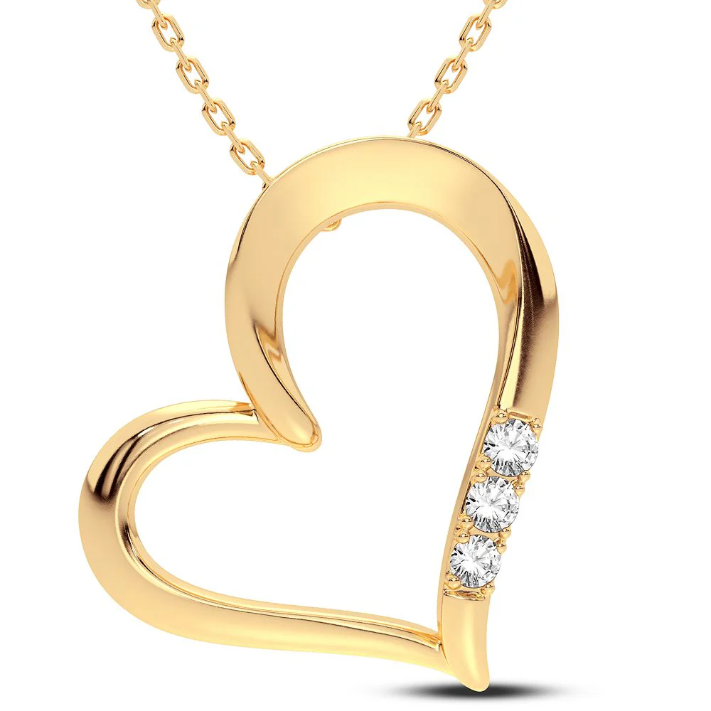 Crafted with finesse, the “Whisper of Elegance” pendant is a delicate piece featuring a modern heart silhouette in polished 14K yellow gold, complemented by a vertical row of glittering diamonds with a total carat weight of 0.06. A subtle statement of sophistication, this pendant captures the light and the attention with its understated charm and purity of design.