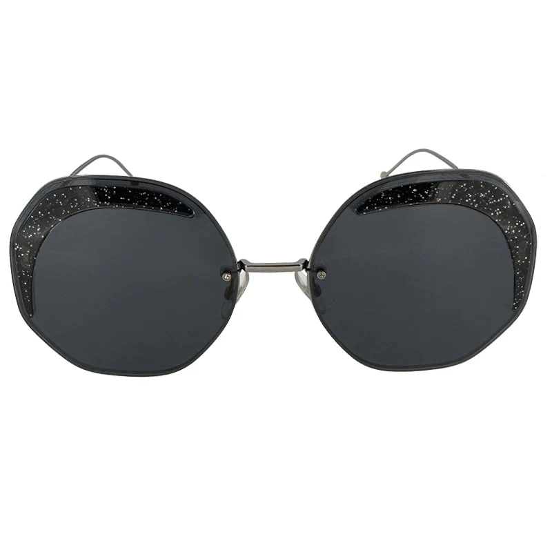 Women’s silver and black dark grey rimless sunglasses with oversized irregular lenses with embedded glitter.
