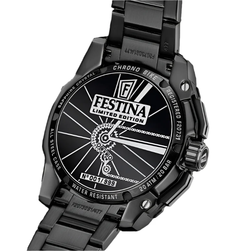 The Festina Chrono Bike Limited Edition Black Stainless Steel Band Watch f20731/2 is a striking men’s watch that seamlessly merges sporty elegance with exceptional functionality. Crafted from durable 316L stainless steel, this timepiece boasts a robust 45.5 mm case that is both eye-catching and resilient. The vibrant multi-colored dial features luminescent hands for clear visibility, complemented by a date window at 6 o’clock for added convenience. With water resistance up to 20 ATM, it’s designed to accompany your adventures, whether swimming or cycling. The watch also includes a versatile silicone strap, allowing you to switch styles effortlessly. Elevate your accessory collection with a watch that embodies precision, craftsmanship, and contemporary design.