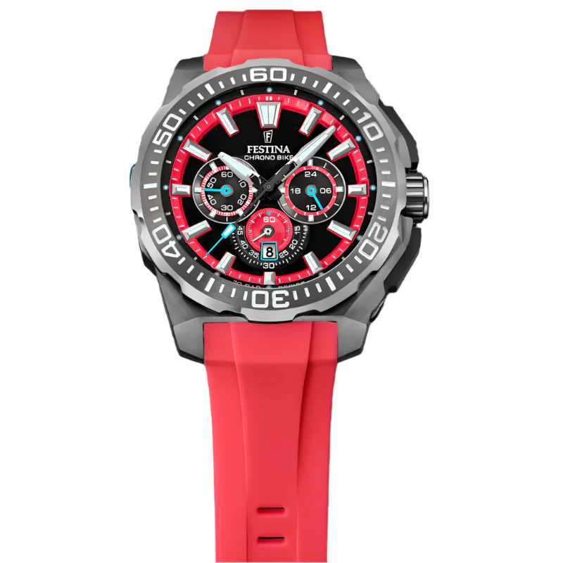 The silicone strap of the Festina Chrono Bike watch offers an exceptionally comfortable and flexible fit, making it the ideal companion for any activity. Its sporty character is highlighted by the vibrant colored details on the dial, along with applied indexes and luminescent hands that guarantee optimal legibility in various lighting conditions. You’ll never miss a beat, whether you are in bright daylight or dim environments.