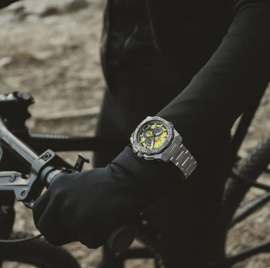 At the heart of this exceptional watch lies the MOS20 quartz movement, ensuring precise and reliable timekeeping. This means you can trust that you’re always on schedule, whether you’re hitting the cycling trails or navigating your daily commute. The vibrant yellow dial, adorned with luminescent indexes and hands, provides optimal readability even in low-light conditions, making it a functional accessory for both day and night.