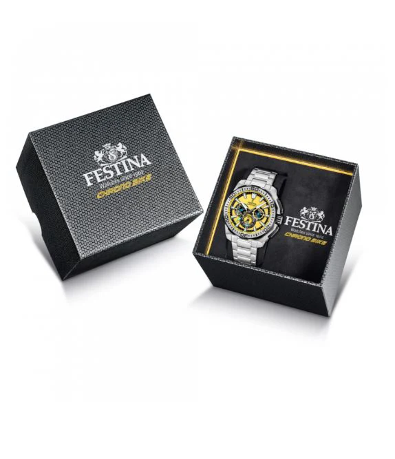 With an impressive water resistance of 20 ATM, this watch is designed to withstand any challenge, whether you are cycling in the rain or enjoying a swim. Its dynamic design, inspired by a passion for cycling, makes it an essential accessory for those who appreciate the fusion of style and functionality. Elevate your timekeeping experience with the Festina Chrono Bike Yellow Dial Stainless Steel Strap Watch F20724/4 and embrace the harmony of performance and elegance.