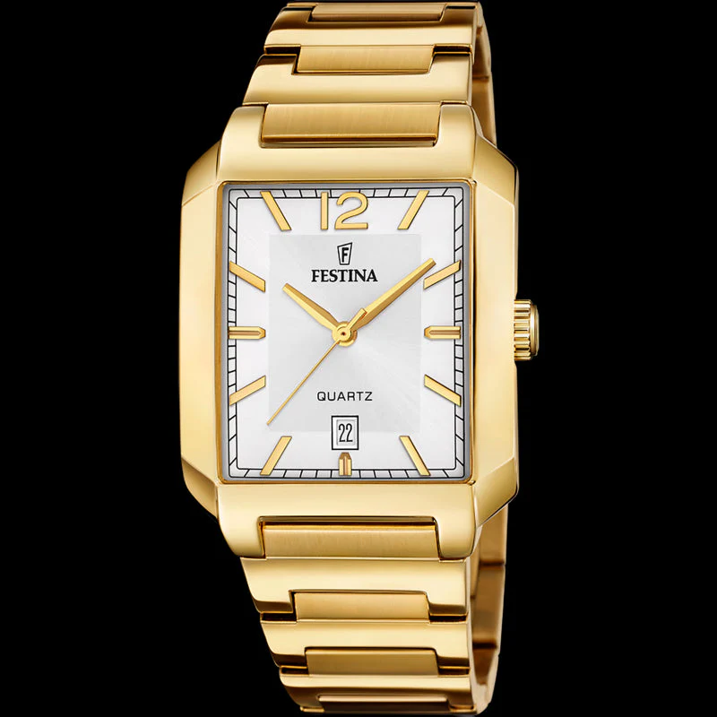 The Festina F20678/2 men’s watch offers a refined expression of classic design, featuring a polished gold-tone stainless steel bracelet paired with a crisp white dial. Sleek Roman numerals in black and elegant blue hands add contrast and sophistication, while a durable 40.5mm case delivers a balanced presence on the wrist. Powered by a precise quartz movement and protected by mineral crystal glass, this timepiece is as functional as it is stylish. With water resistance up to 50 meters, it seamlessly blends everyday versatility with timeless appeal. A thoughtful choice for those who appreciate craftsmanship and understated elegance.