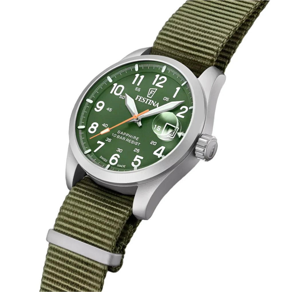 Designed for refined durability, the Festina Swiss Made Green Dial Nylon Strap Watch f20082/2 unites the precision of Swiss quartz movement with a bold, modern aesthetic. This men’s watch features a striking green dial housed in a brushed stainless steel 39mm case, complemented by luminous hands and a discreet date window for added utility. Crafted from durable nylon, the green fabric strap ensures lightweight comfort and a secure fit throughout the day. Sapphire crystal glass offers scratch resistance, while 100-meter water resistance makes it suitable for everyday adventures. From its RONDA 715 movement to the polished details, this timepiece stands out in the watches category for its exceptional craftsmanship and versatile appeal.