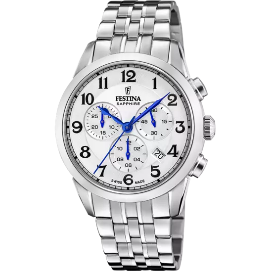 Crafted in Switzerland, the Festina F20040/1 men’s watch pairs timeless elegance with technical precision. A polished stainless steel bracelet complements the 41mm case, while the refined white dial features contrasting blue chronograph hands that add a subtle pop of sophistication. Protected by scratch-resistant sapphire crystal and driven by a reliable quartz movement, it balances durability with luxury. Water resistance up to 100 meters ensures confidence in any setting, making it an ideal companion for both formal attire and everyday wear. This stainless steel men’s watch stands out in the watches category through its meticulous craftsmanship, chronograph function, and classic yet contemporary design.