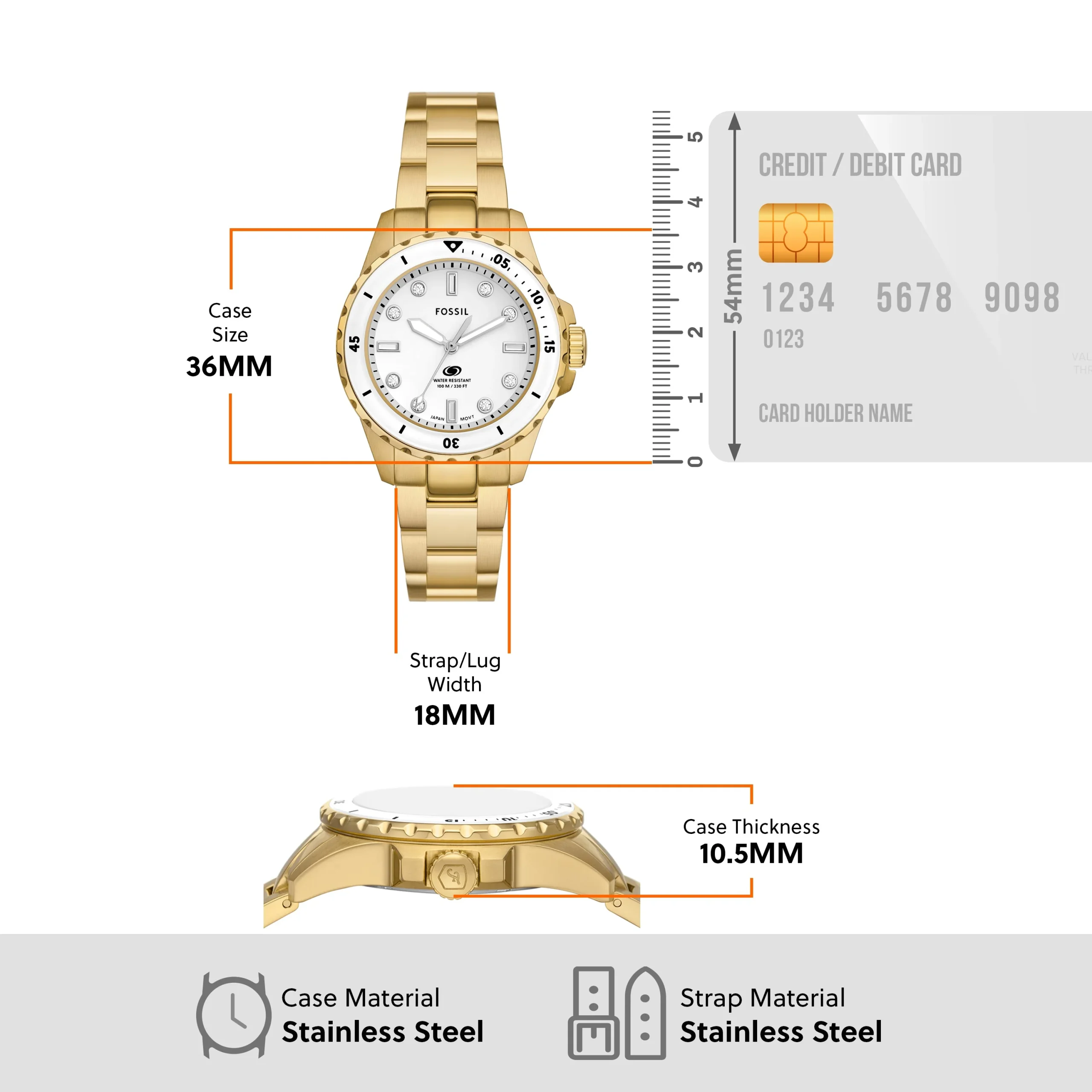 Refined and radiant, the Fossil Blue Dive Three-Hand Gold-Tone Stainless Steel Watch is a standout women’s watch that blends timeless design with modern durability. Crafted from gold-tone stainless steel with a crisp white dial and luminous markers, it delivers effortless elegance in any setting. The 36mm case houses a reliable quartz movement, protected by a mineral crystal glass, ensuring both style and precision. Designed for both everyday wear and active moments, it features 100 meters of water resistance and a unidirectional rotating bezel for added versatility. The stainless steel bracelet with a deployment buckle ensures a secure, comfortable fit, while the polished finish enhances its sophisticated appeal. Perfect for those seeking a statement timepiece that merges fashion and function within the jewelry and watches category, this piece embodies bold charm and lasting craftsmanship.