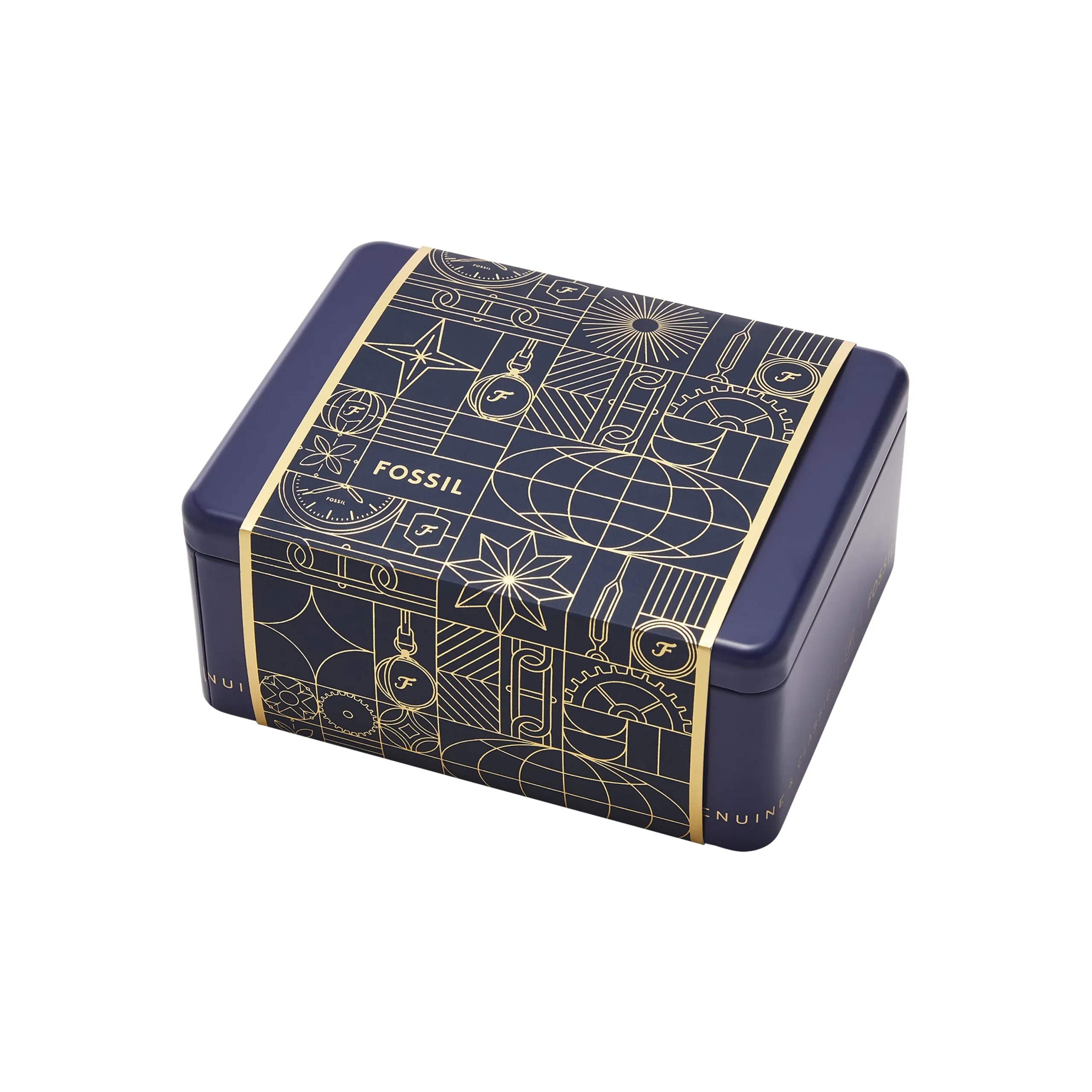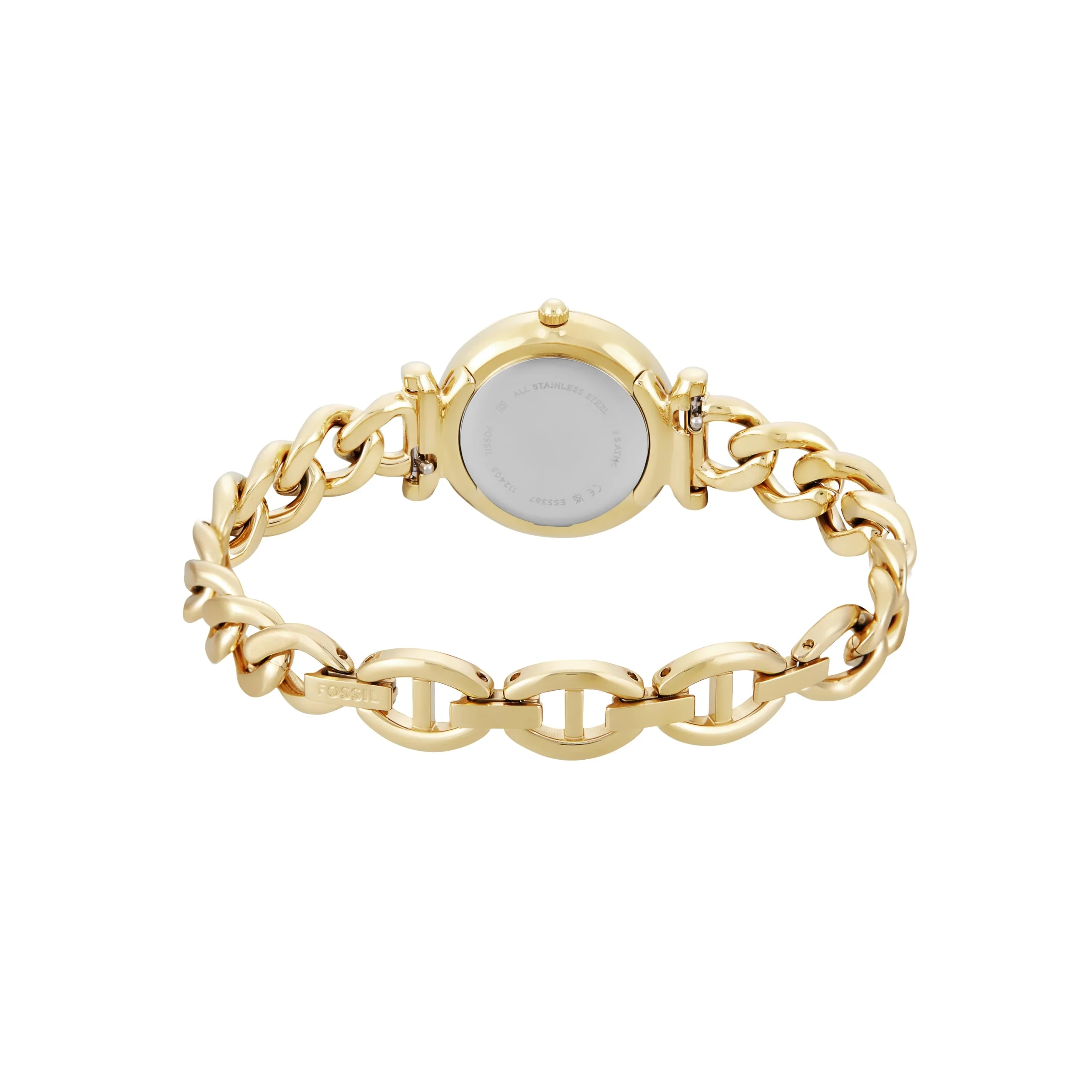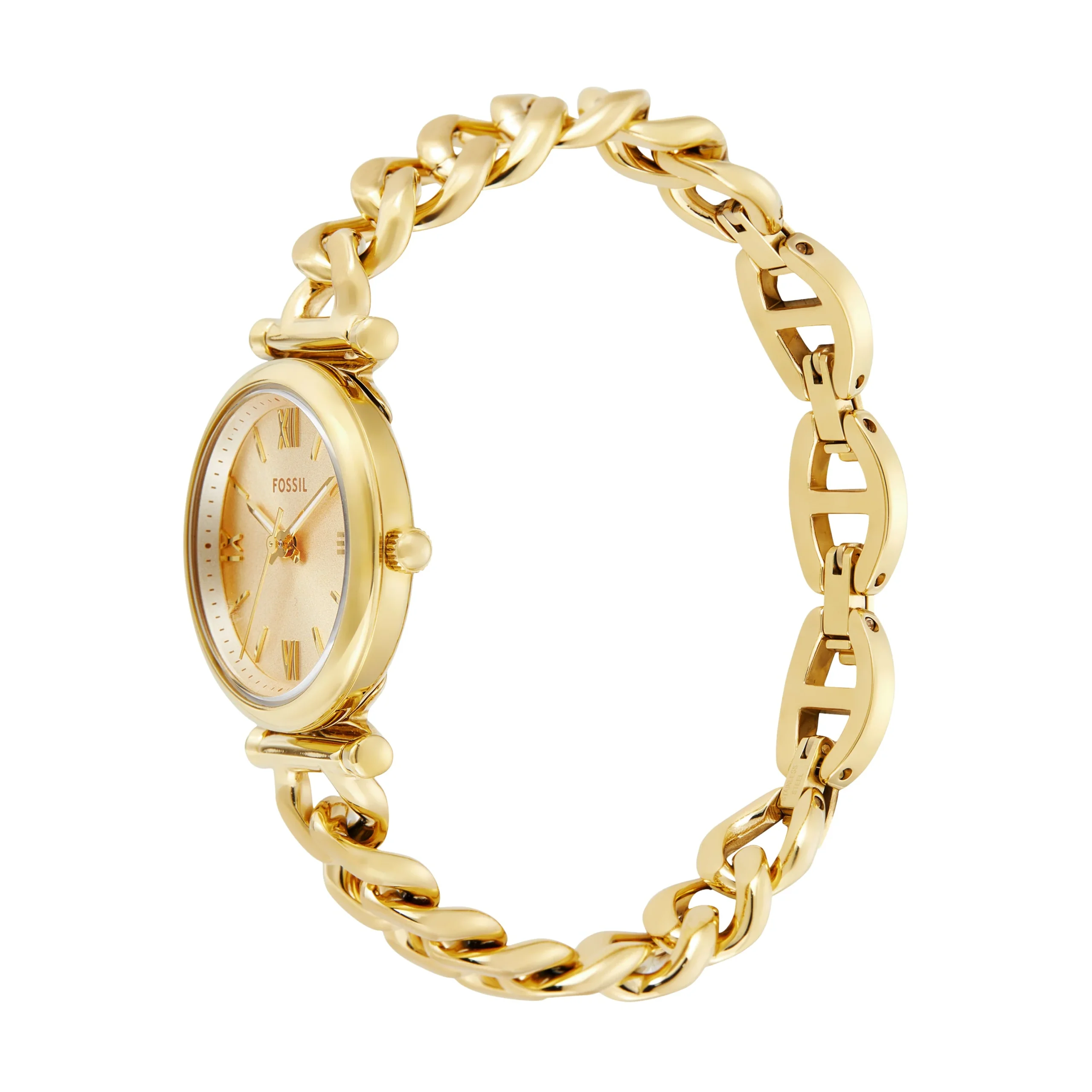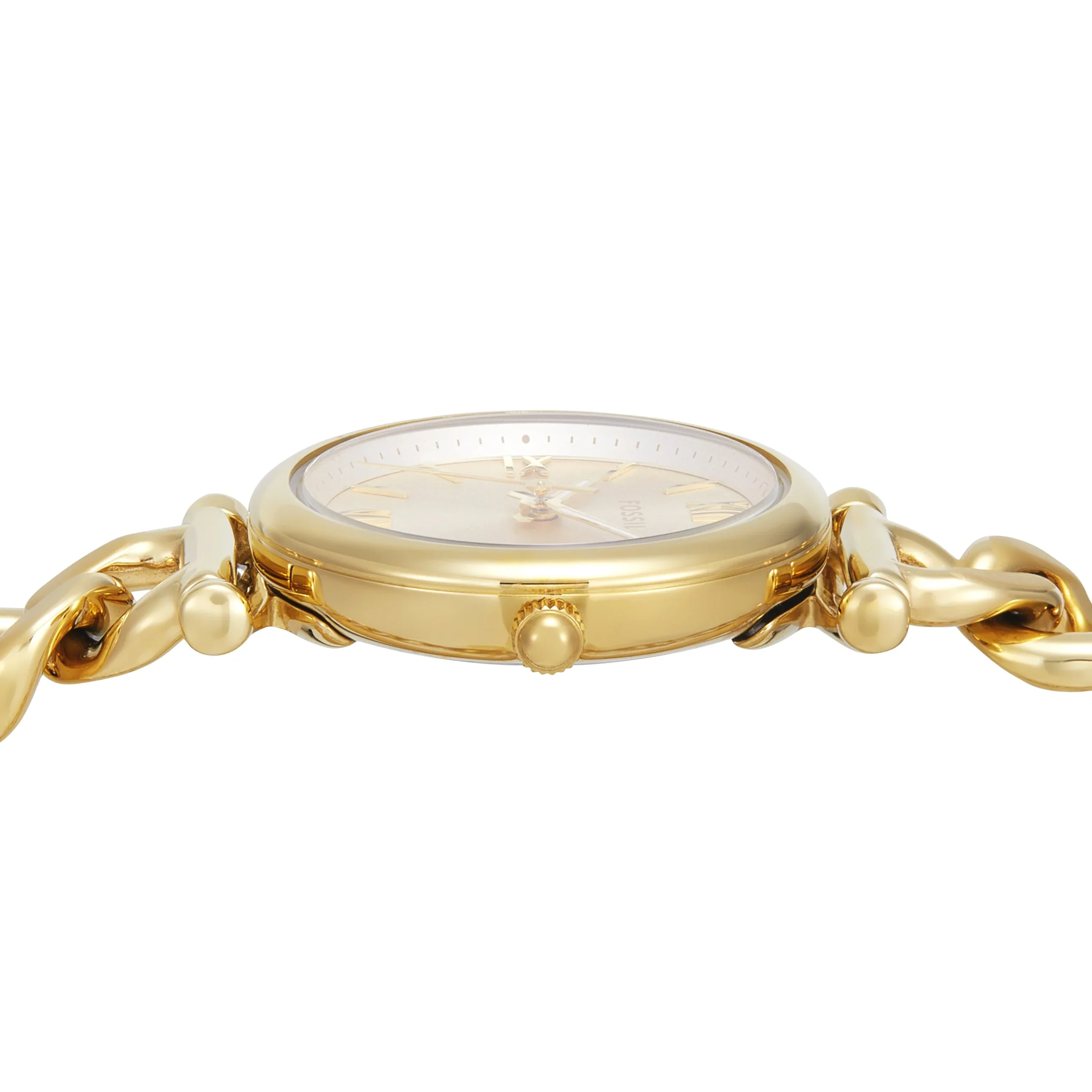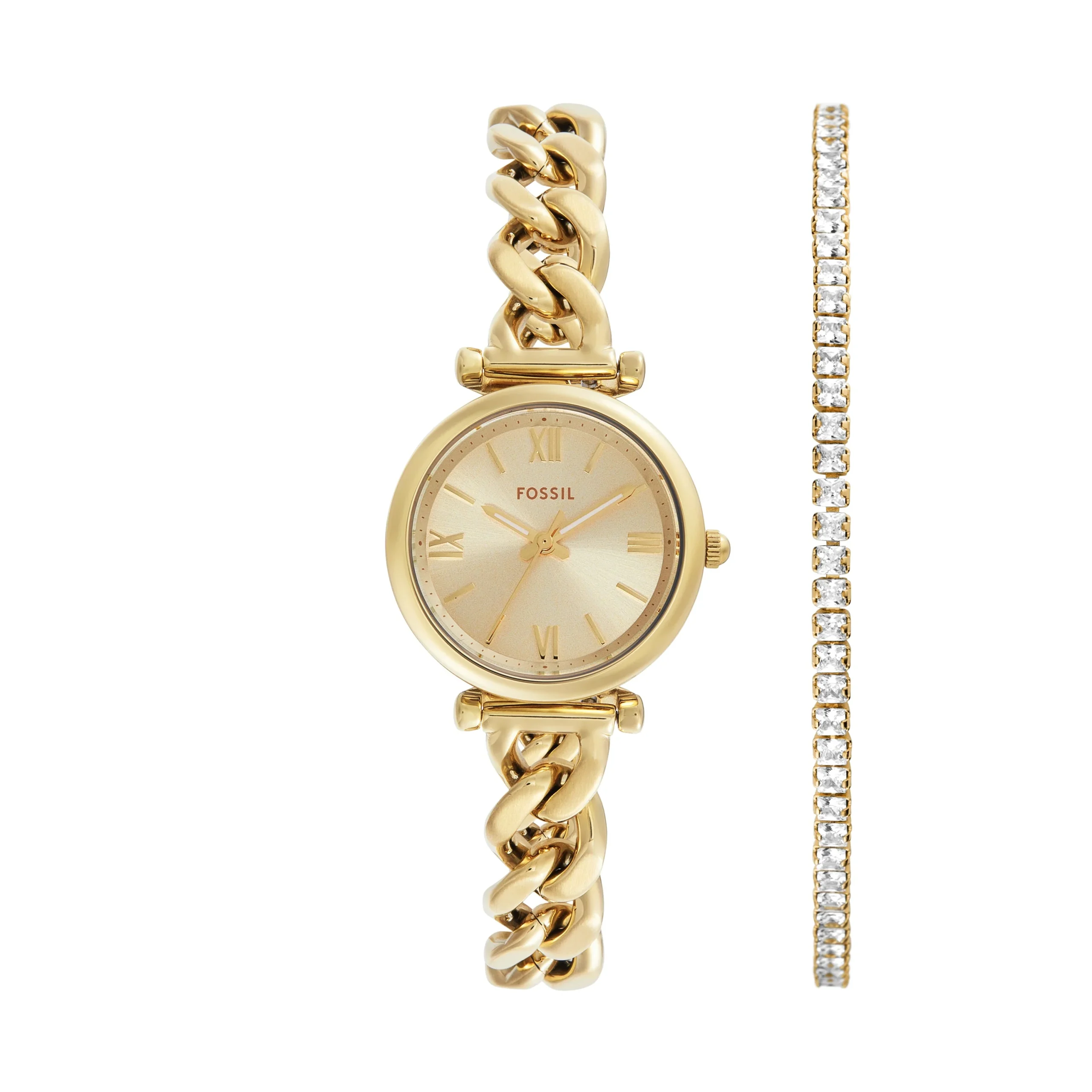 The Fossil Carlie Three-Hand Stainless Steel Watch and Bracelet Set ES5387SET exudes polished charm with a refined gold-tone finish, perfectly suited for the modern woman who values elegant simplicity. The women’s watch features a 28mm stainless steel case, a gold dial beneath mineral crystal glass, and a striking chain-link bracelet that evokes vintage flair with a contemporary twist. A precise quartz movement powers the clean three-hand display, while a 5 ATM water resistance rating adds everyday durability. Paired with a matching crystal tennis bracelet that sparkles subtly, this set offers a harmonious blend of classic aesthetics and modern versatility. Whether worn as a statement ensemble or styled individually, it elevates any look with its timeless design and exceptional craftsmanship.