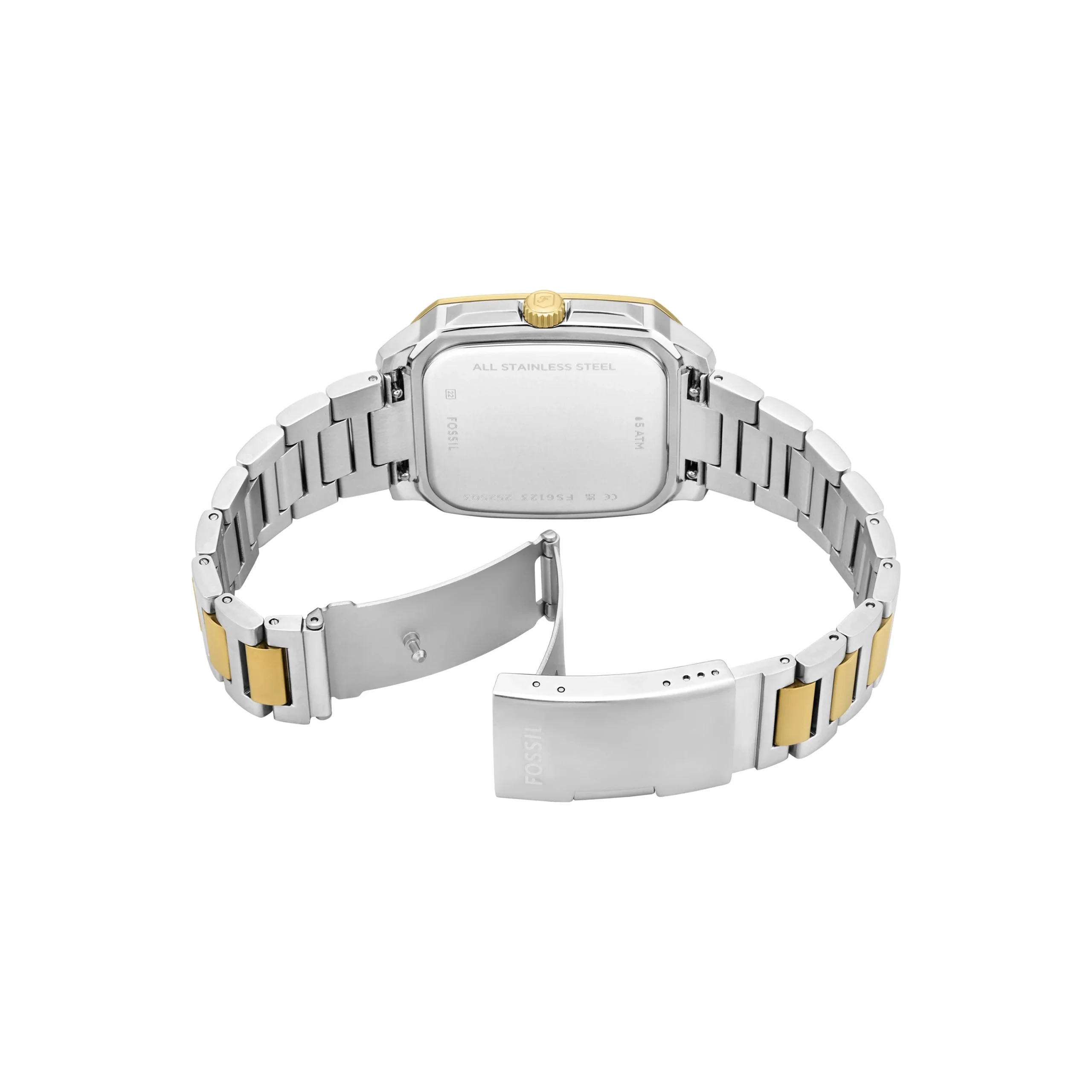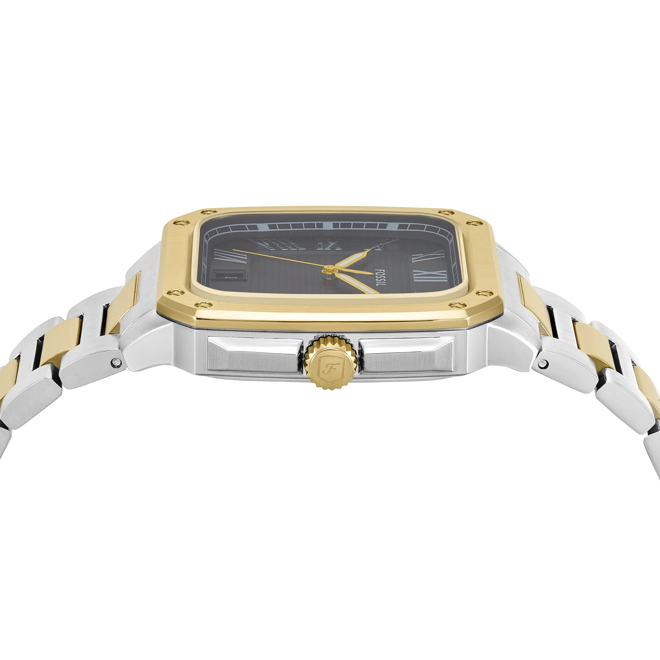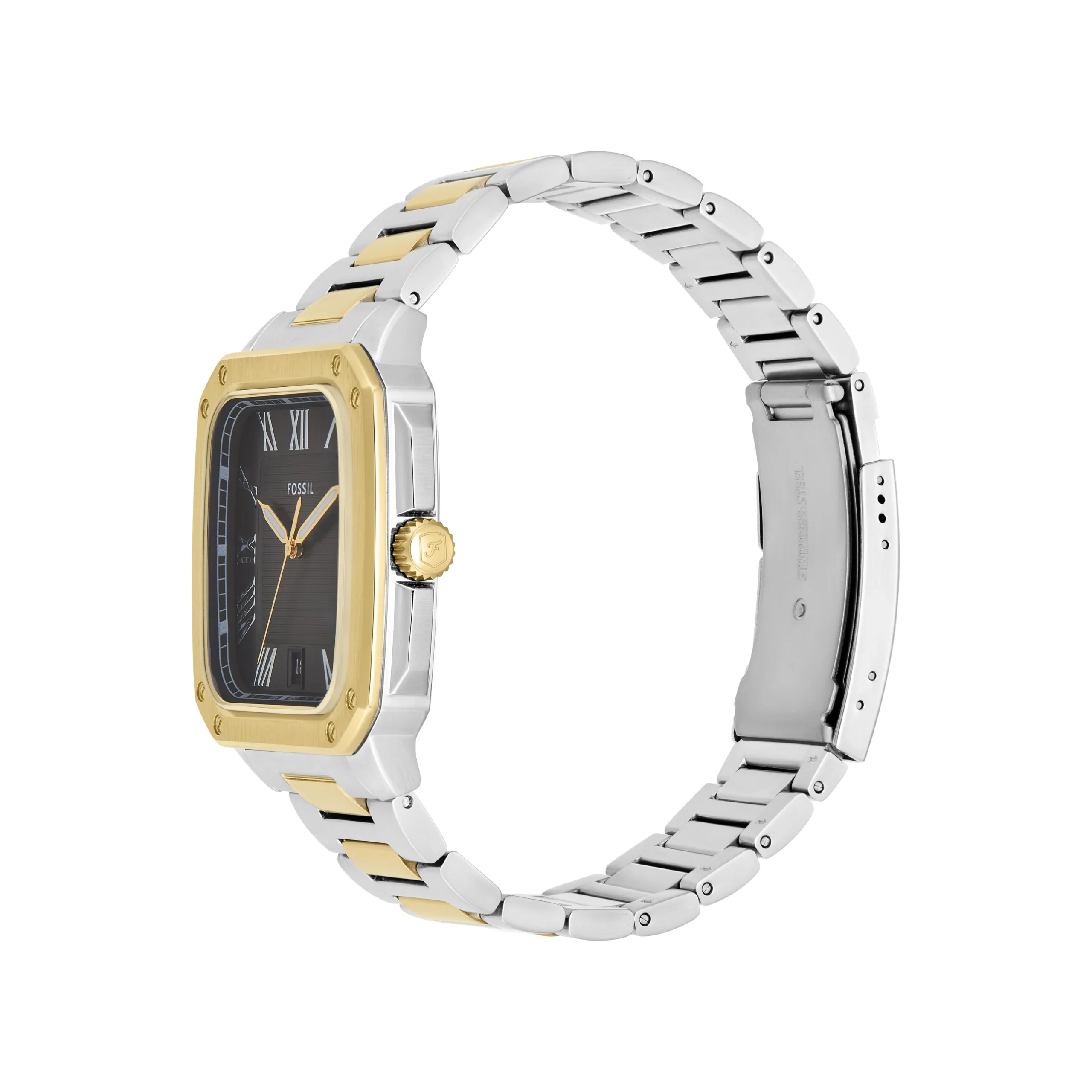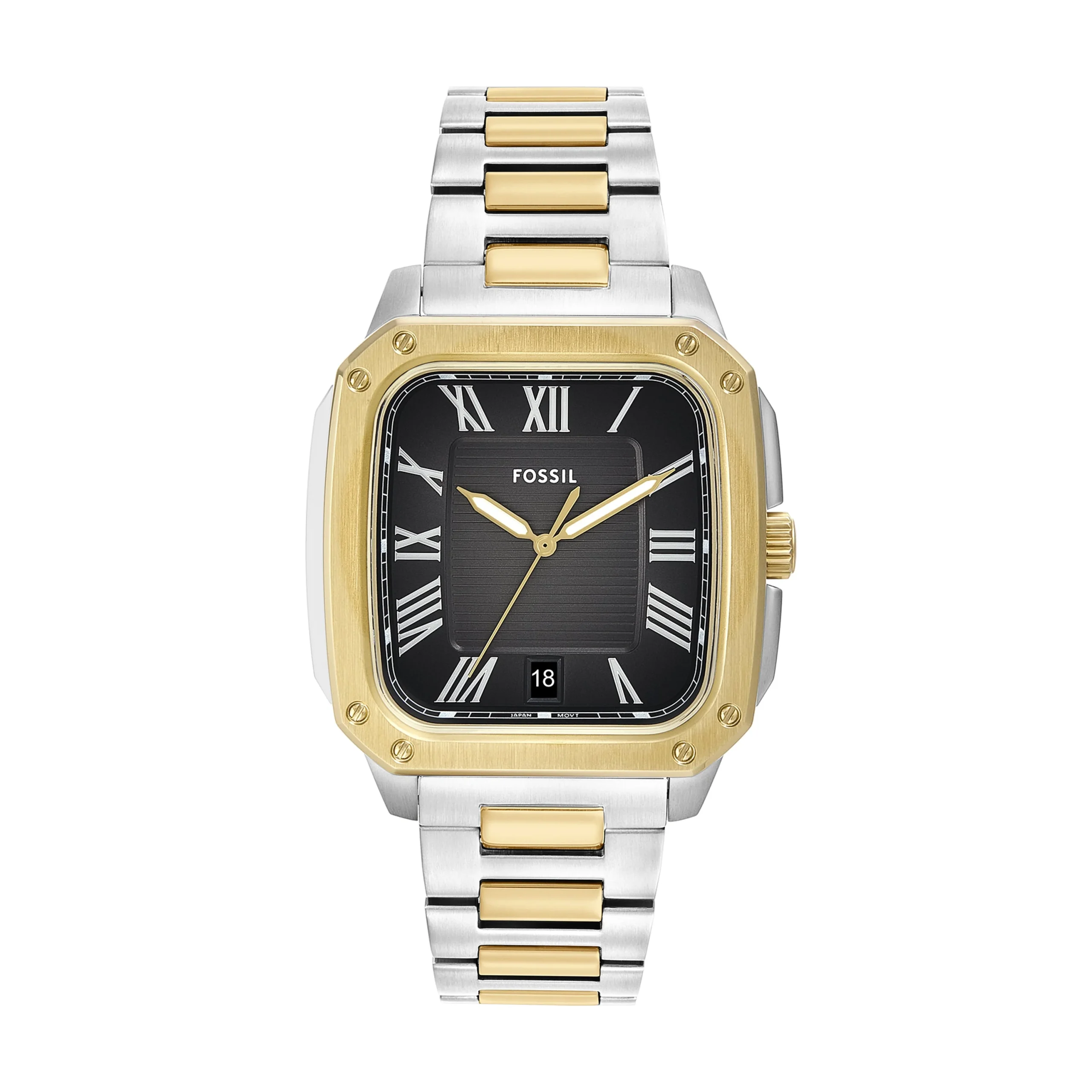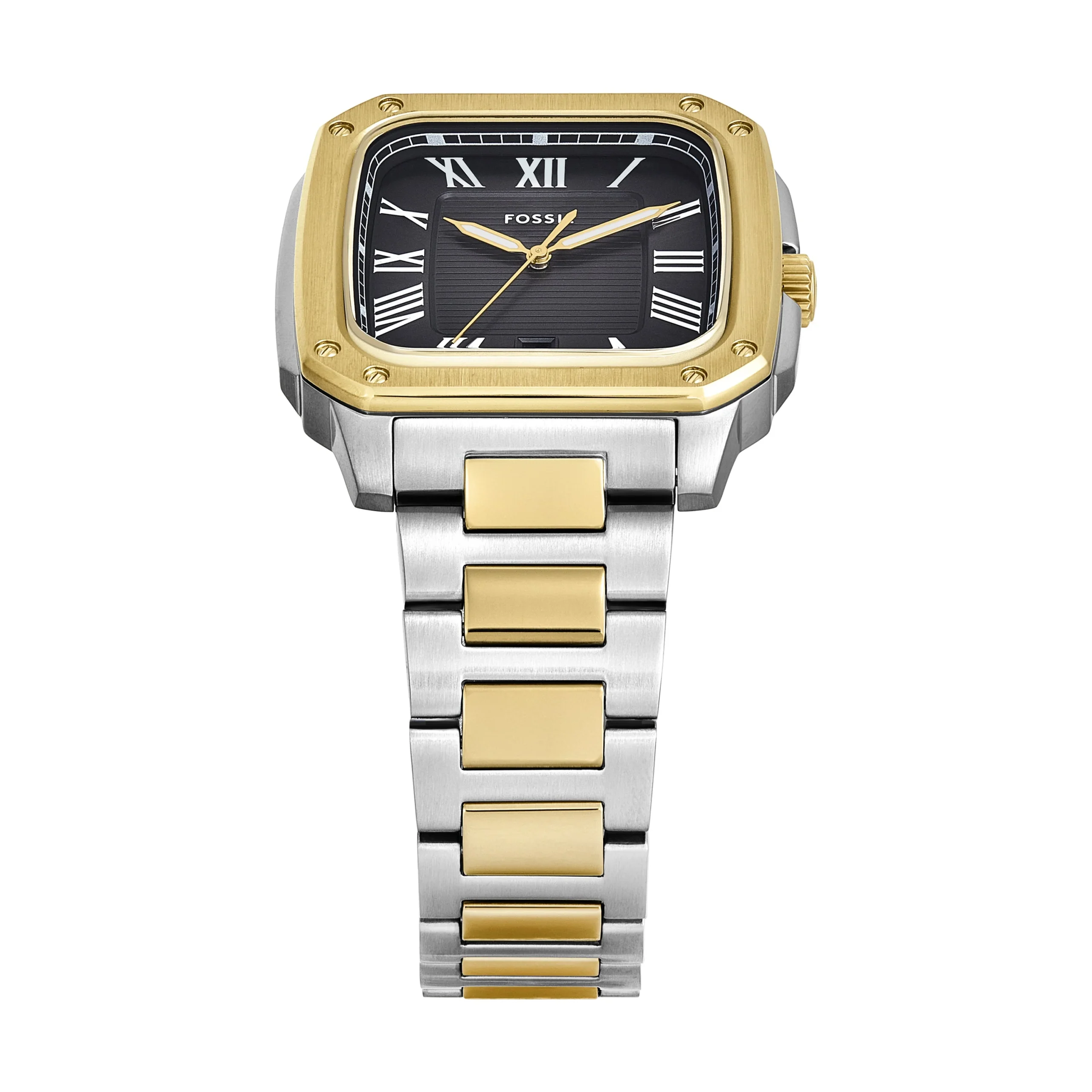 Designed for timeless sophistication, the Fossil Crosby Three-Hand Black Dial Stainless Steel Watch FS6123 combines modern edge with classic refinement. The rectangular 42mm stainless steel case in a polished two-tone silver and gold finish frames a striking black dial with Roman numeral markers, delivering a confident and elegant statement. A durable mineral crystal offers lasting clarity, while the three-hand quartz movement ensures precise performance. The integrated stainless steel bracelet, featuring alternating silver and gold links, blends seamlessly into both formal and casual wardrobes, offering versatility for every occasion. With a discreet date display and 50-meter water resistance, this men’s watch embodies everyday functionality with enduring style.