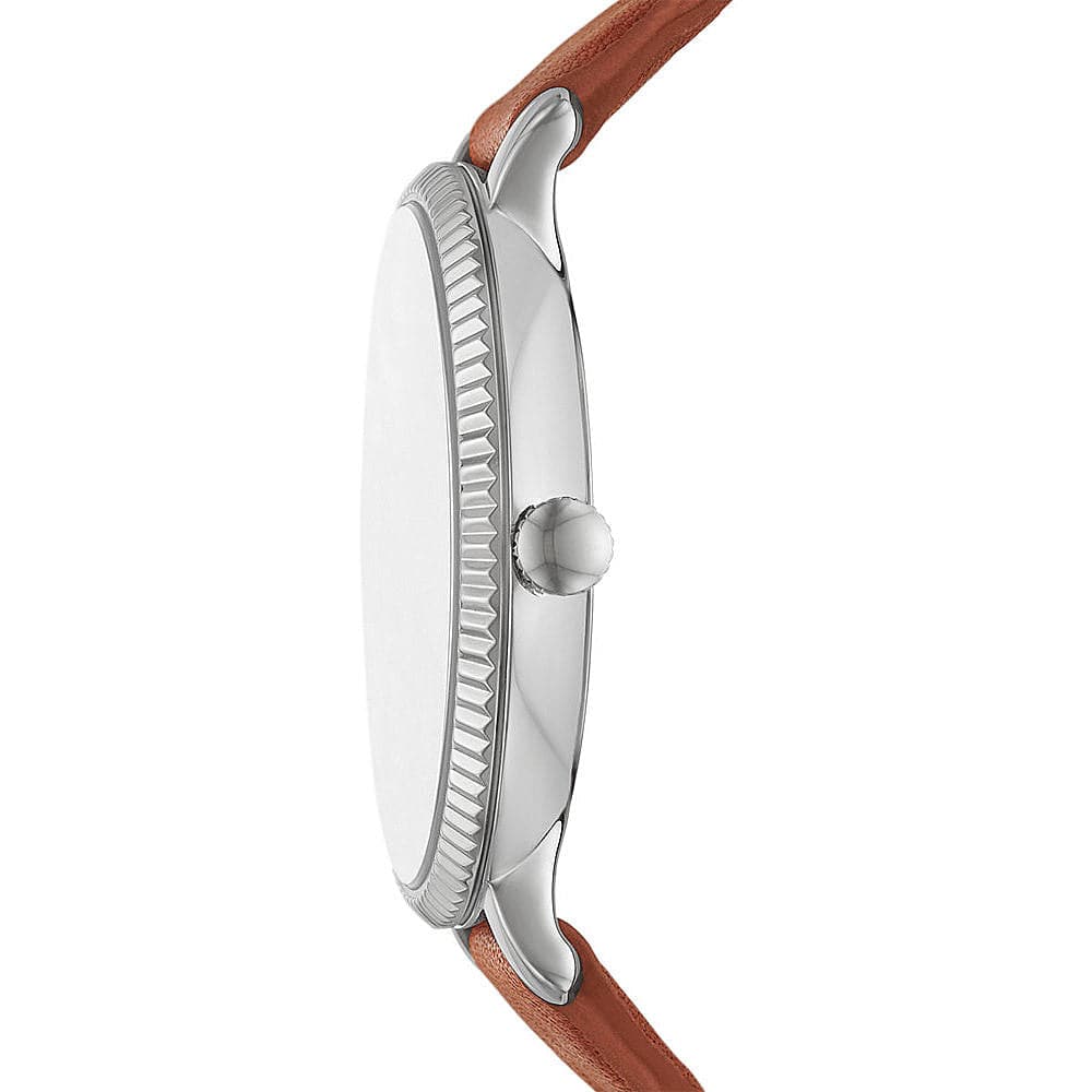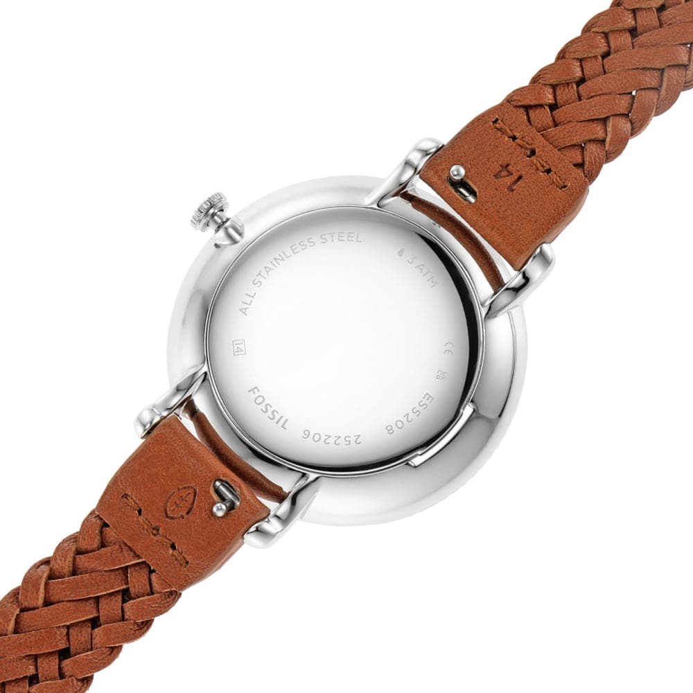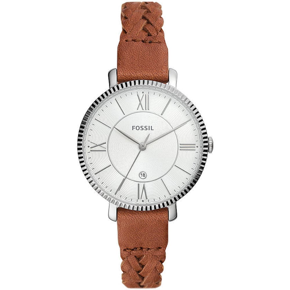 Fossil Jewelry women’s time only watch from the Jacquelin collection. The case is round, in stainless steel with a polished finish. Case size: 36 mm, case thickness: 8 mm. The dial is silver in color. Lug distance: 14 mm. The strap is in brown pro-planet leather with a shiny finish. Watch with pin buckle. Water resistance is 3 atm. The movement is quartz, 3 spheres. Functions: date window.