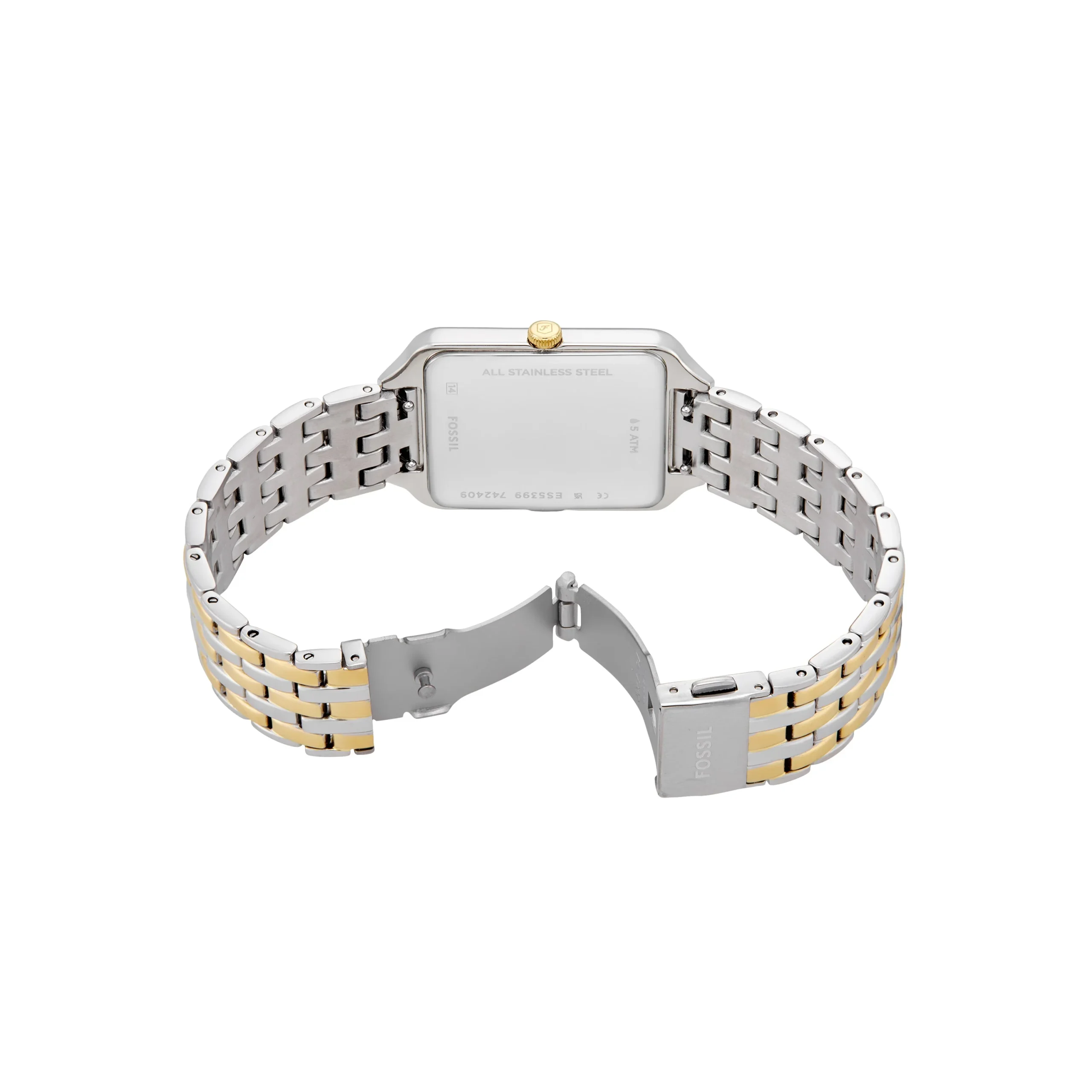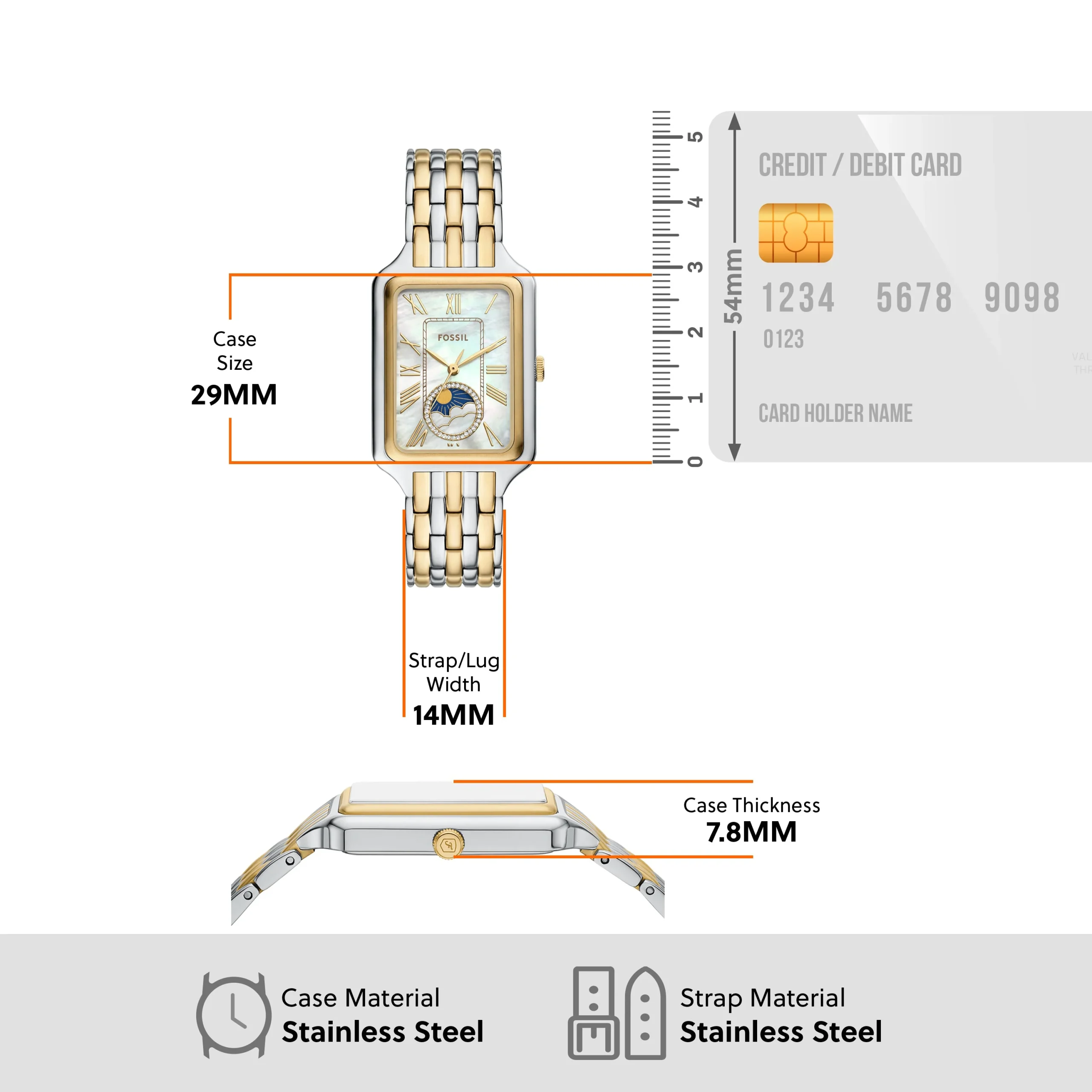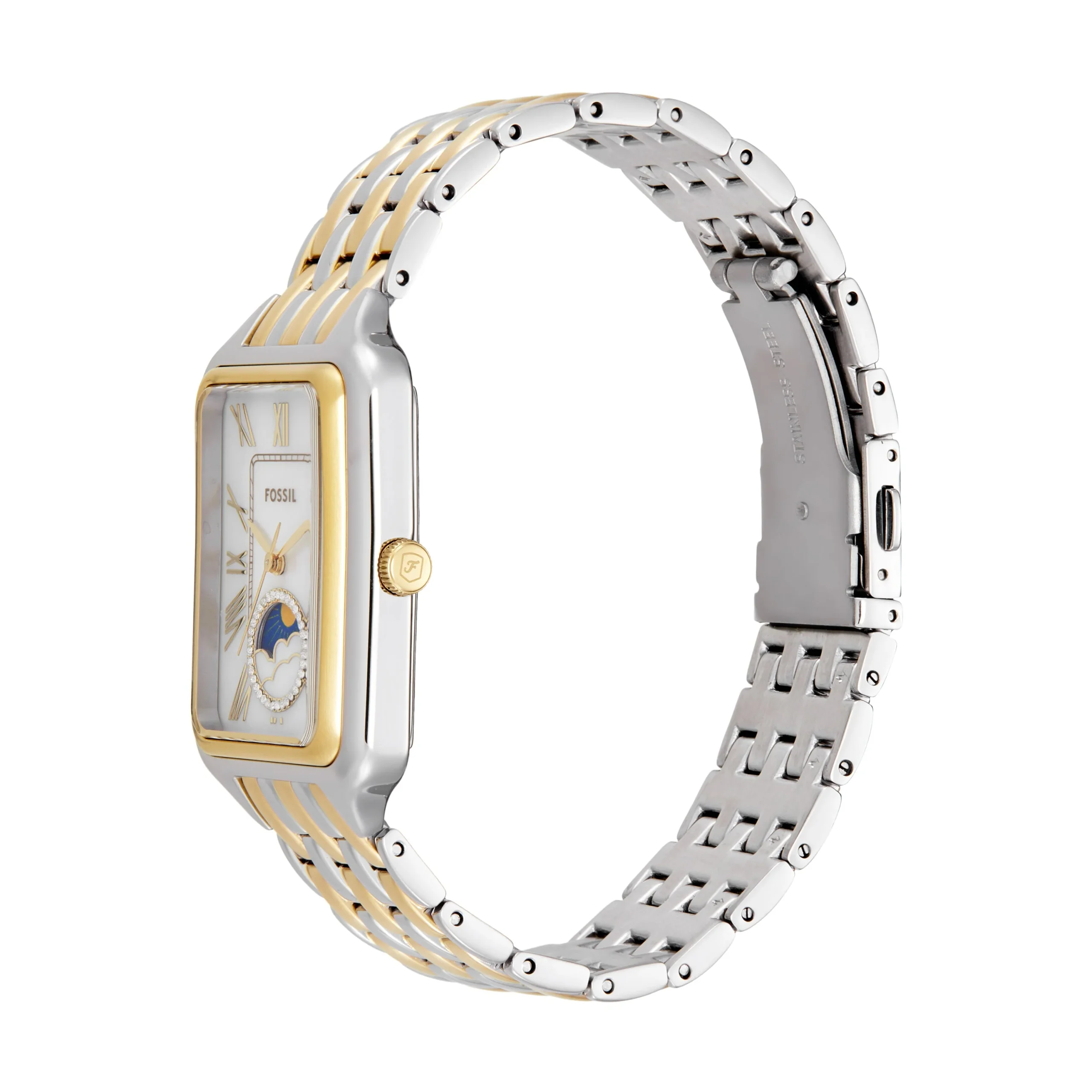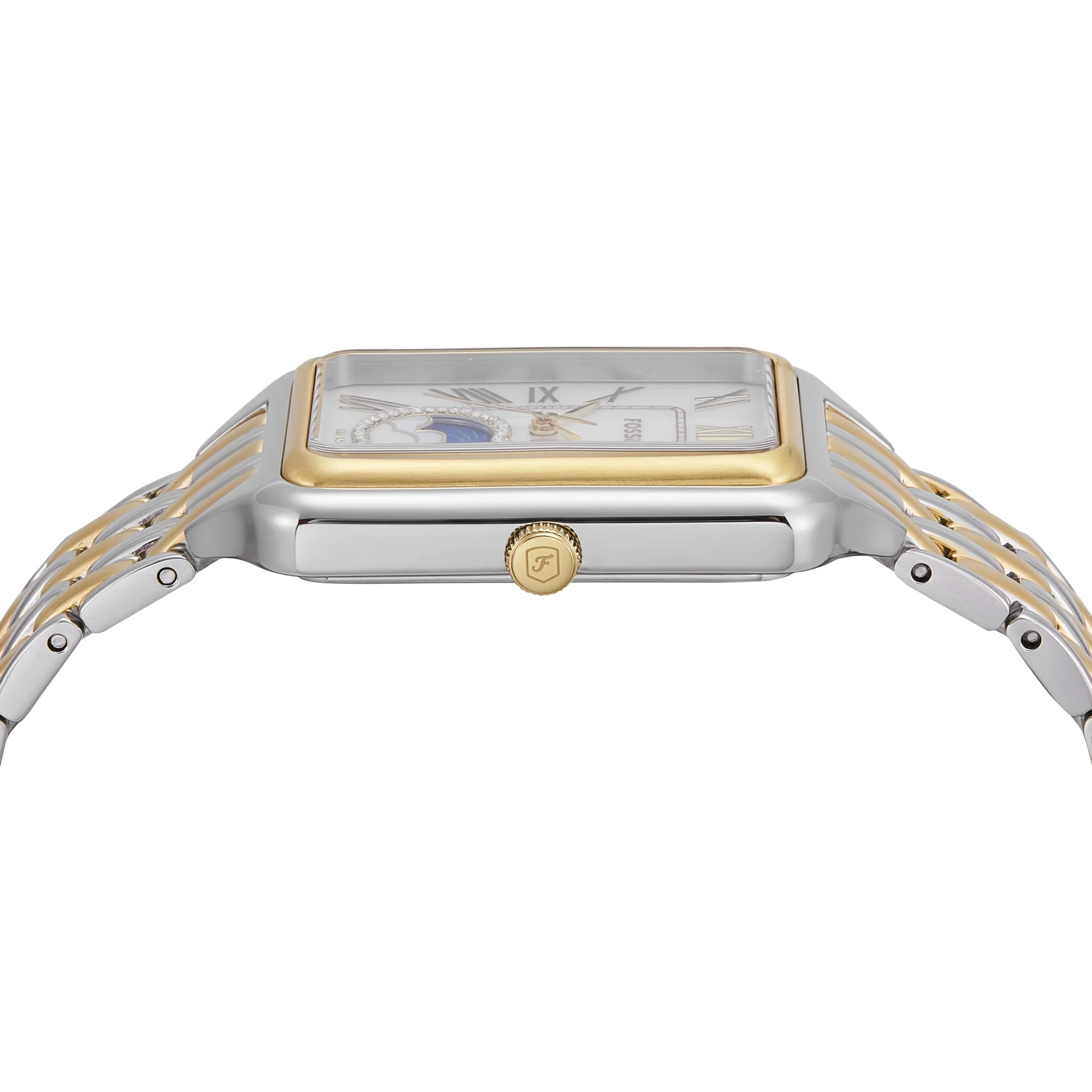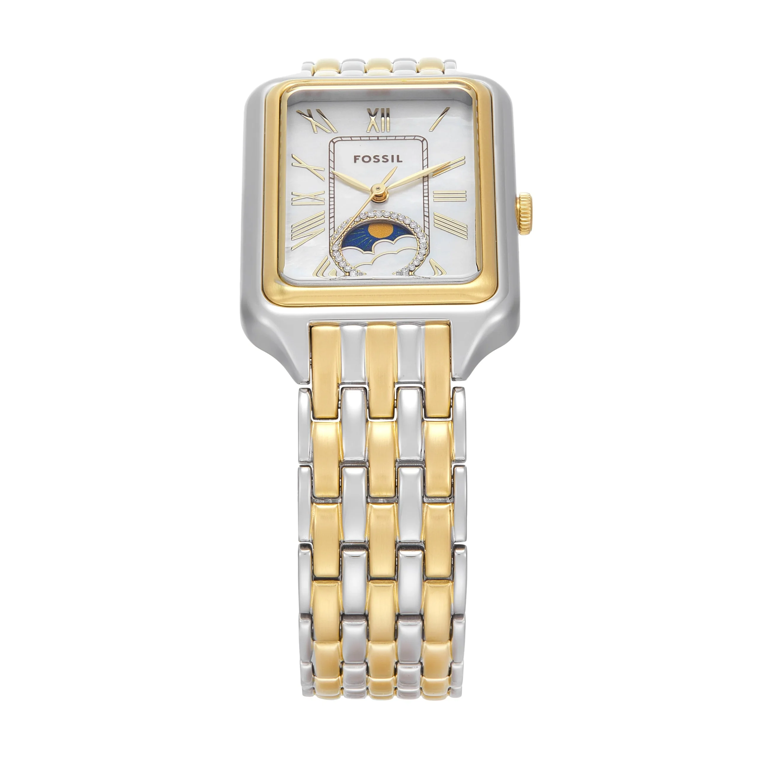 Crafted for timeless elegance, the Fossil Raquel Sun Moon Multifunction Two-Tone Stainless Steel Watch ES5399 blends vintage charm with refined modernity. Its slim 29mm rectangular case in stainless steel complements a radiant mother-of-pearl dial, where golden Roman numerals shimmer beneath mineral crystal glass. The standout sun and moon subdial adds subtle movement and day-night distinction, enhancing its poetic appeal. A two-tone silver and gold stainless steel bracelet ensures versatile sophistication, making it an ideal women’s watch for both office and evening wear. With quartz multifunction movement, 50-meter water resistance, and a double press deployant buckle, this timepiece offers both elegance and everyday practicality in the watches category.