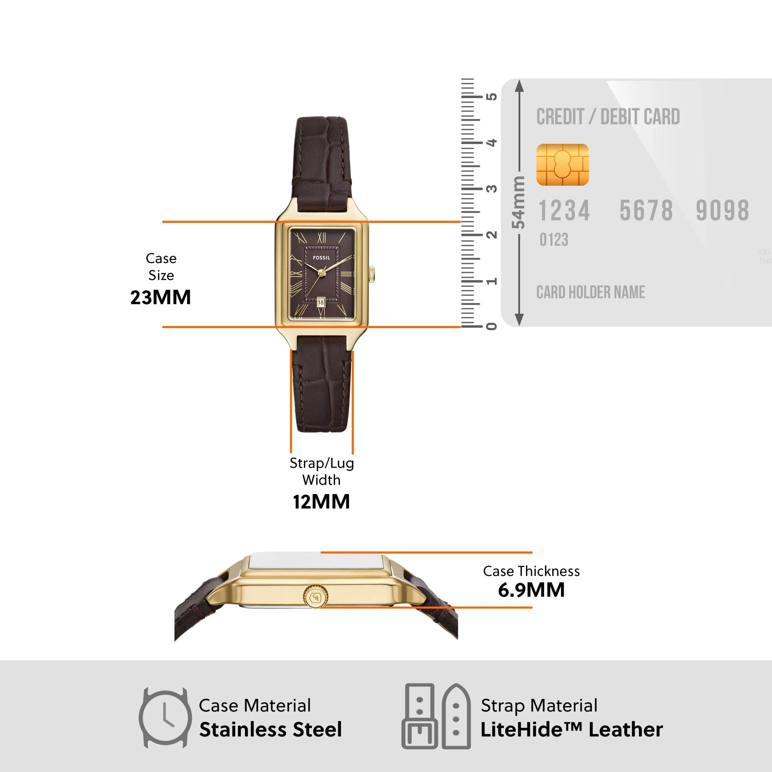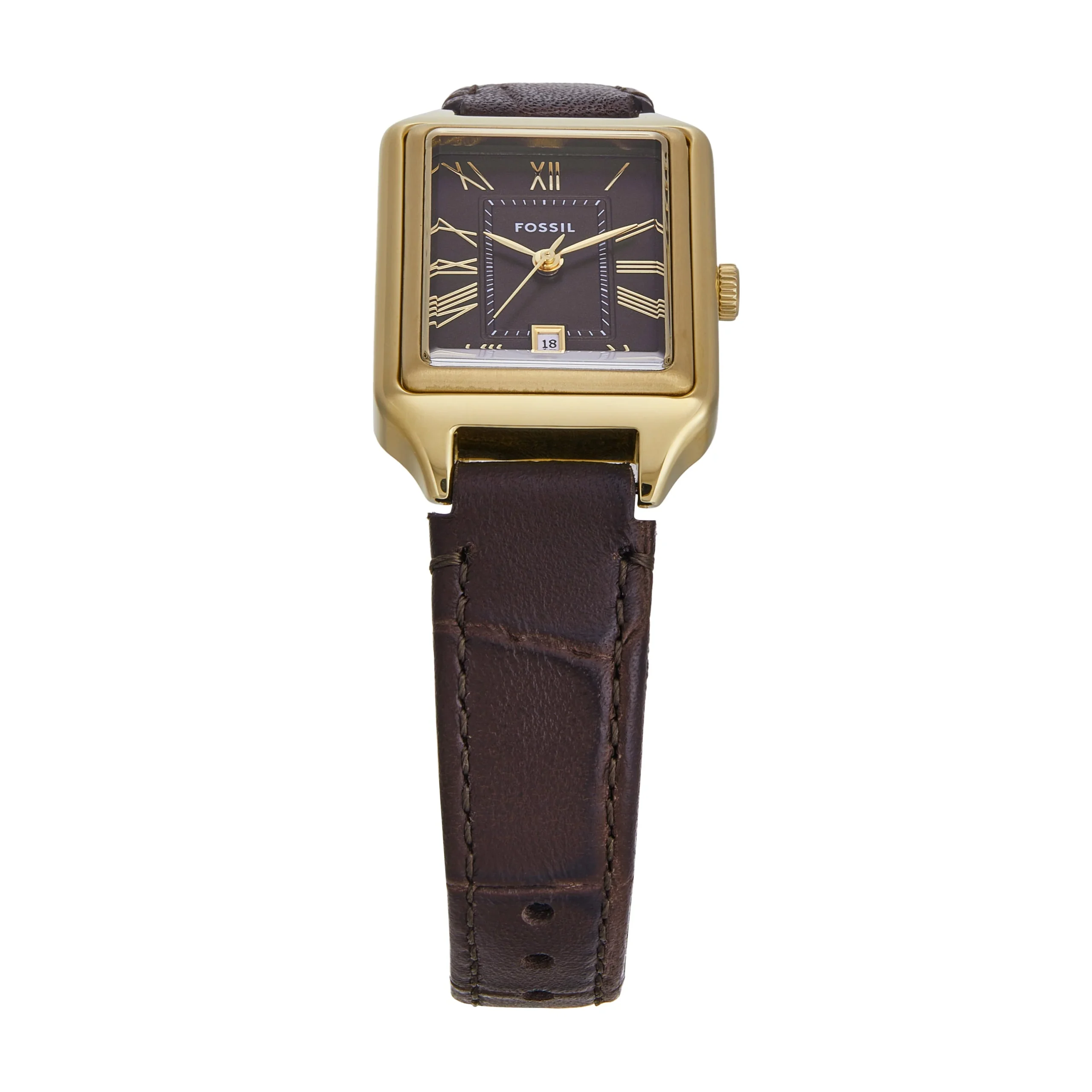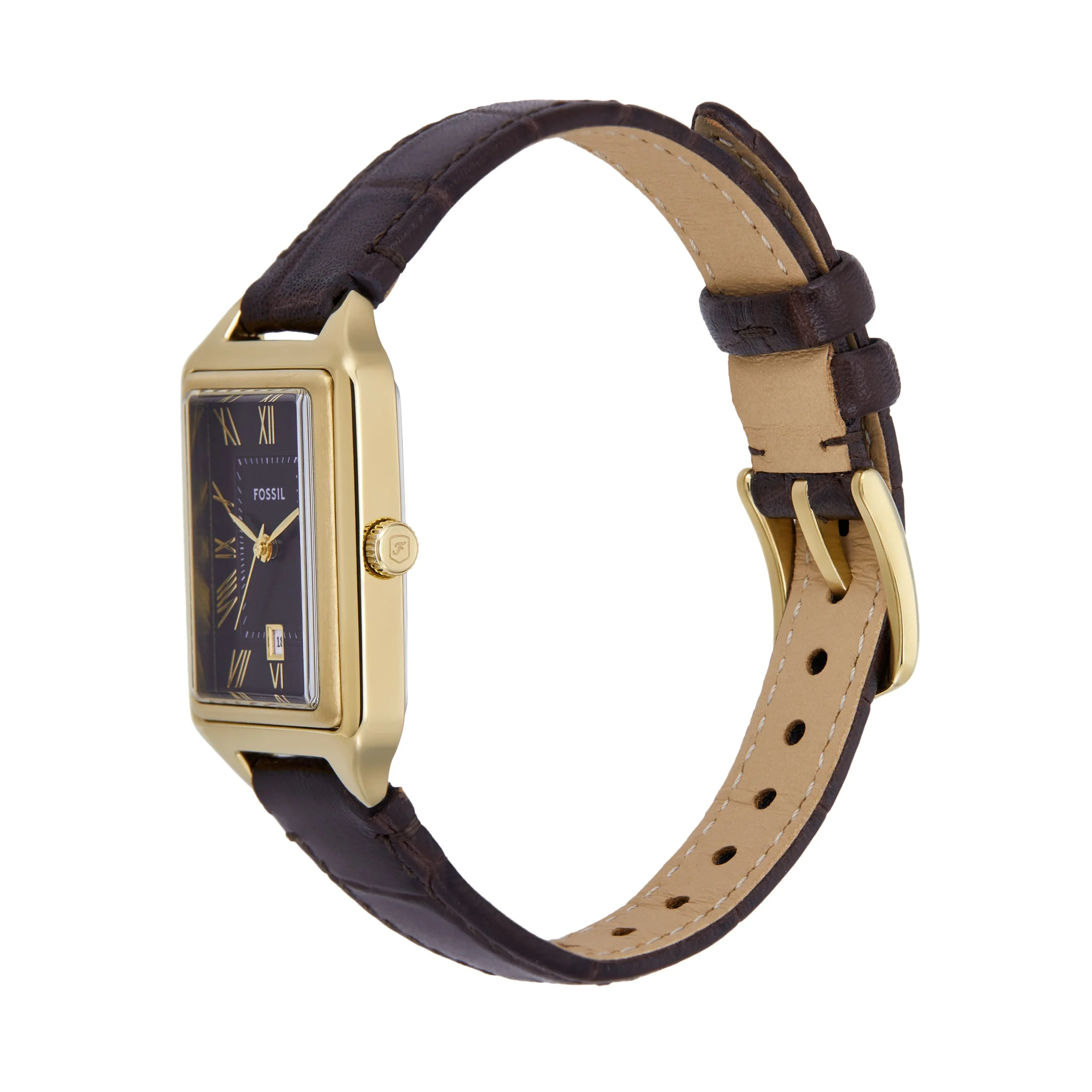 Refined in every detail, the Fossil Raquel ES5367 women’s watch combines vintage allure with modern minimalism. The rectangular 23mm gold-tone stainless steel case frames a rich brown dial, where gold Roman numerals and slim hands glide with quiet precision through quartz movement. A smooth LiteHide™ leather strap in matching brown offers both comfort and elegance, secured with a single prong buckle for a tailored fit. Protected by durable mineral crystal glass and water-resistant up to 50 meters, this timepiece suits everyday wear while maintaining its poised sophistication. A graceful essential in the women’s watch category, designed to elevate any outfit with understated charm.