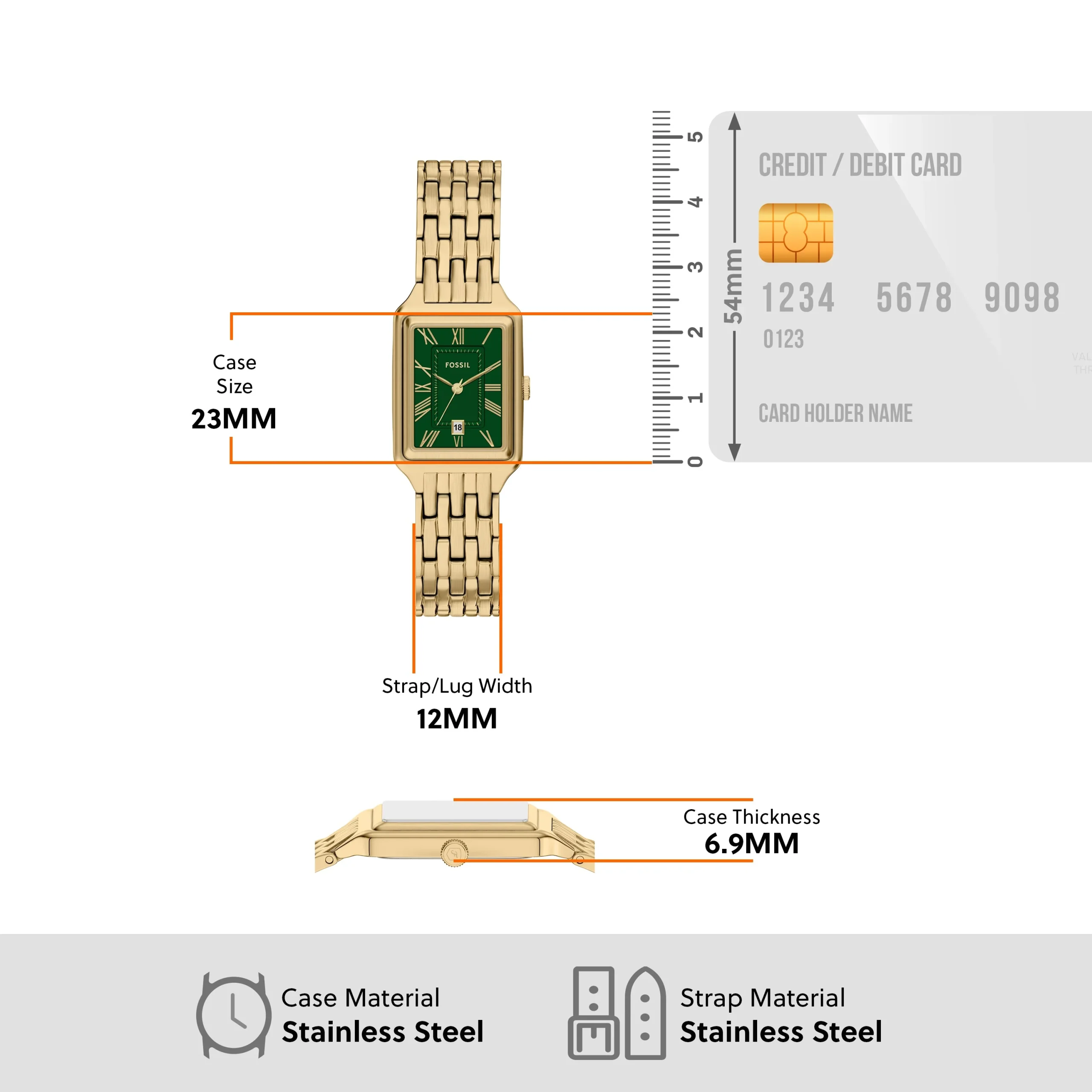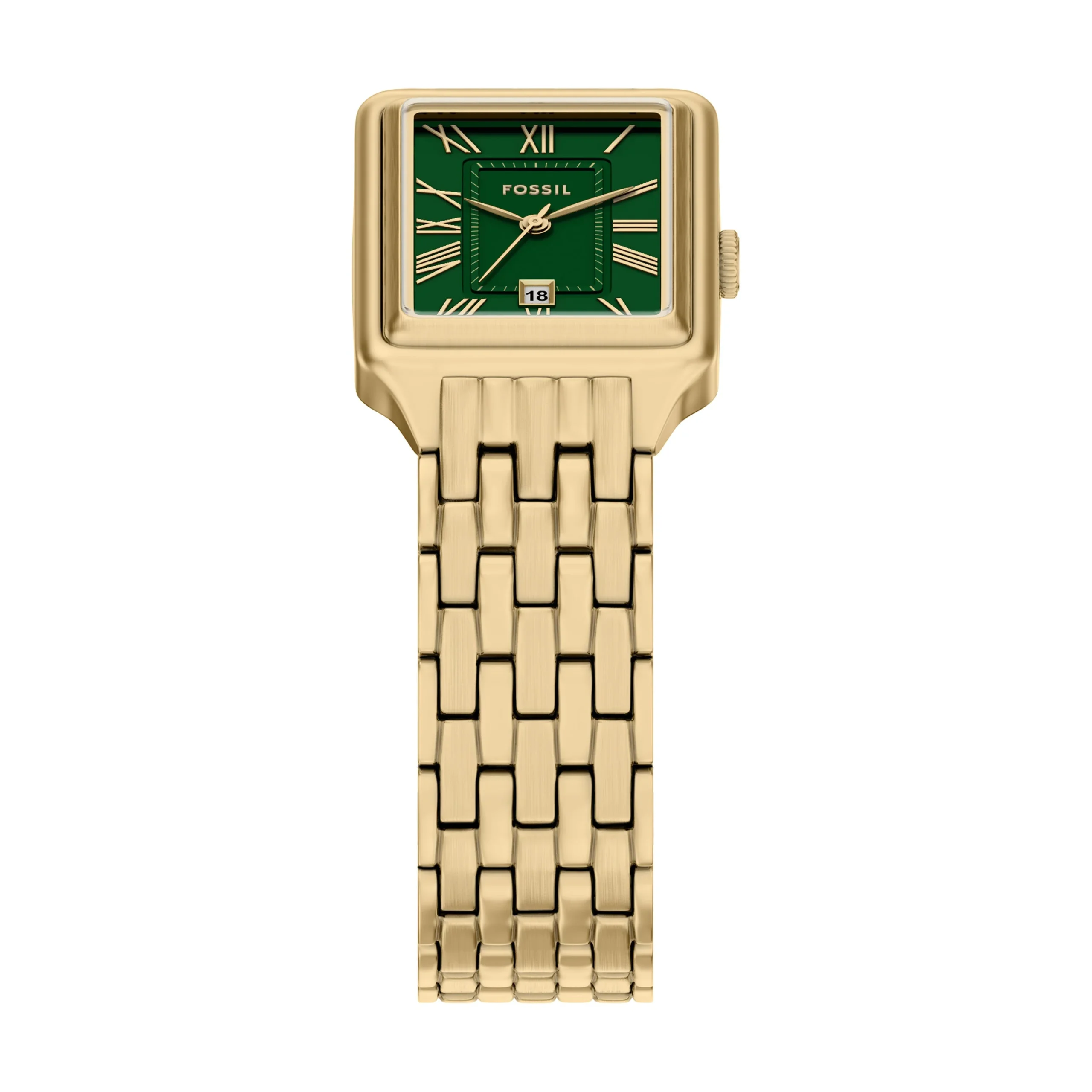 From Fossil, a brand renowned for timeless design and reliable craftsmanship, the Raquel ES5452 offers a refined everyday companion. The rectangular, gold-tone stainless steel case sits beside a matching bracelet for a cohesive, premium look. A satin green dial provides a refined pop of colour, featuring a clean three-hand display and a discreet date window. Powered by a quartz movement, this women’s watch blends precise timekeeping with effortless style. The 2.3 cm case width and proportionate bracelet create a balanced silhouette, while a two-pusher foldover clasp ensures secure wear. With 50 metres water resistance, it’s ready for daily life and understated elegance.