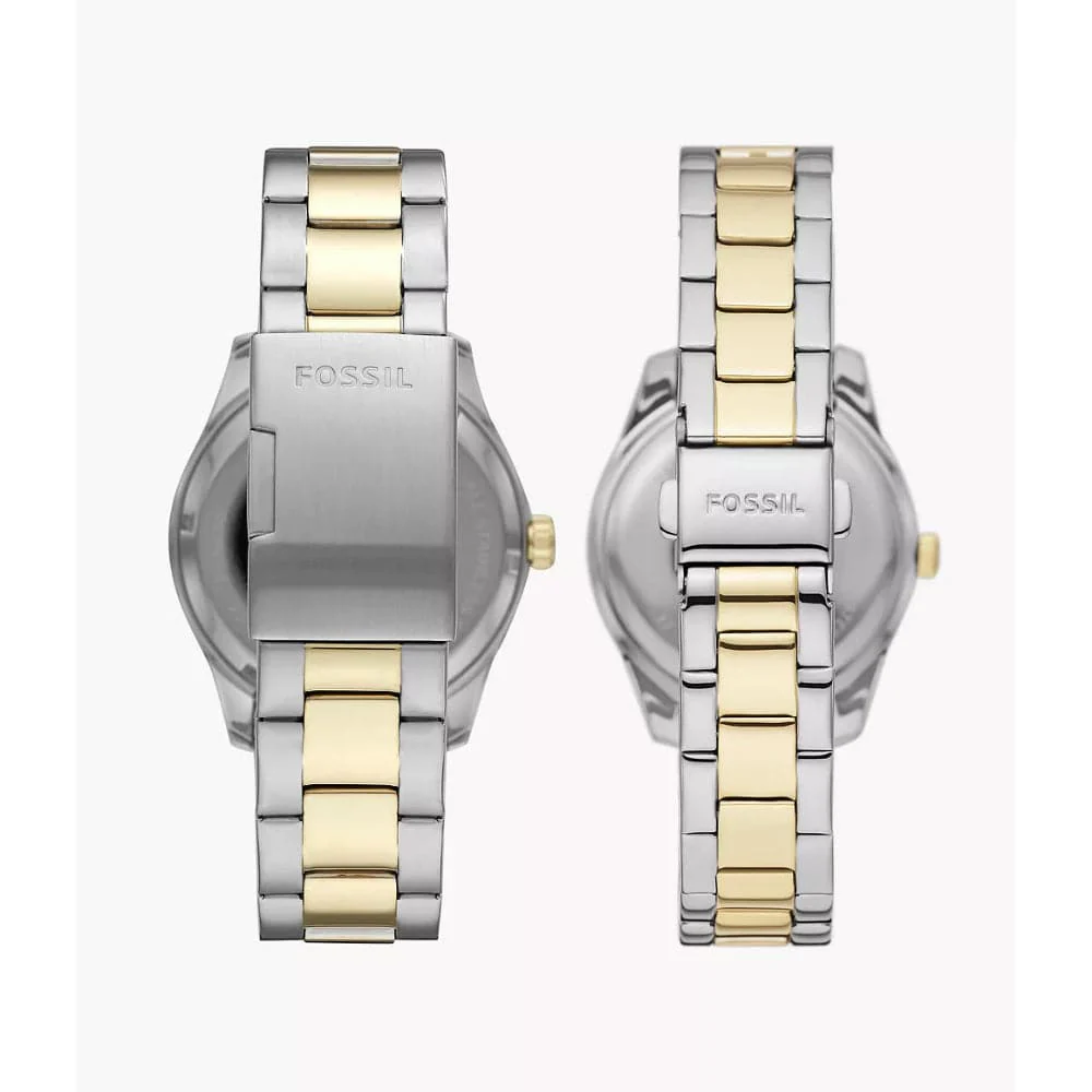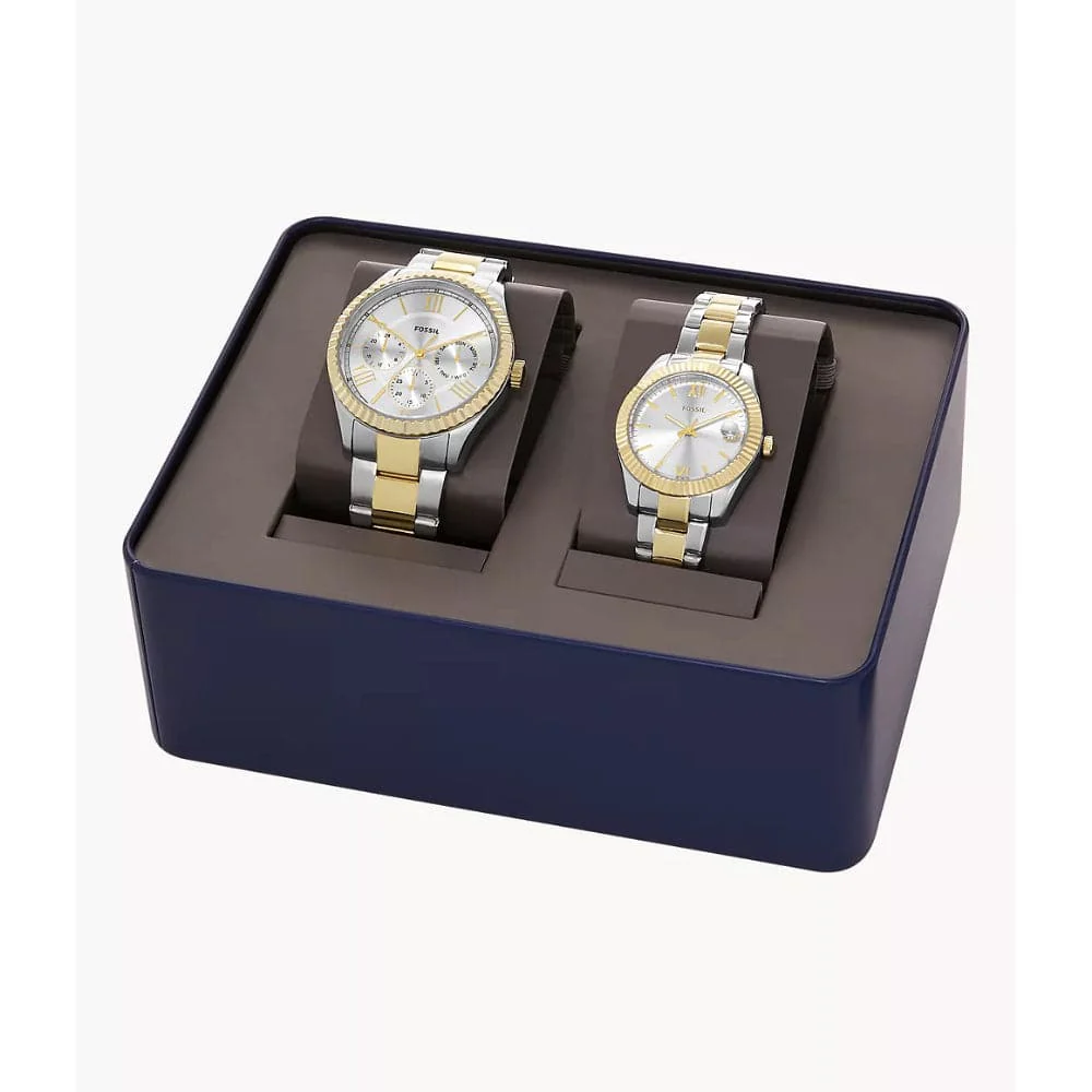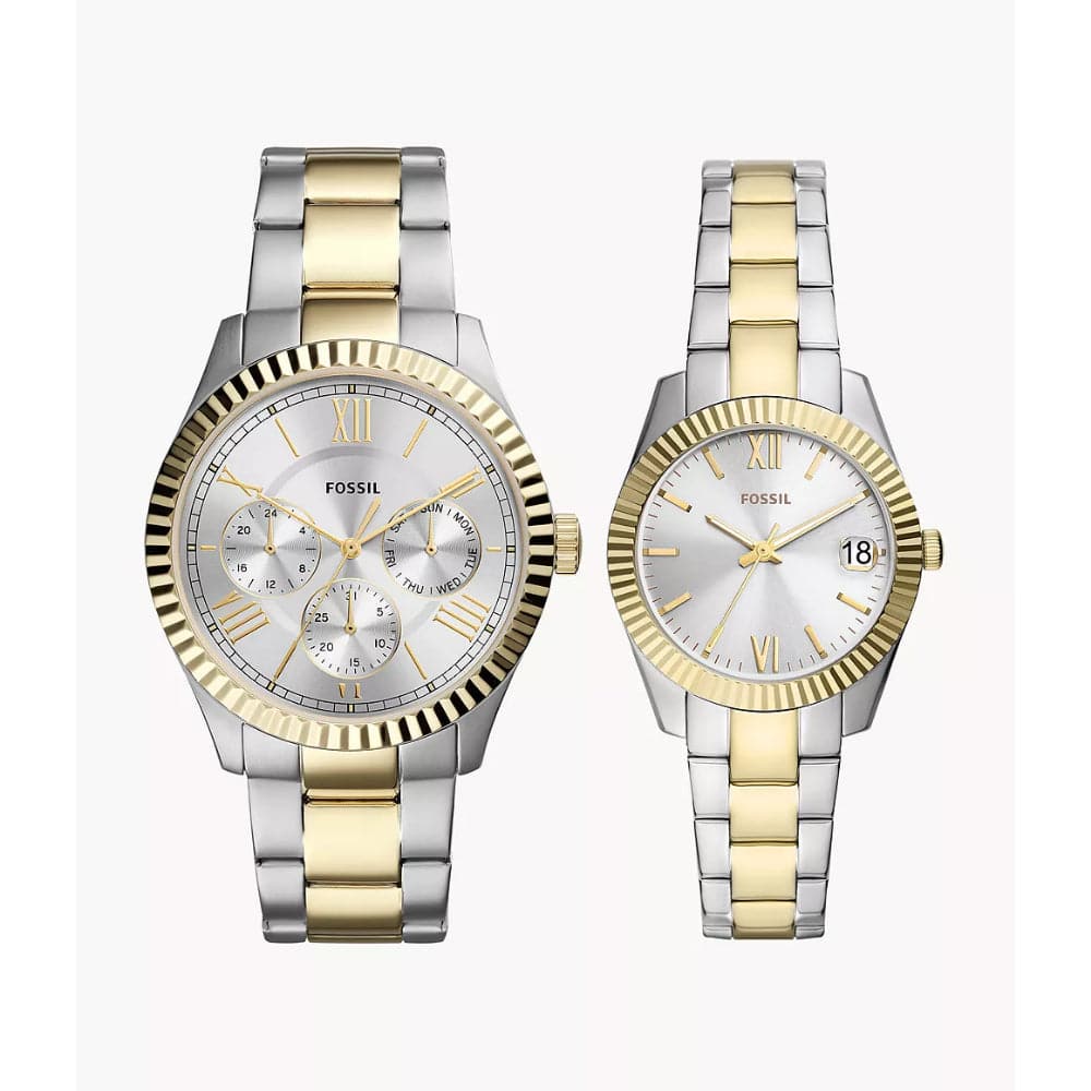This box set features a 42mm Chapman with a silver sunray dial, and multifunction movement, and a 32mm Scarlette Mini three-hand date with matching two-tone stainless-steel bracelets.