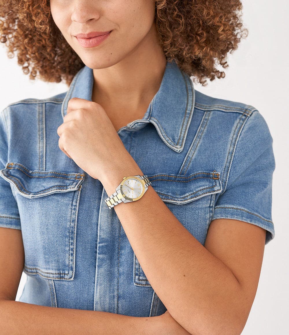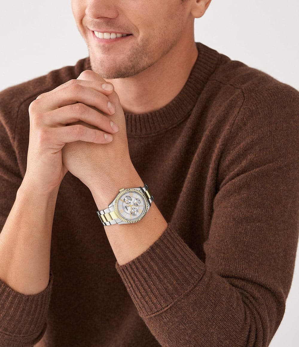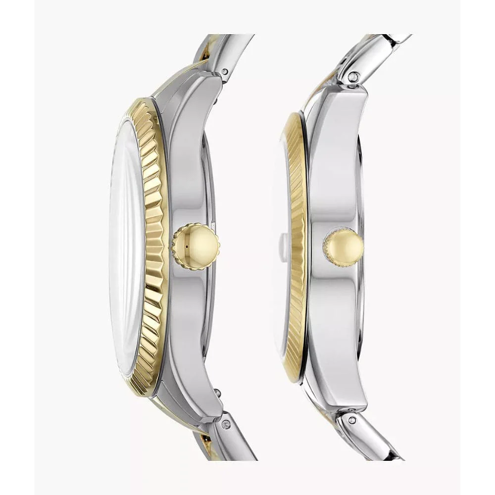 This box set features a 42mm Chapman with a silver sunray dial, and multifunction movement, and a 32mm Scarlette Mini three-hand date with matching two-tone stainless-steel bracelets.