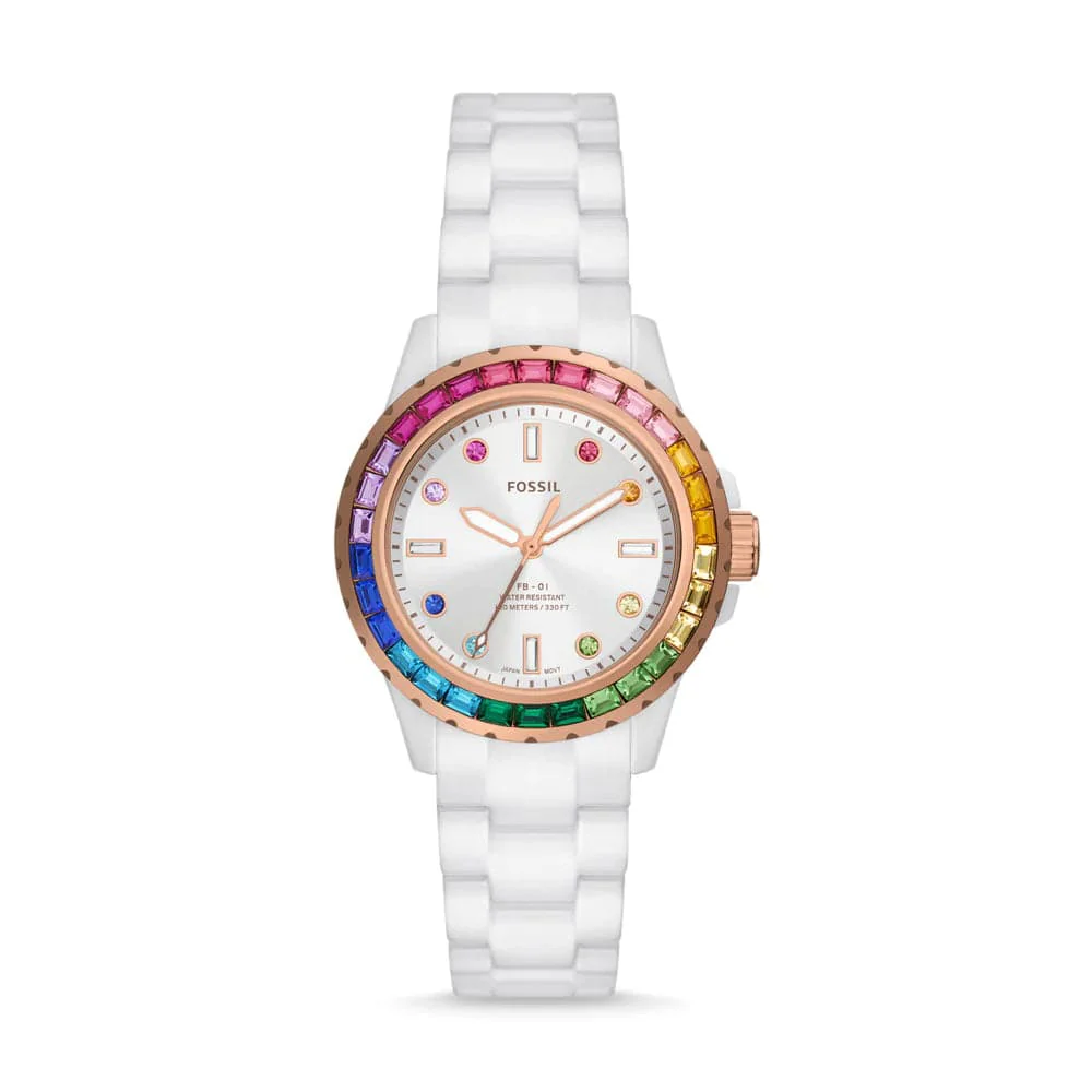 The legacy of Fossil Blue returns with this bold reinterpretation of our dive-inspired watch collection. It features a white ceramic three-link bracelet, a colorful topping and vibrant crystal indices. Ready for the season? Yes. A total statement maker? Obviously.
