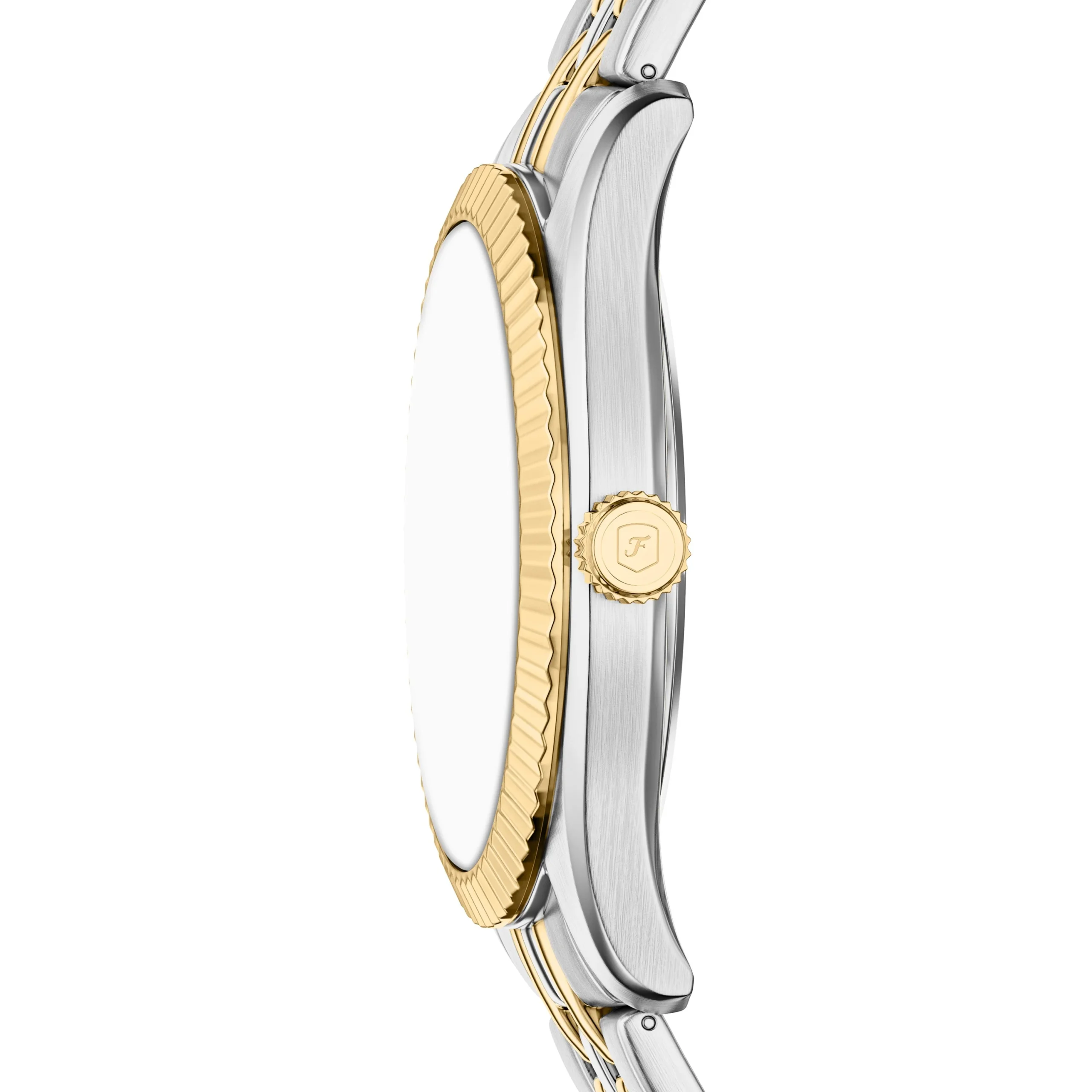 From Festina, this refined men’s watch blends a two-tone stainless steel case with a polished and brushed finish for versatile style. The 4.2 cm (42 mm) case frames a rich blue dial with a sunray finish, clear roman numerals at quarter hours, a day window at 12 o’clock, and a date window at 6 o’clock, all active under a precise quartz three-hand movement. The bracelet continues the two-tone theme with gold-tone centre links and silver-toned outer links, delivering comfortable wear and modern flair. Built for daily life with a mineral crystal and 50 metres water resistance, it offers European craftsmanship, enduring quality, and a timeless sense of sophistication.