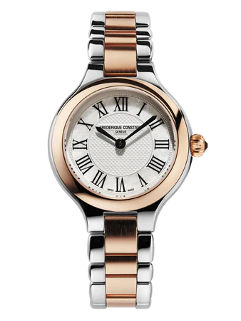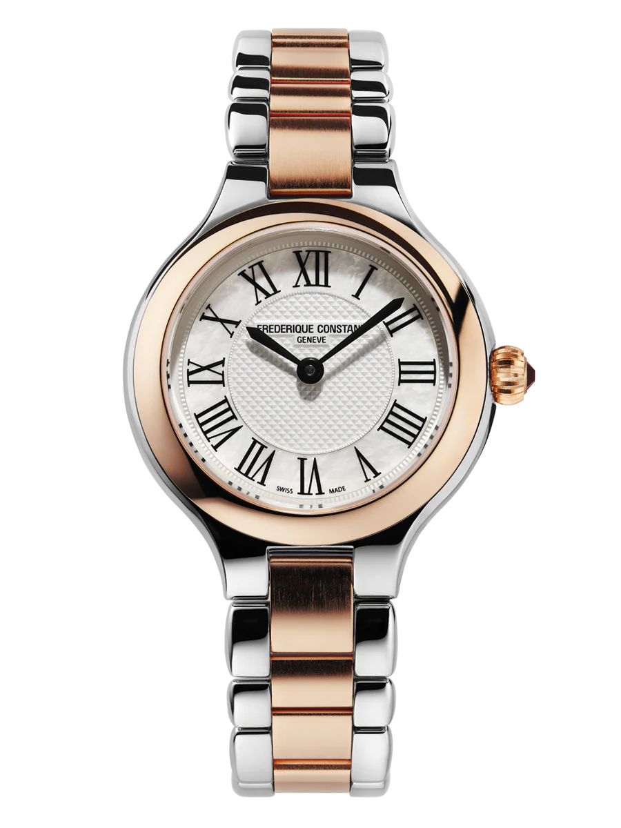 STAINLESS STEEL POLISHED 2-PARTS CASE WITH ROSE GOLD PLATED BEZEL AND CROWN. DIAMETER OF 28 MM. CONVEX SAPPHIRE CRYSTAL. WATER RESISTANT TO 3 ATM.