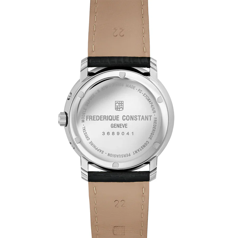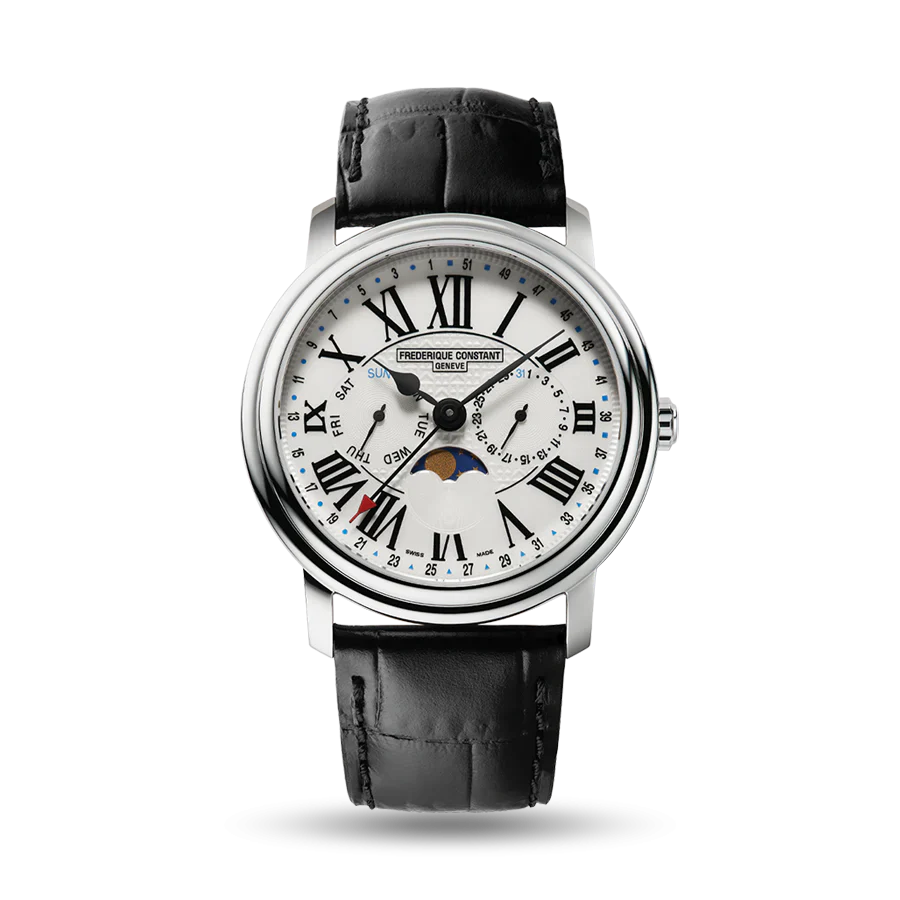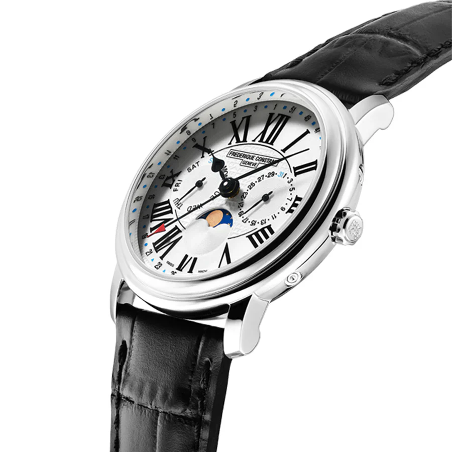Crafted for the discerning gentleman, the Frederique Constant Classics Business Timer Moonphase FC-270M4P6 is a refined expression of precision and elegance in a men’s luxury watch. Housed in a 40mm stainless steel case with a polished silhouette, it features a silver dial elegantly contrasted by a black leather band, making it a timeless choice for both business and formal occasions. Protected by durable sapphire crystal glass, this timepiece combines classic aesthetics with high functionality, offering quartz-powered accuracy, day, date, week number, and moonphase complications—all housed in an easy-to-read, premium design.