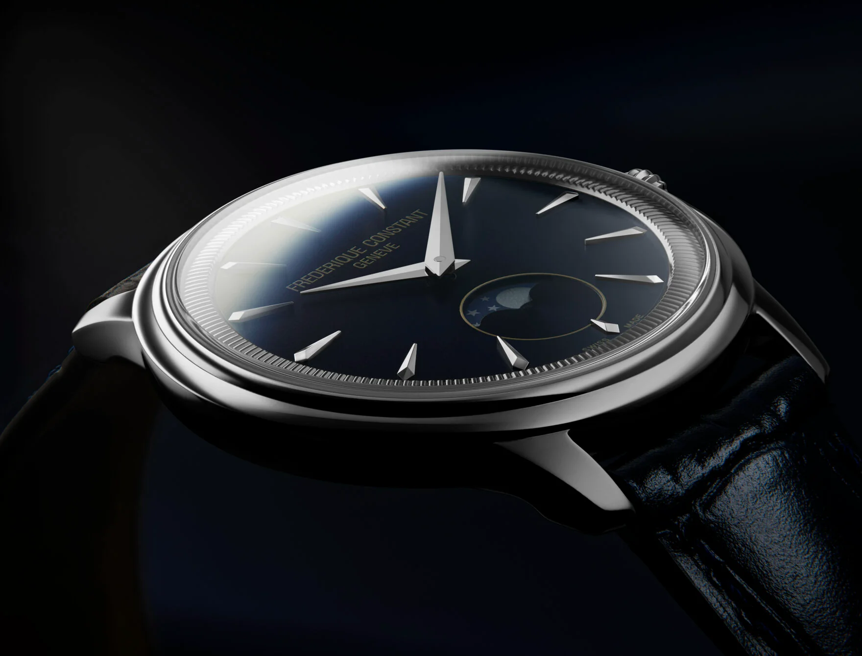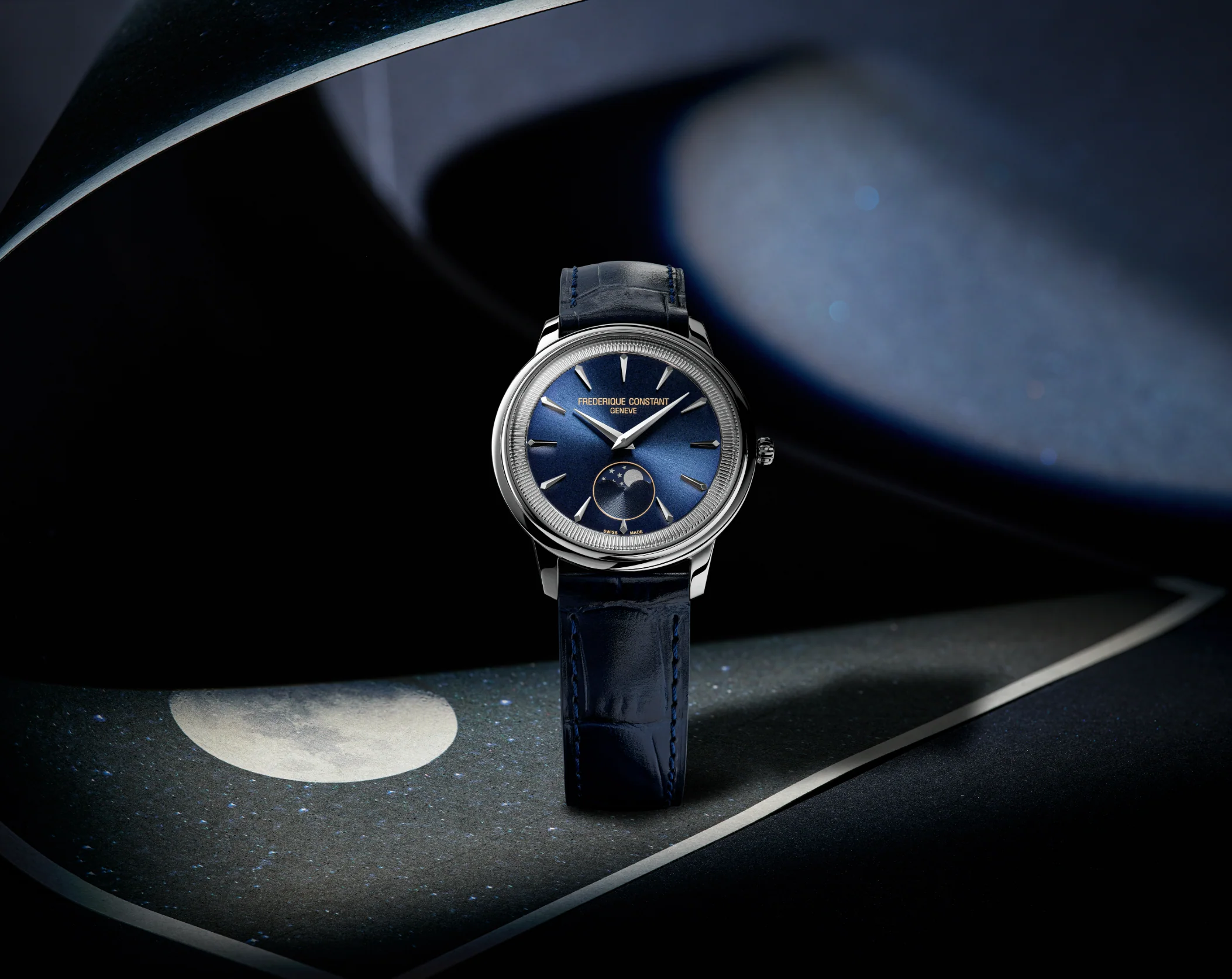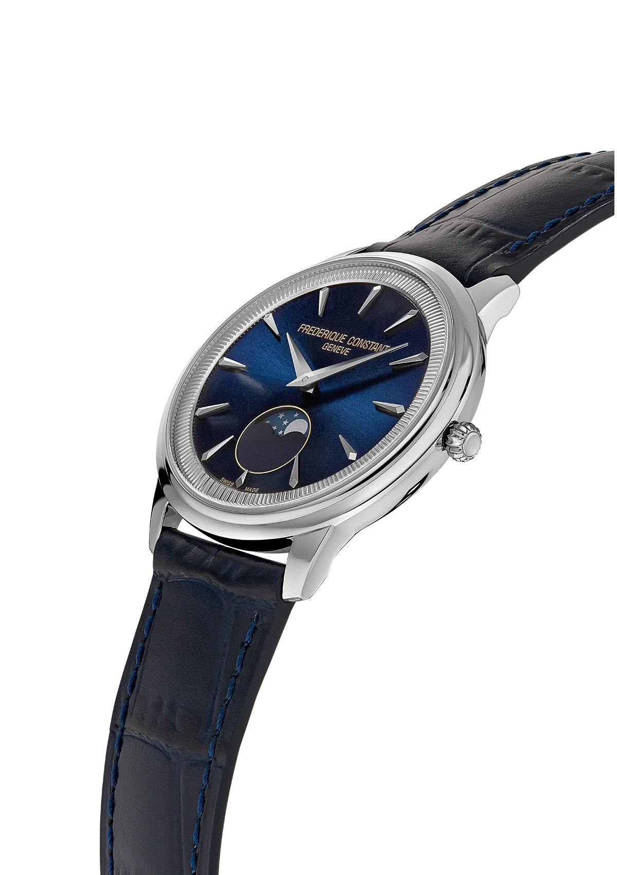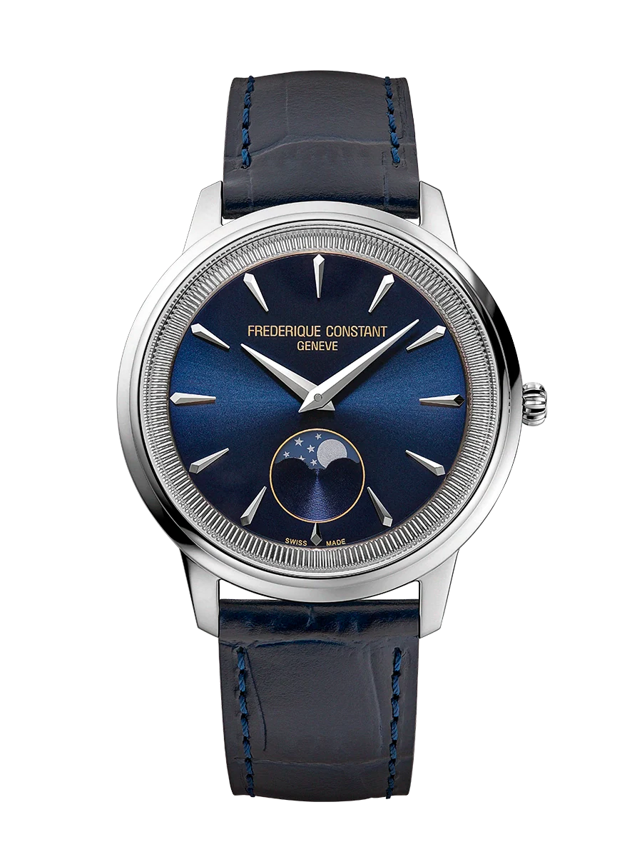 Refined and timeless, the Frederique Constant Classics Moneta Moonphase Blue FC-206N3S6 captures elegance in a sleek 37mm stainless steel case. The rich blue dial is accentuated by a beautifully detailed moon phase complication positioned at 6 o’clock, offering a poetic nod to celestial movement. Inspired by the fluted edges of classic coins, the inner bezel adds subtle texture and sophistication.