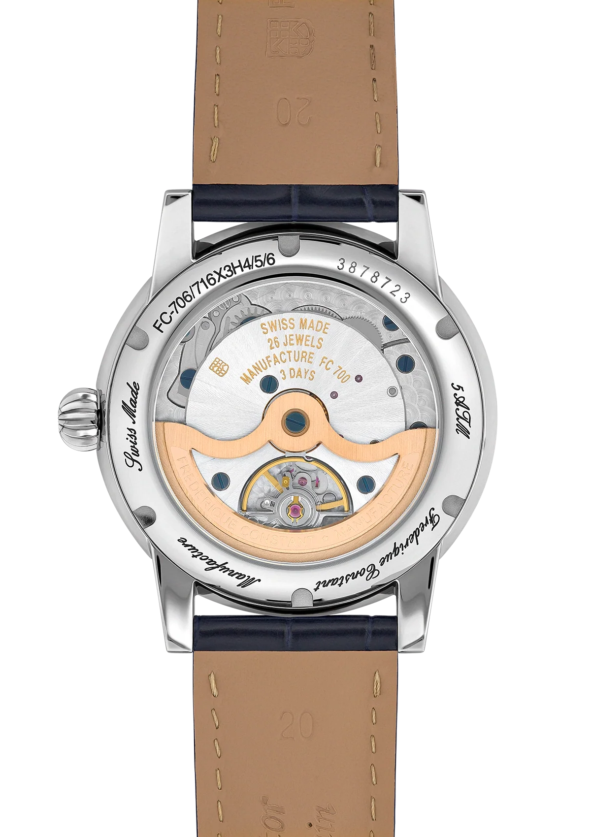 This timepieces benefits from a major movement upgrade. The legacy calibres and their 38-hour power reserve have been replaced by the new FC-706 Manufacture movement with a power reserve of 72 hours – equivalent to three whole days. The FC-706 calibre is derived from the FC-710 (a technical base that has been used to power Manufacture collections since 2012) and uses over 90% of the same components, making it exceptionally well tried and tested – and highly reliable. It beats at a rate of 4Hz.