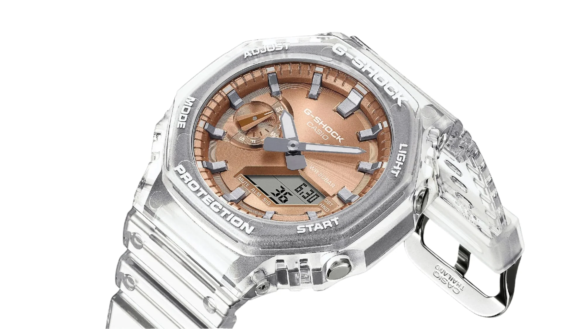 Elevate your style with the G-Shock Analog Digital 2100 Series Transparent Resin Band Watch GA2100BM-7A5, a timepiece that fuses cutting-edge design with rugged durability. This statement watch captures attention with its sleek octagonal bezel and a shimmering rose gold dial, achieved through refined metallic vapor deposition. The translucent resin band adds a modern, edgy flair, making it a standout accessory for those who appreciate bold, fashion-forward aesthetics paired with functionality.