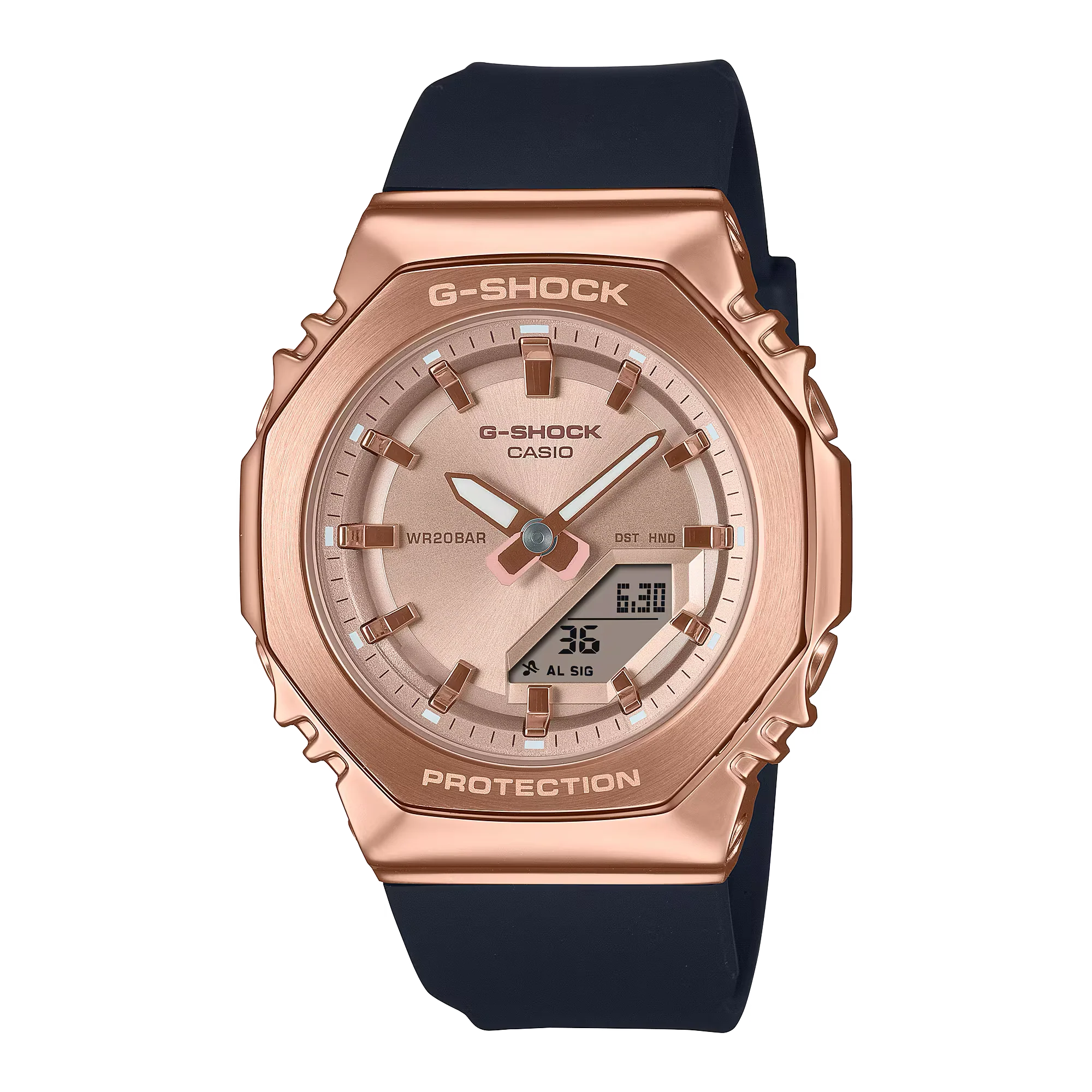 This G-Shock men’s watch fuses durable engineering with modern elegance, featuring a shock-resistant build and a bold, black bio-based resin band. The refined pink gold ion-plated bezel contrasts beautifully with the brown dial, offering a sophisticated finish suited for daily wear or formal occasions. A harmonious analog-digital display ensures quick readability, while mineral glass adds resilience. With features like world time, 200-meter water resistance, stopwatch, countdown timer, and 5 daily alarms, this timepiece balances rugged functionality and style. Designed for precision and comfort, its compact 45.9mm case and ergonomic fit make it a standout in contemporary watches.