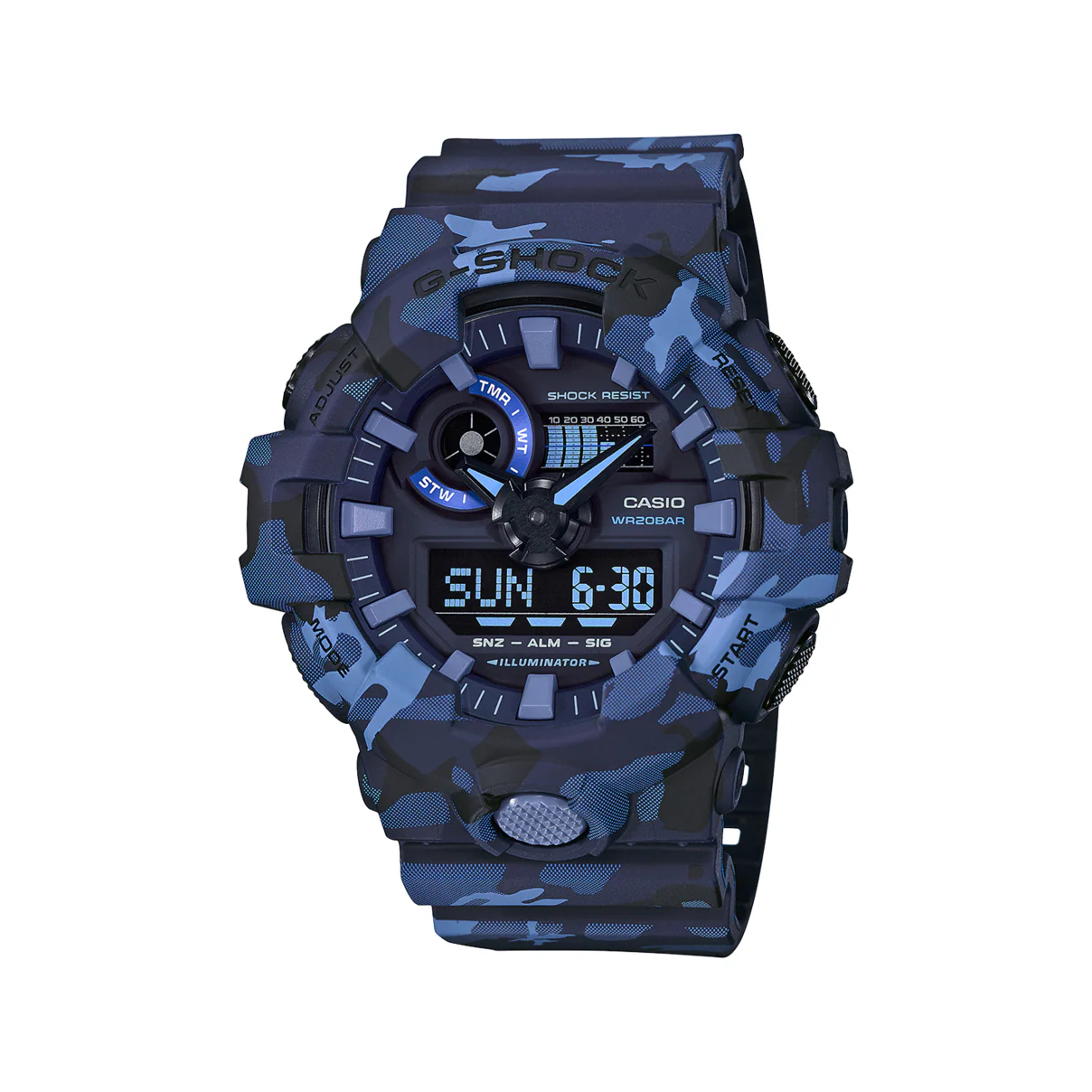 G-SHOCK is the watch brand that is always finding ways to incorporate world culture icons into exciting new designs, and these new models are themed on the camouflage patterns that are very much a part of today’s fashions. The base model is the GA-700, whose main feature is its iconic front button. The band is decorated with an authentic camouflage pattern, and the surfaces of the cases and bands are printed using technology that makes it possible to show more printed surfaces than normal, allowing a total of four colours, in addition to the base resin colour. The models of this lineup come in one of three standard colours: navy blue, khaki, and grey. Realistic camouflage patterns add a subdued touch to the GA-700 for a truly modern design.