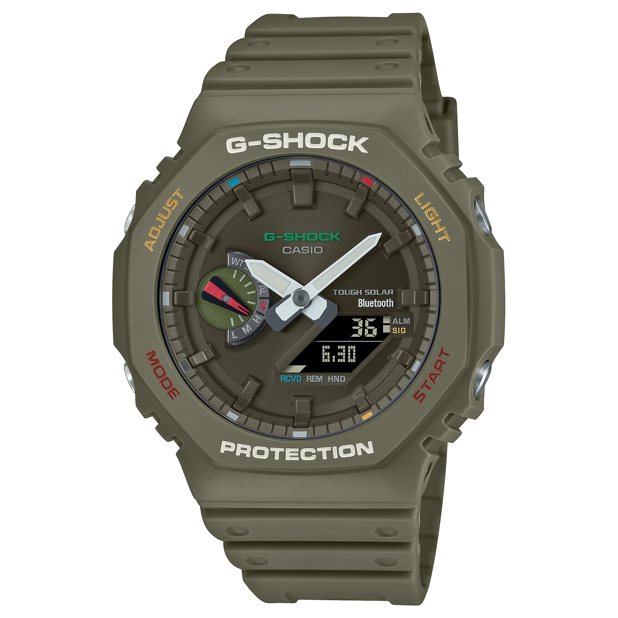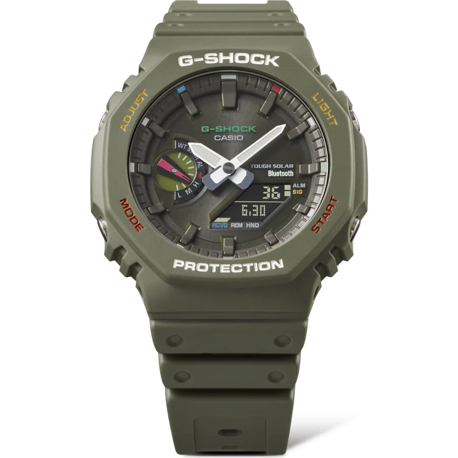 Discover the G-Shock Analog Digital DUO Green Resin Band Watch GAB2100FC-3A, a remarkable blend of ruggedness and vibrant style, designed for the modern man. This men’s watch features a durable carbon core guard structure and a striking octagonal case measuring 48.5mm, making it both stylish and functional. The bold green resin band enhances comfort while offering exceptional durability, perfect for outdoor activities. With its advanced Tough Solar technology, this watch ensures you stay powered without the hassle of battery changes. Enjoy features like smartphone connectivity, 200-meter water resistance, and a multitude of alarms, making it an ideal companion for any adventure. Elevate your wrist game with this unique piece that harmonizes fun and functionality.