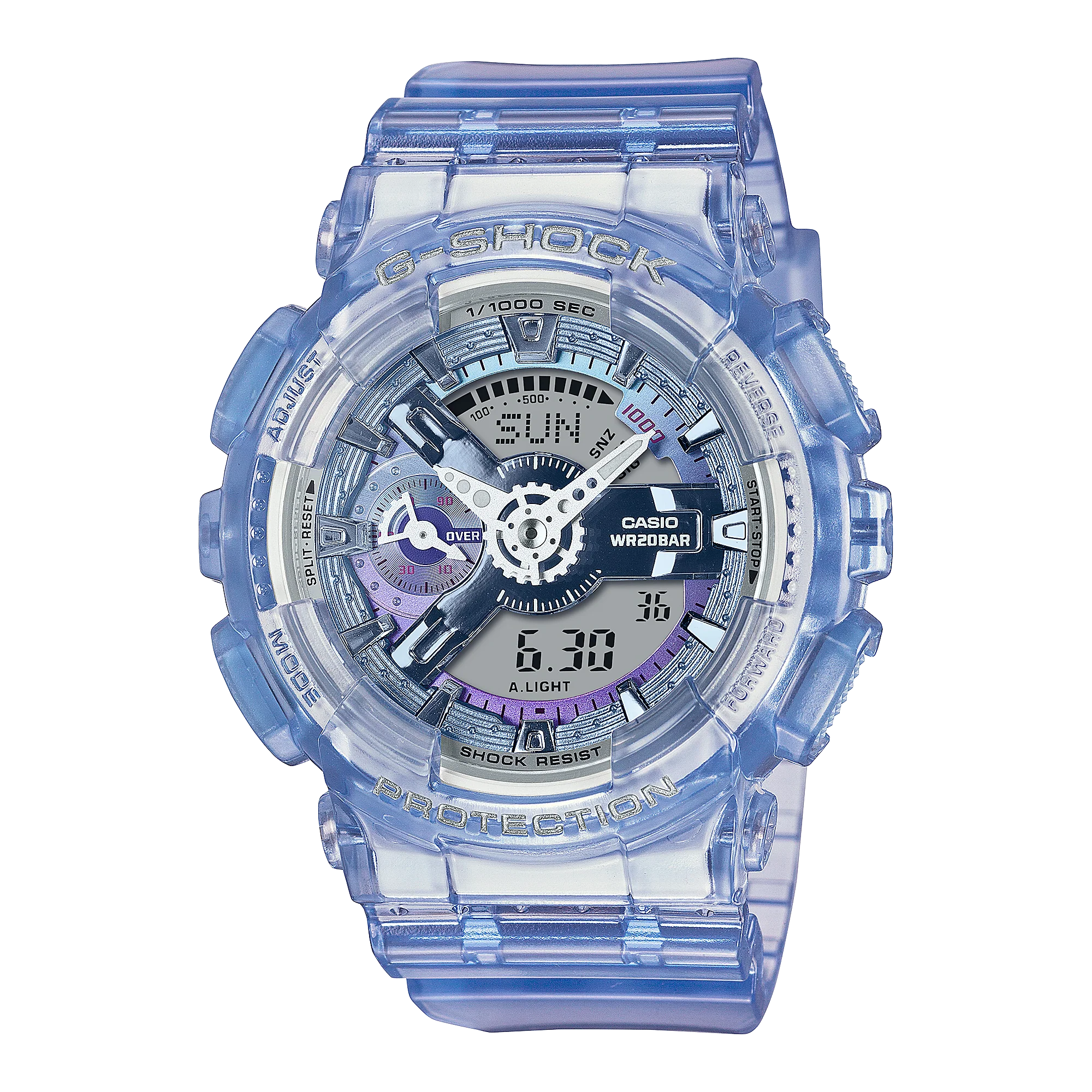 Elevate your everyday with the G-Shock Analog Digital Mid DUO Virtual World Watch GMAS110VW-6A, a striking women’s watch that merges futuristic design with functional sophistication. Crafted from durable translucent resin, its bold 49mm case features a dimensional dial enhanced by a vapor deposition finish, creating an engaging play of light and depth. Designed for slimmer wrists, this piece offers a comfortable, sleek fit while housing high-performance features like shock and magnetic resistance, world time across 29 zones, a 1/1000-second stopwatch, and 200-meter water resistance. Mineral crystal glass protects a multi-layered display powered by reliable quartz movement, ensuring precision and resilience. The blend of innovation and style makes this an exceptional choice in the watches category for those who value both aesthetics and advanced functionality.