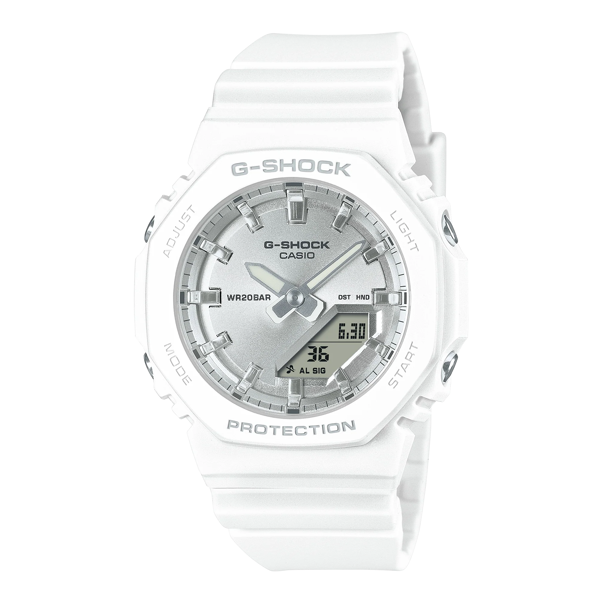Combining rugged engineering with minimalist appeal, the G-Shock Analog Digital White Resin Band Watch GMA-P2100VA-7A is a refined statement piece designed for modern lifestyles. Crafted with a sleek 46mm resin and bio-based case, it features a silver dial framed by a bold white resin band for a clean, contemporary look. Designed for women who value durability and style, this analog digital timepiece offers world time across 31 zones, 5 daily alarms, and a full auto-calendar extending to 2099—ideal for daily wear or travel.