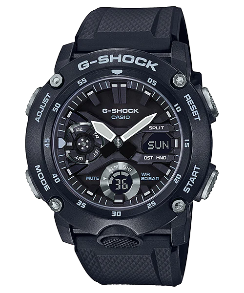Combining rugged resilience with sharp sophistication, the G-Shock GA2000S-1A men’s watch features a carbon core guard structure encased in carbon and resin for exceptional durability. The black resin band and mineral glass offer a sleek, sport-inspired silhouette, while the multidimensional face is set off by a bold front button and luminous accents. Engineered for performance, it includes a super illuminator double LED light, 200-meter water resistance, world time, stopwatch, countdown timer, and five daily alarms. Designed for dynamic lifestyles, this quartz movement timepiece blends toughness with modern design, making it a standout in the sport watch category.