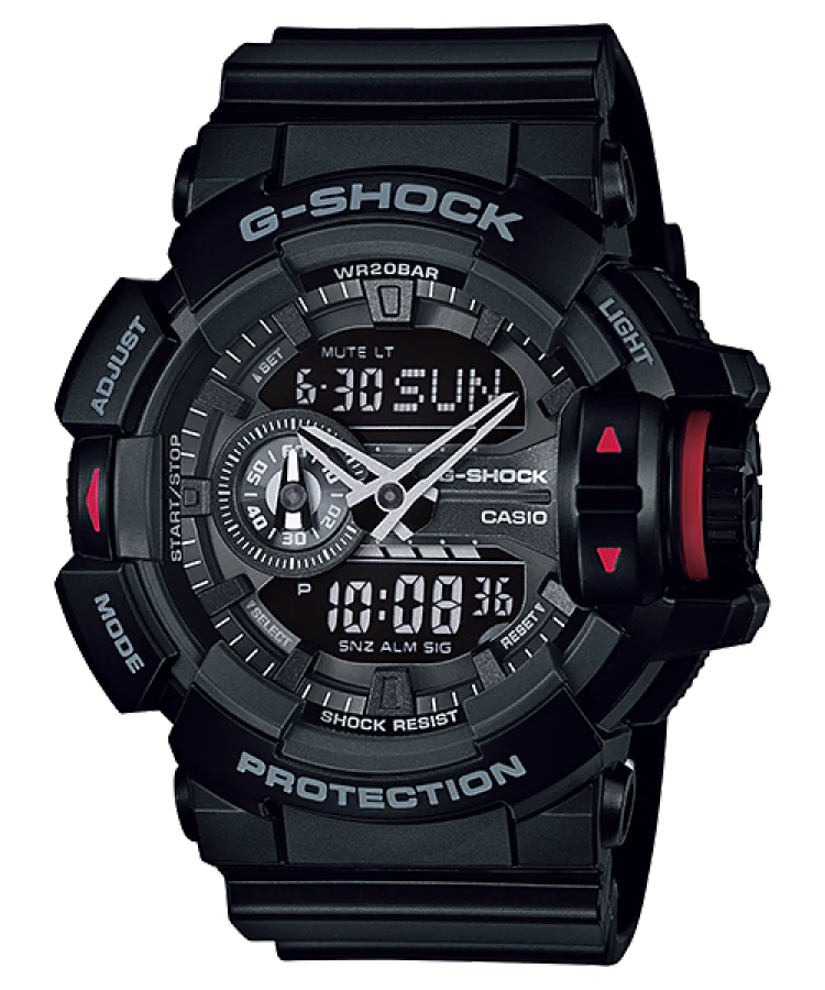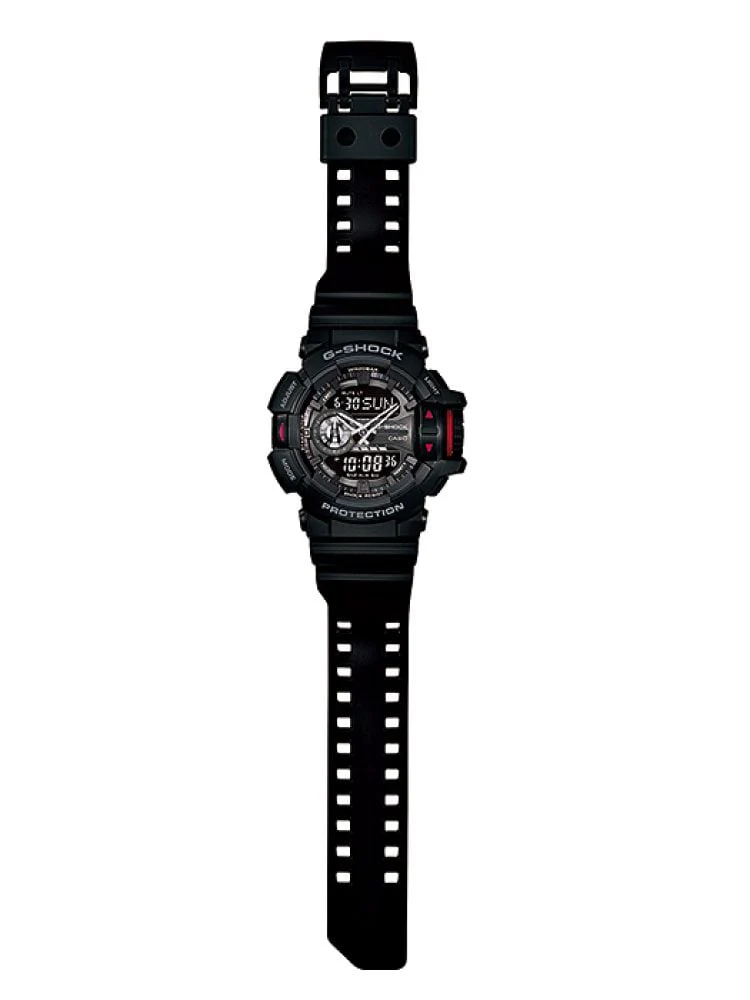 Discover the robust elegance of the G-Shock Casio Analog Digital Watch GA400-1B, a remarkable addition to the world of men’s watches. This striking timepiece features a dynamic black and red design, perfectly complemented by a durable resin band. Engineered for toughness, the watch offers an intuitive large rotary switch for effortless operation, allowing quick access to features like world time and timers. With a water resistance of up to 200 meters and shock resistance, it stands out as an ideal companion for any adventure. The mineral crystal glass ensures durability, while the quartz movement guarantees precise timekeeping. Elevate your style with a watch that blends functionality and contemporary design seamlessly.