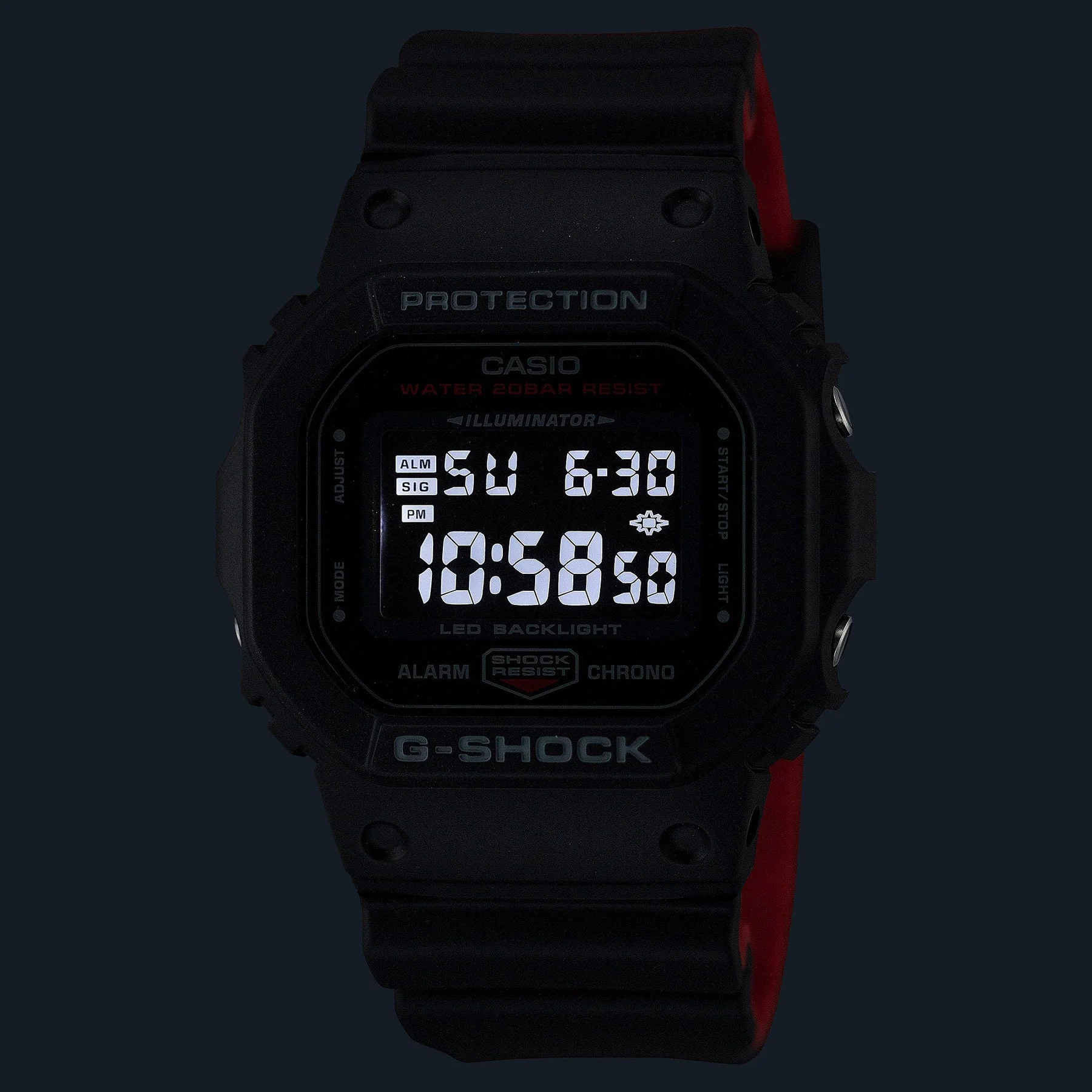 Engineered for resilience and bold design, the G-Shock DW5600UHR-1D men’s watch exemplifies the brand’s signature toughness with a sleek black digital dial and a bi-color resin band that reveals a striking red interior. Built with a shock-resistant resin case and durable mineral glass, it offers 200-meter water resistance, making it ideal for active lifestyles. Precision quartz movement ensures reliable timekeeping, while features such as a 1/100-second stopwatch, multi-function alarm, world time, and full auto-calendar enhance everyday functionality. The LED backlight with afterglow and 12/24-hour format complete its modern utility. As part of the Black & Red Series, this piece stands out in the watches category with its rugged aesthetic and iconic DW-5600 design.