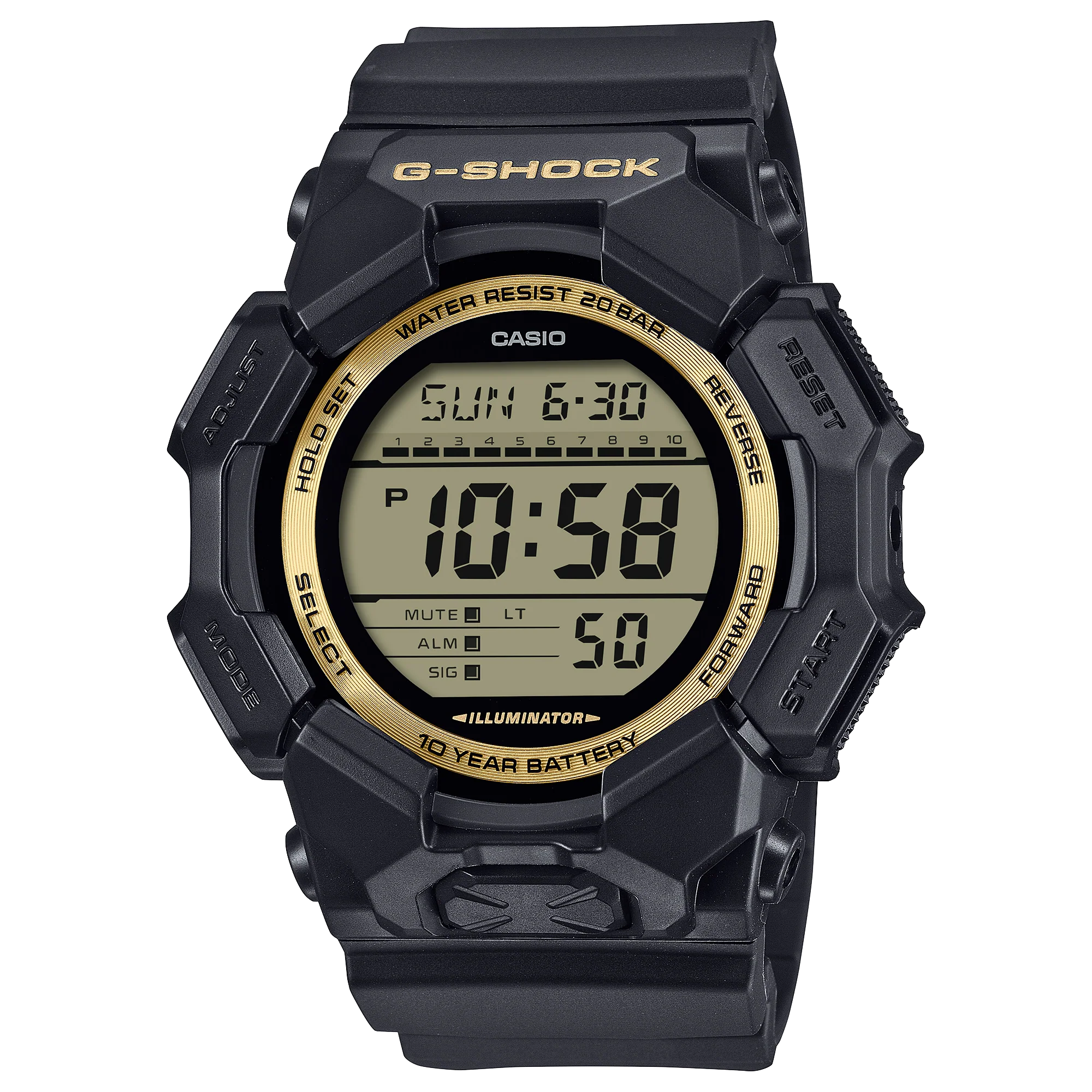 This men’s watch from G-Shock blends rugged performance with striking design, featuring a resilient black resin band and a bold gold-tone digital dial. Built to last, its quartz movement is supported by a 10-year battery for long-term reliability. The large 54.9mm case highlights its powerful presence, while practical functions such as world time, stopwatch, and a bright LED backlight offer everyday versatility. Finished with a mineral crystal and 200 meters of water resistance, this timepiece is engineered for durability without compromising style.