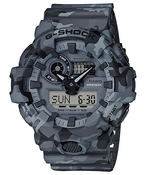 The band is decorated with an authentic camouflage pattern, and the surfaces of the cases and bands are printed using technology that makes it possible to show more printed surfaces than normal, allowing a total of four colours, in addition to the base resin colour. The models of this lineup come in one of three standard colours: navy blue, khaki, and grey. Realistic camouflage patterns add a subdued touch to the GA-700 for a truly modern design.