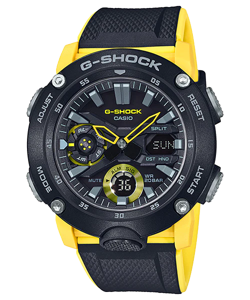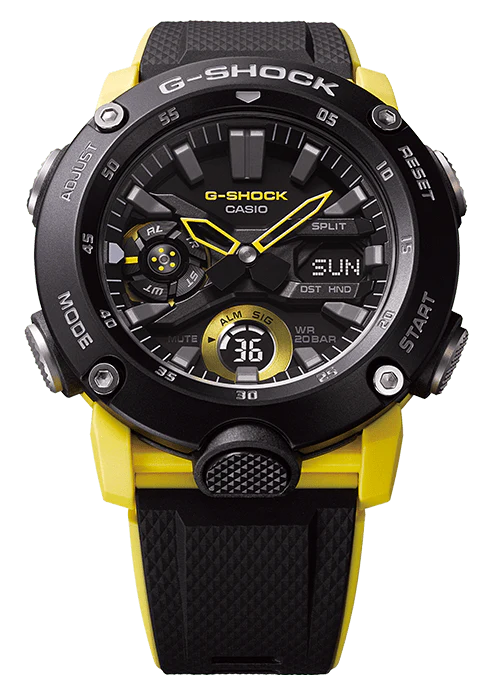 Embodying both strength and style, the G Shock DUO Carbon Core Black and Yellow Men’s Watch GA2000-1A9 sets itself apart with a bold outdoor aesthetic and cutting-edge engineering. Crafted with a carbon core guard structure and refined resin band, this men’s watch is both lightweight and remarkably robust, protecting its precision quartz movement from impact. Its striking 3D dial, accented by yellow details, sits beneath durable mineral glass and features clear digital and analogue displays. Sized at 5.12 × 4.7 × 1.41 cm and weighing only 64 grams, it offers water resistance up to 200 metres. Built for versatility, this sport watch includes world time, stopwatch, five daily alarms, super illuminator LED lighting, and a full auto-calendar—combining reliable function with signature G-Shock style.