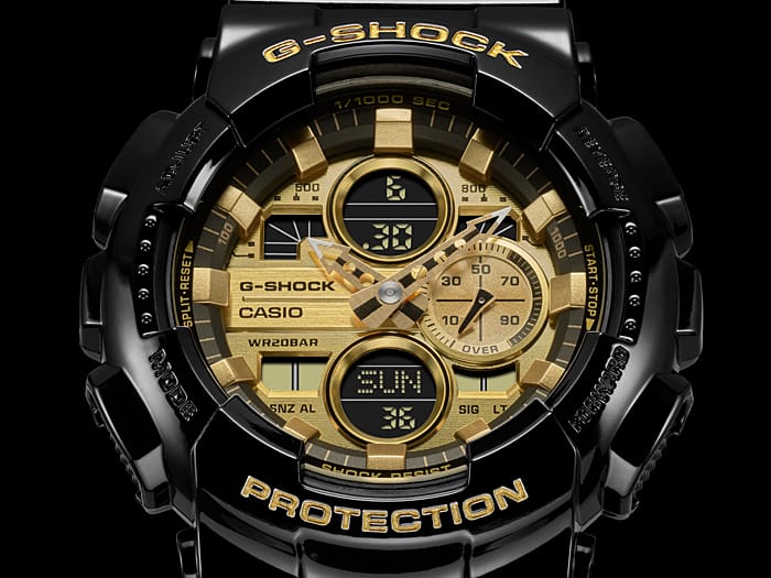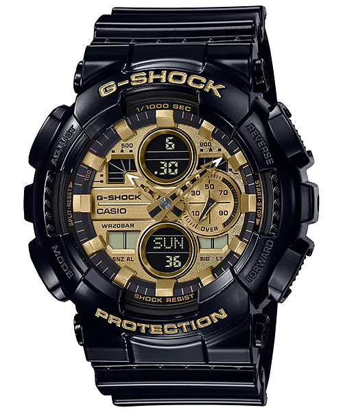 The G-Shock DUO Metallic Series GA140GB-1A1 is a bold men’s watch crafted for those who value durability and urban sophistication. Featuring a glossy black resin case with striking gold accents, this analog-digital timepiece blends rugged performance with street-ready style. Designed with shock and magnetic resistance, 200-meter water resistance, and a mineral glass face, it delivers exceptional resilience for everyday wear.